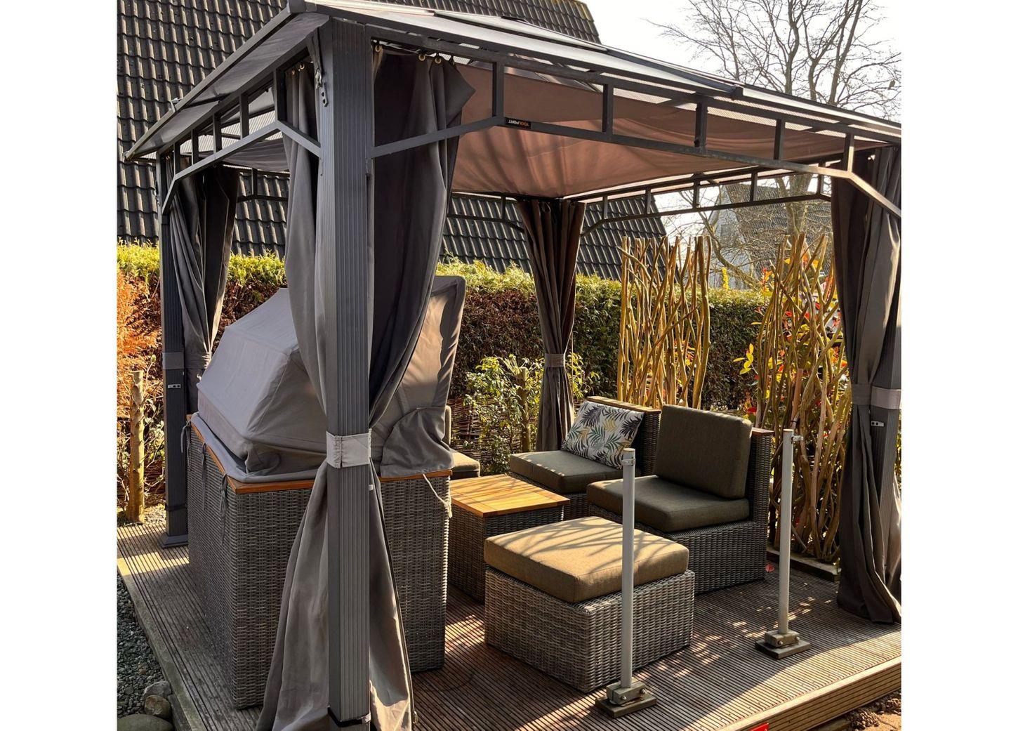 Der eigene, eingezäunte Garten ist kindgerecht angelegt und bietet mit Gartenhaus, Grillplatz, Sonnenliegen, Gartenmöbeln und einer überdachten, geschlossenen Terrasse vielfältige Möglichkeiten zur Entspannung im Freien.