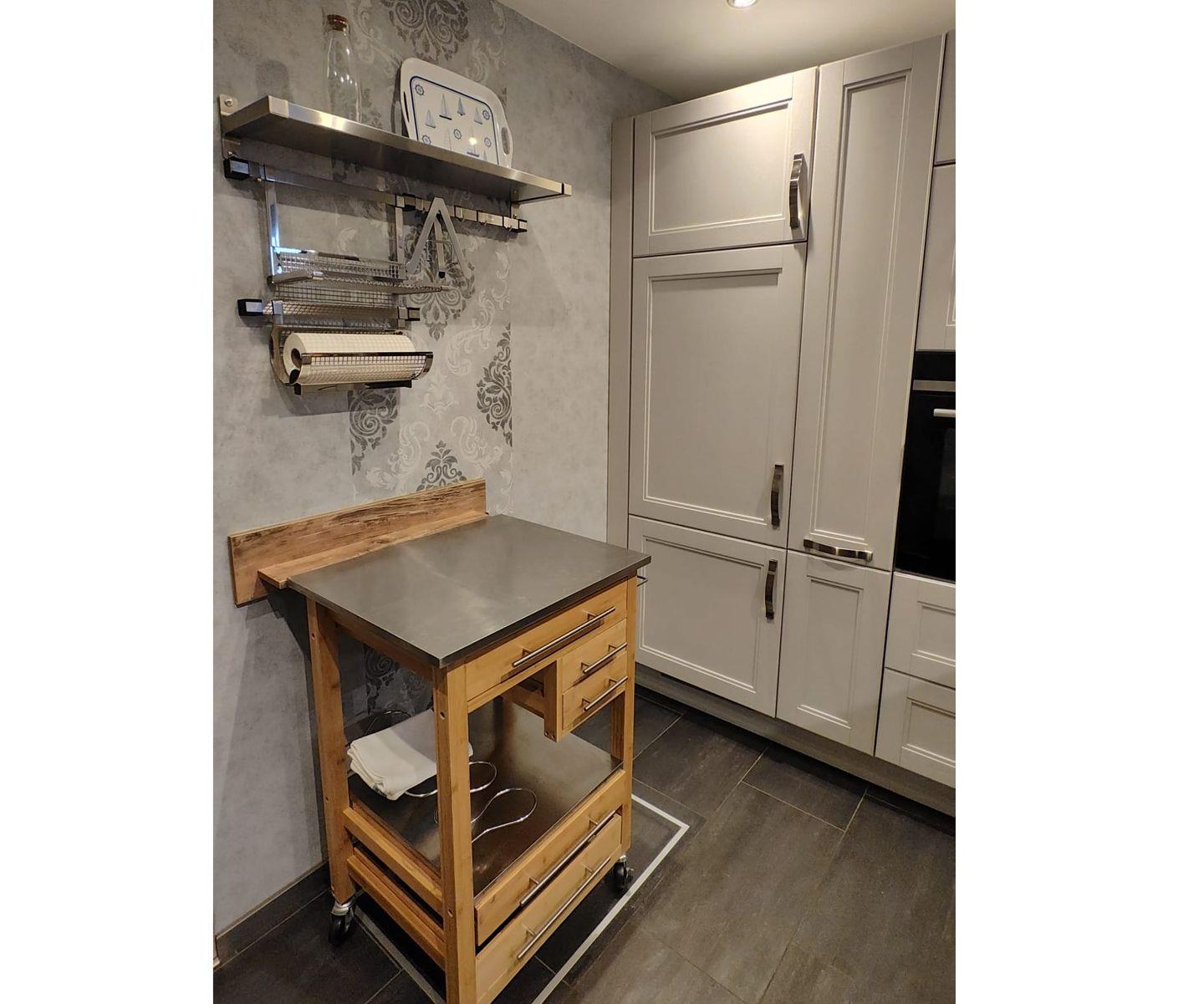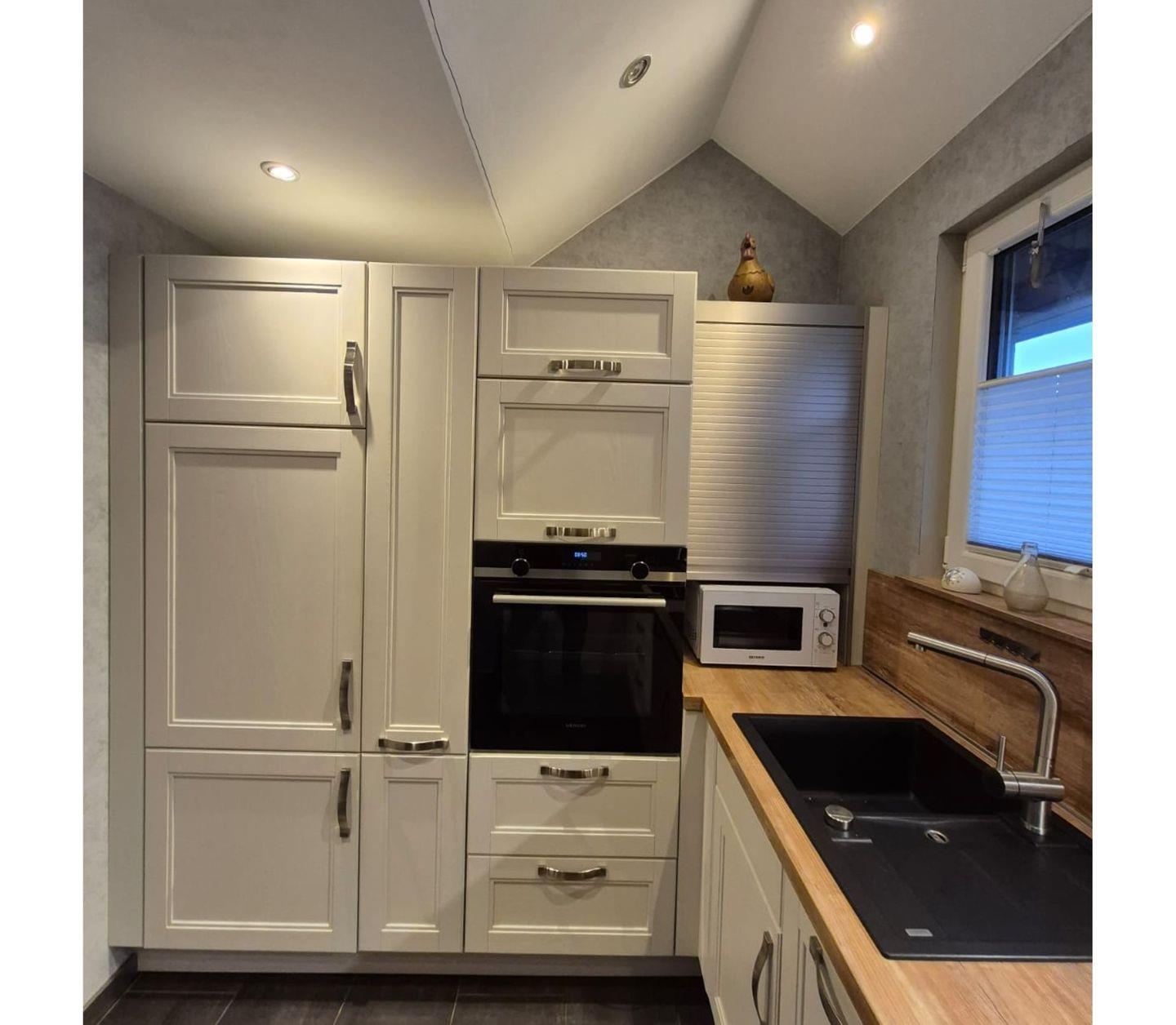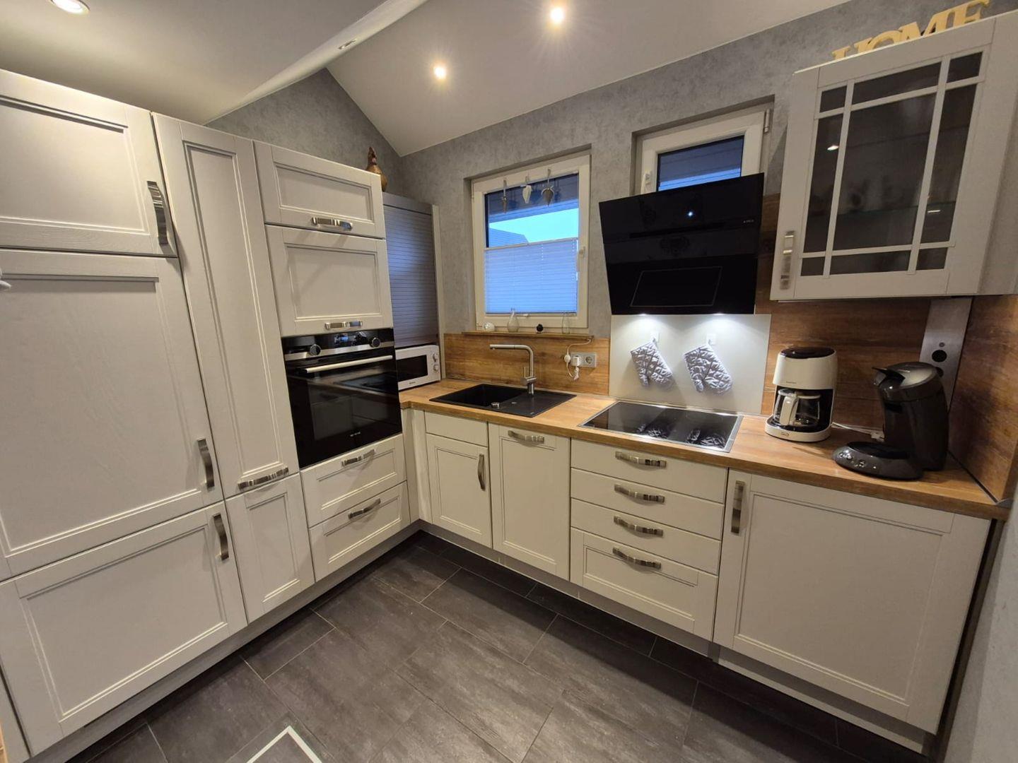 Die geschlossene Küche ist vollständig eingerichtet: Spülmaschine, Induktionsherd, Backofen, Mikrowelle, Kühlschrank mit separatem Gefrierschrank, Kaffeemaschine, Mixer, Küchenmaschine und zahlreiche weitere Utensilien stehen zur Verfügung.