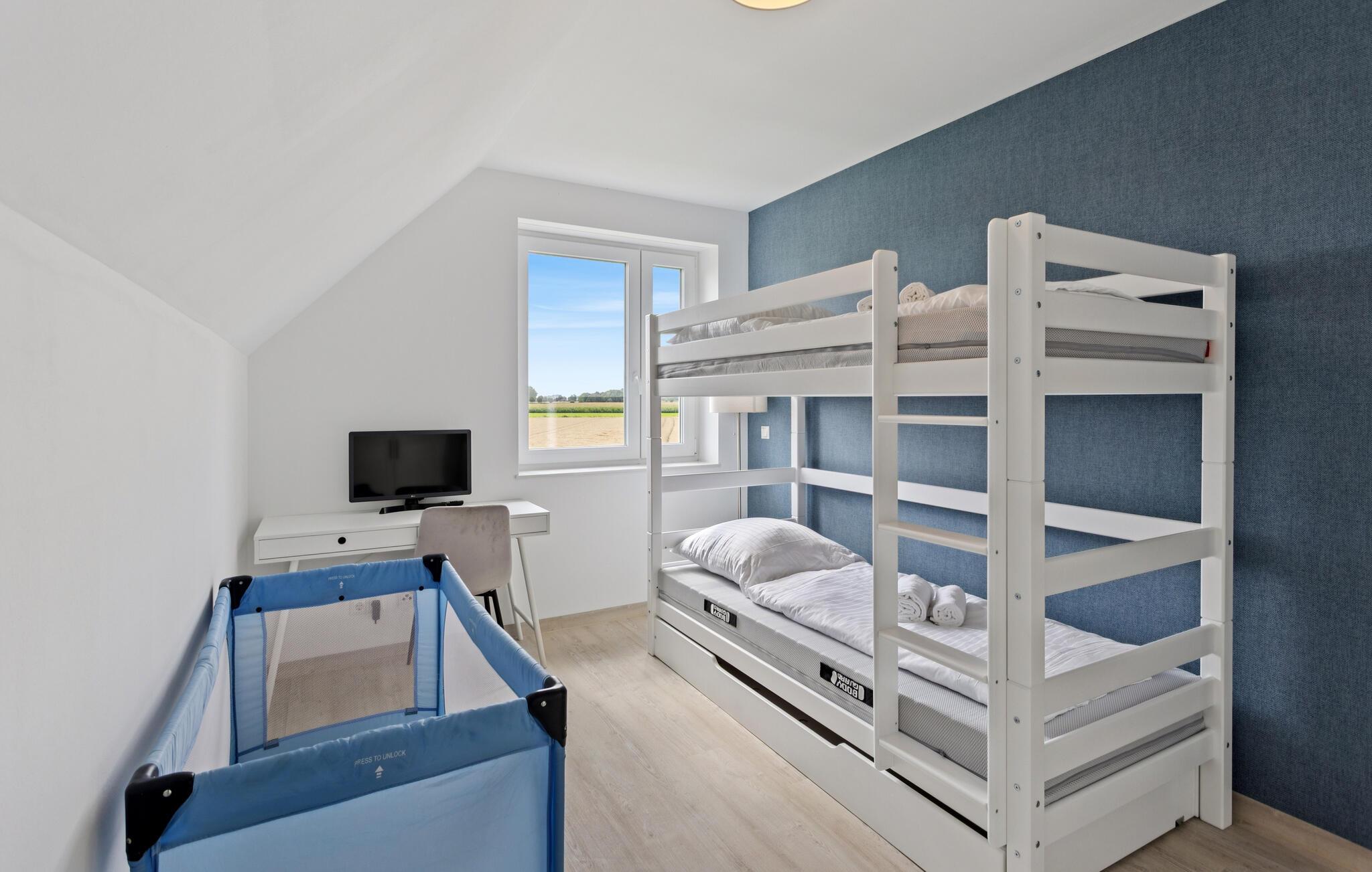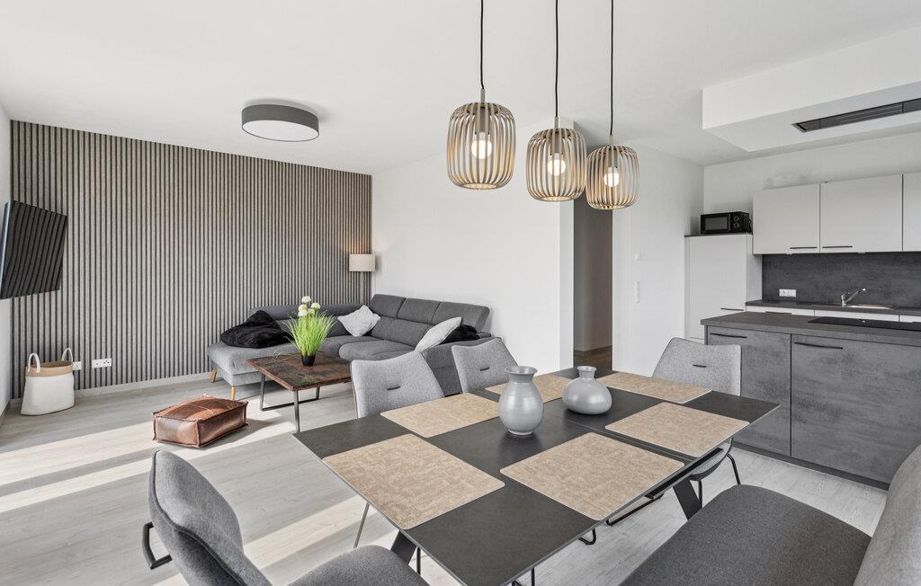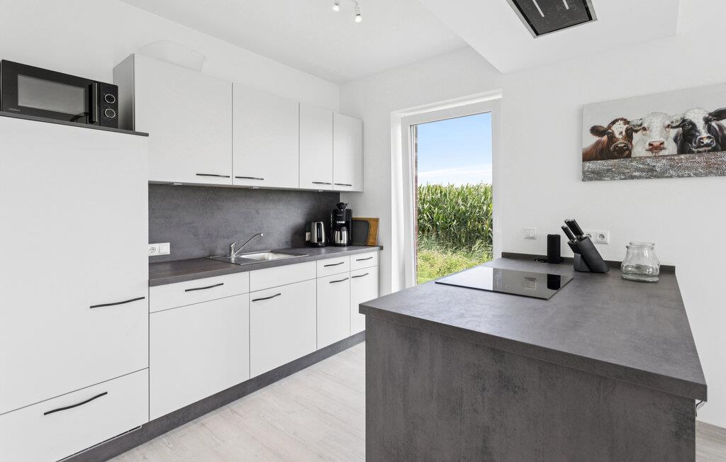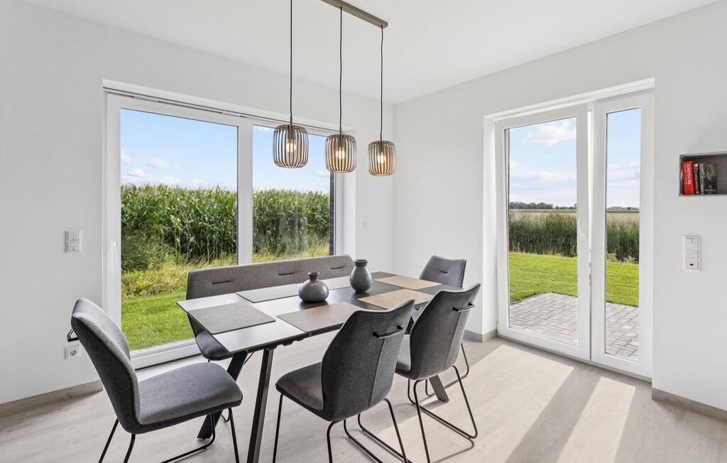 Erleben Sie erholsame Ferientage in diesem komfortablen Ferienhaus, das modernes Wohnen mit idyllischer Lage verbindet. Hier genießen Sie Ruhe, viel Platz und die Nähe zur Nordsee. Entspannen Sie in dem stilvoll eingerichteten Wohnbereich mit gemütlichem Sofa, Flachbildfernseher und bodentiefen Fenstern, die viel Tageslicht hereinlassen. Bereiten Sie Ihre Lieblingsgerichte in der Küche mit modernen Geräten zu und genießen Sie die Mahlzeiten am großen Esstisch mit Blick auf die Natur. Nutzen Sie die Sauna für wohltuende Wellnessmomente nach einem erlebnisreichen Tag.