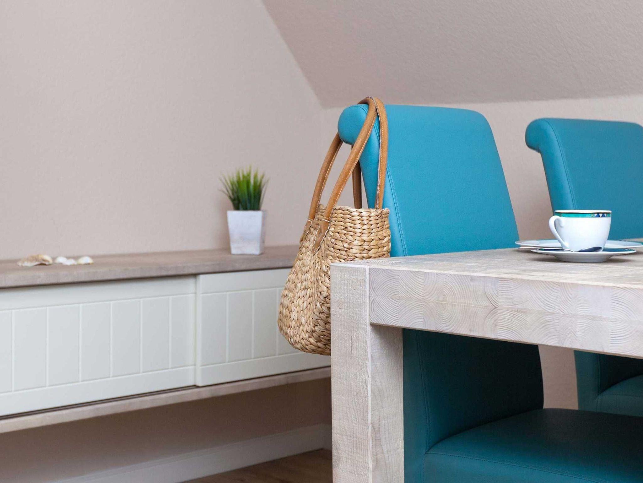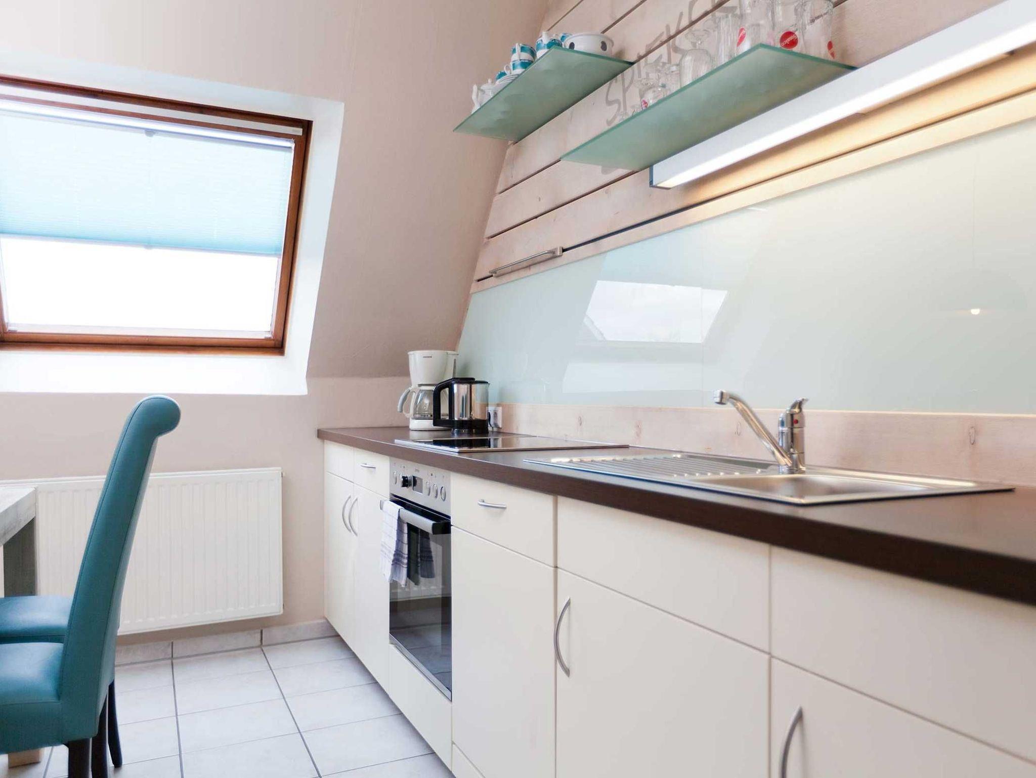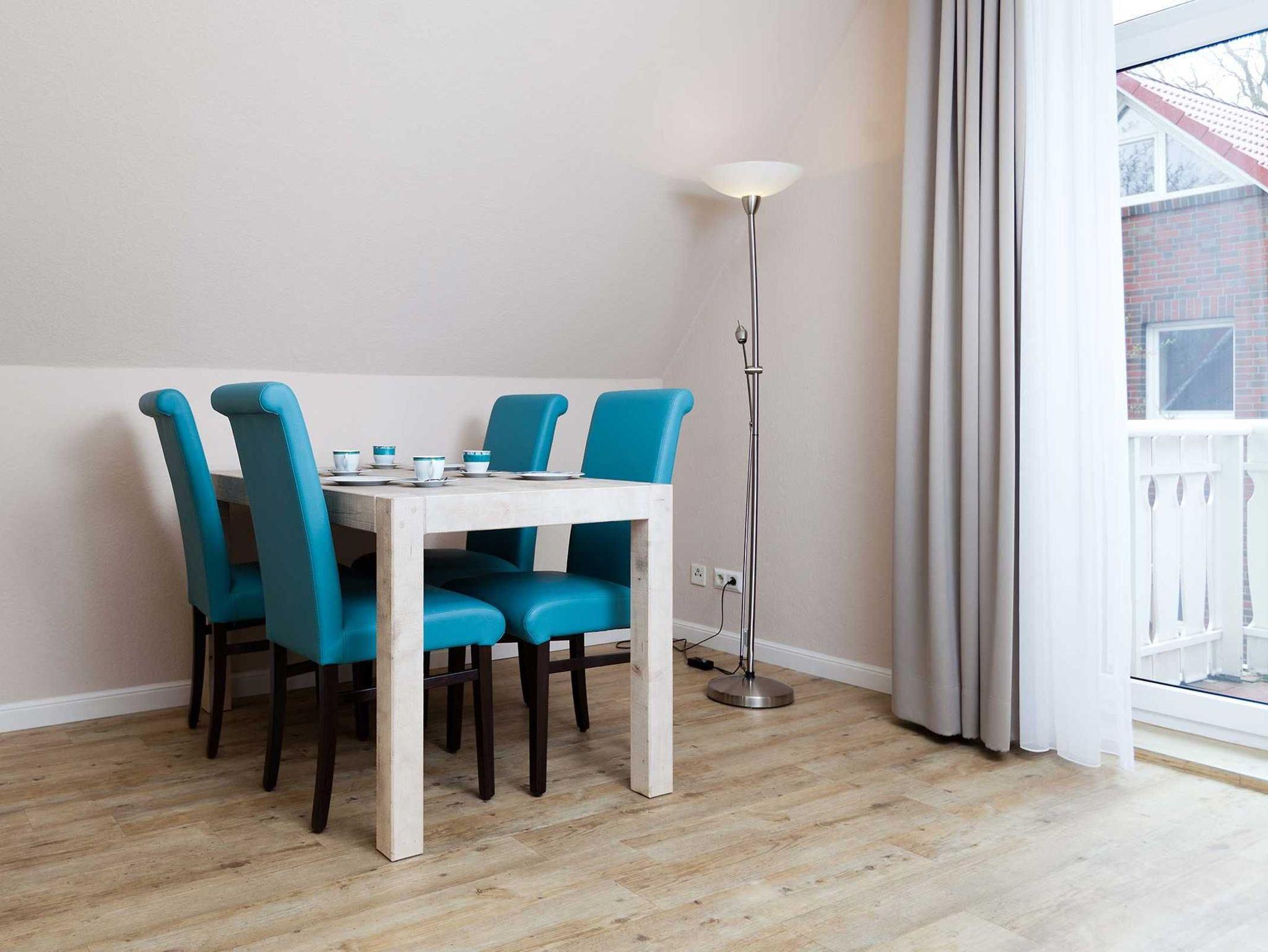 Ferienwohnung Spiekeroog für bis zu 6 Personen im 1. Obergeschoss + ausgebautem Dachgeschoss, Schlafraum mit Doppelbett, ein Bad mit Dusche/WC/Föhn, eine komplett eingerichtete Küche, ein geräumiges Wohnzimmer mit Essecke, HD-TV und angrenzendem Süd-Balkon. Abstellraum, inklusive Endreinigung.