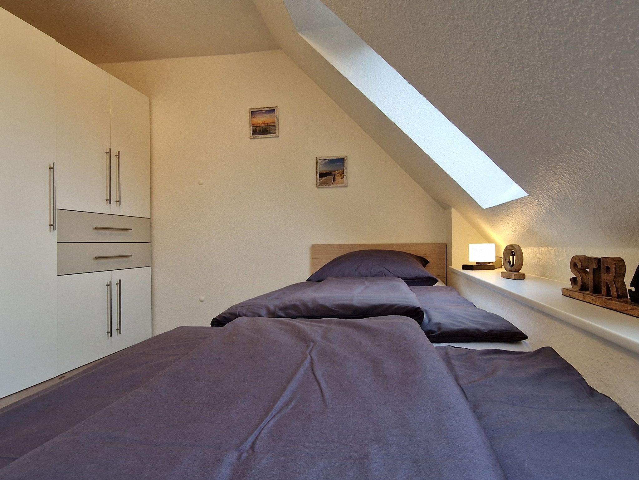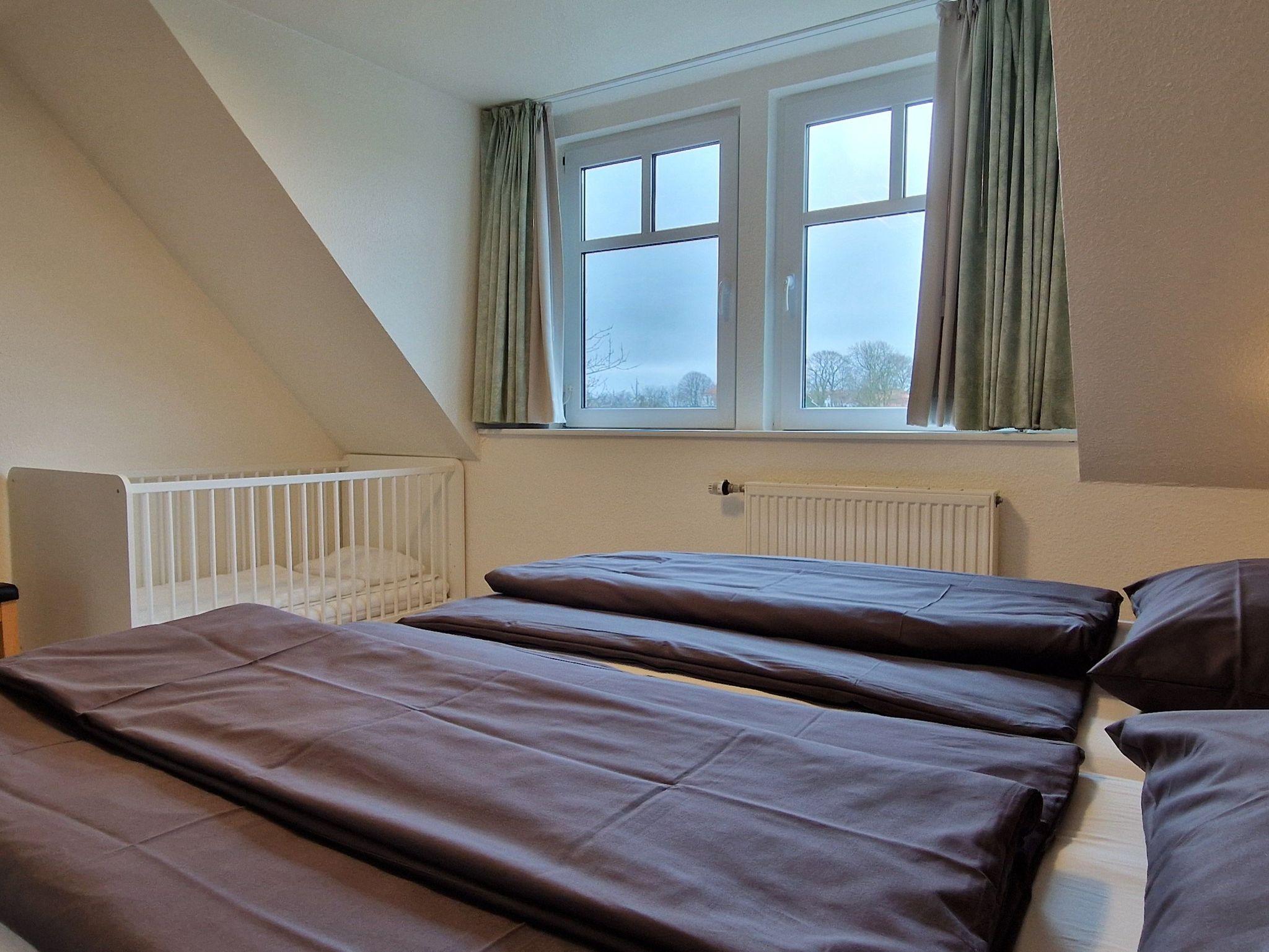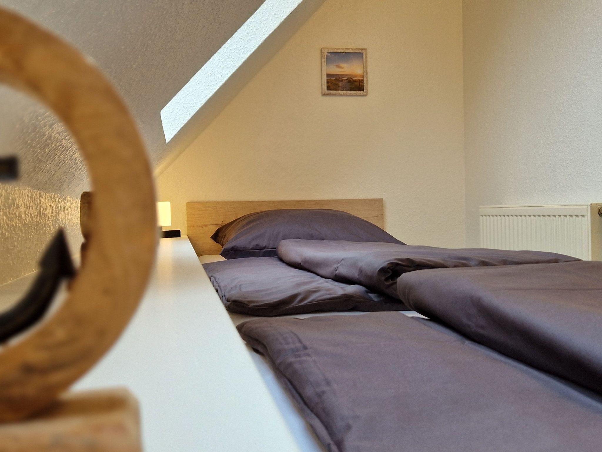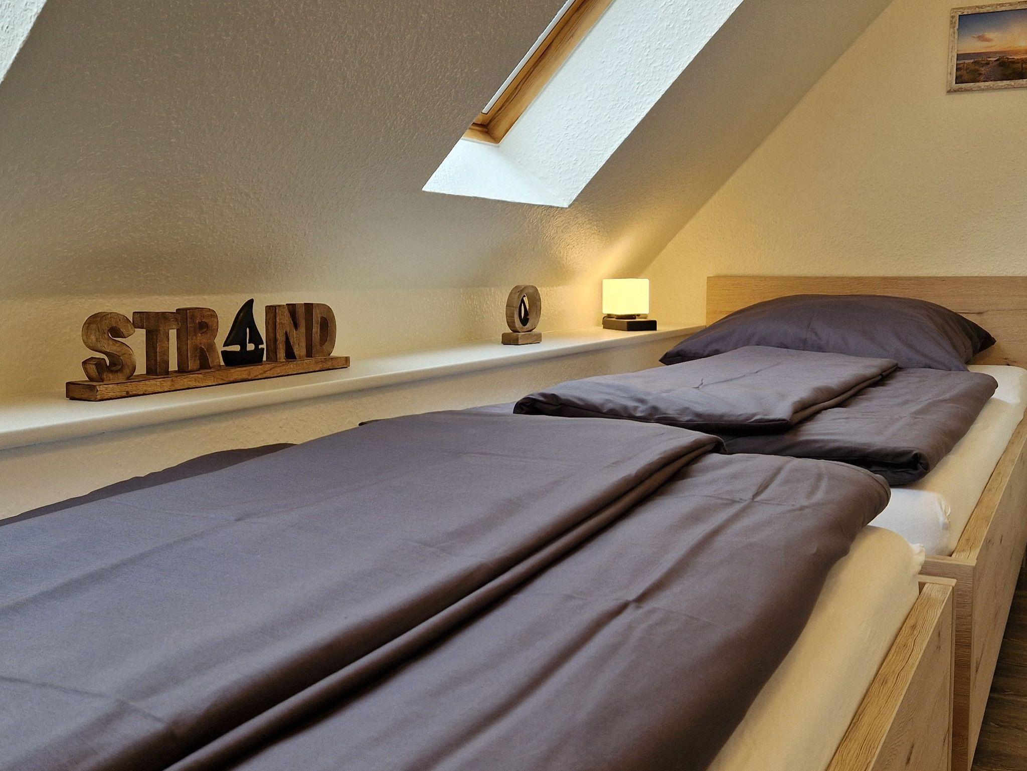Im Erdgeschoss dieses geräumigen 4-Zimmer-Reihenhauses befindet sich ein großzügiger Wohnraum mit Essbereich und eine offene Küche, sowie ein Gäste-WC. Vom Wohnraum gelangen Sie zur Terrasse und zum Gartenteil. Eine Steintreppe führt vom Flur ins Obergeschoss, indem sich ein Schlafzimmer mit einem Doppelbett und Kinderbett (1,40m x 0,70m), ein Schlafzimmer mit zwei Einzelbetten und ein Duschbad mit WC befinden. Das Ferienhaus bietet somit Platz für bis zu 4 Personen und ein Baby/Kleinkind.