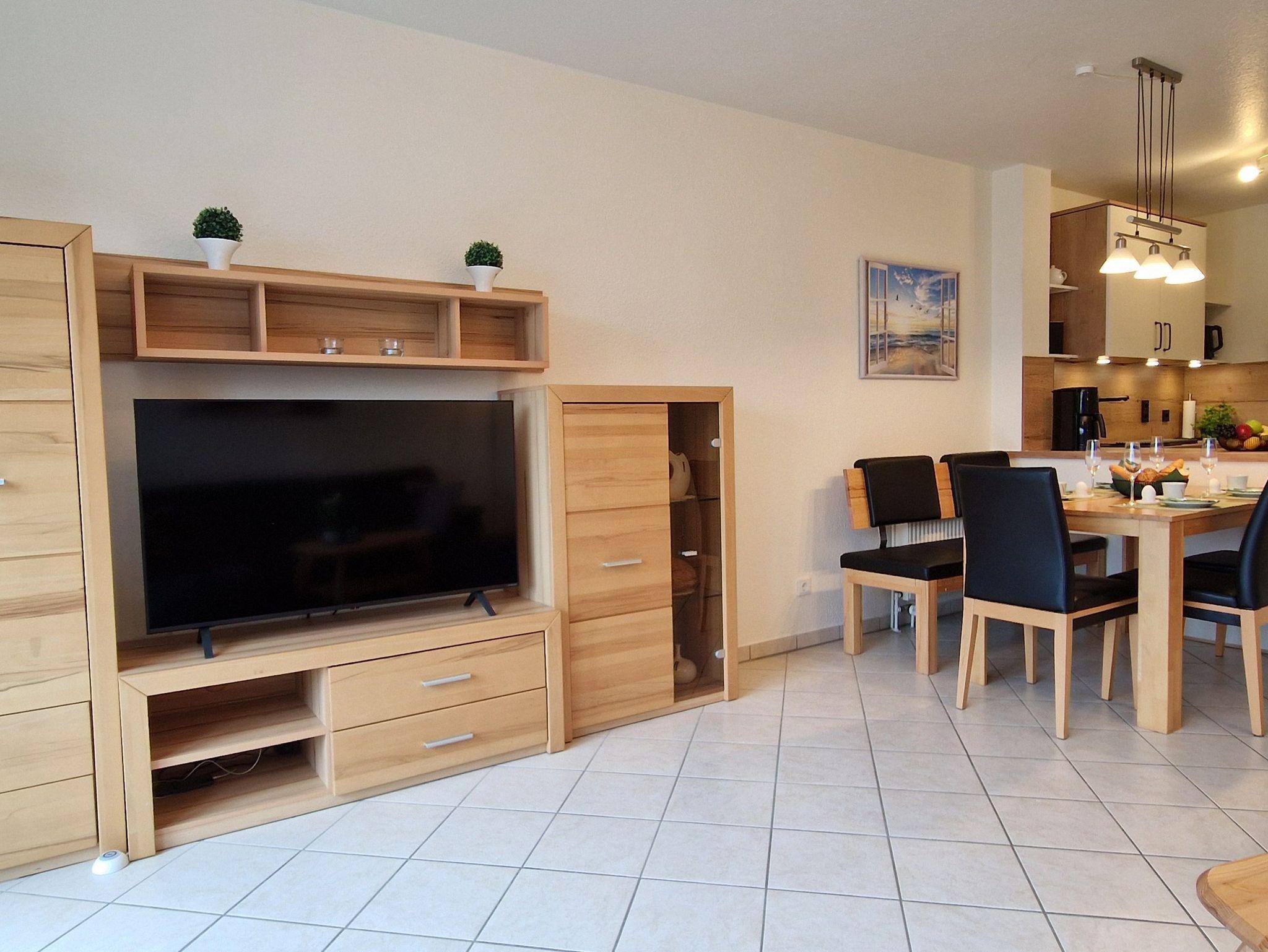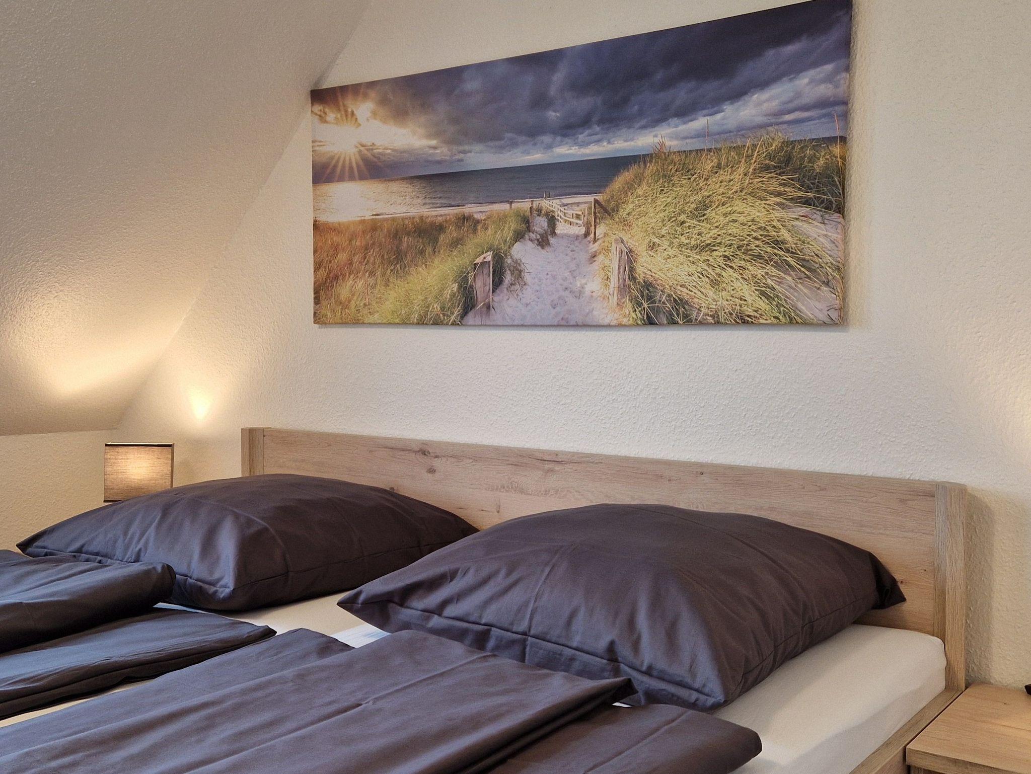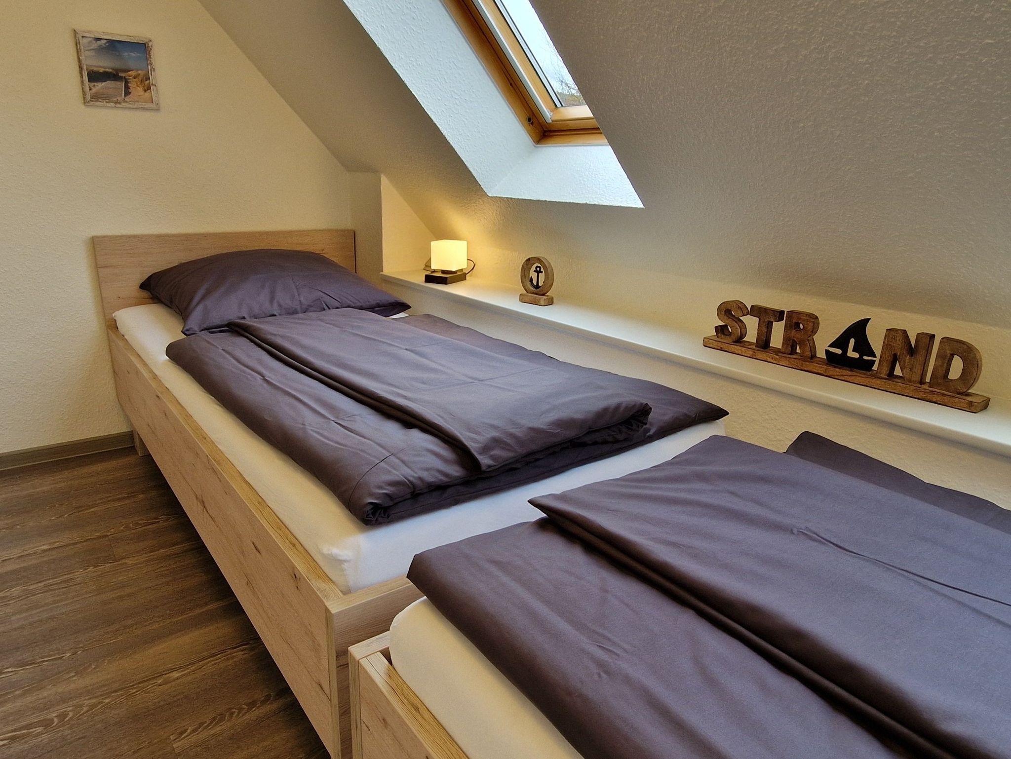Im Erdgeschoss dieses geräumigen 4-Zimmer-Reihenhauses befindet sich ein großzügiger Wohnraum mit Essbereich und eine offene Küche, sowie ein Gäste-WC. Vom Wohnraum gelangen Sie zur Terrasse und zum Gartenteil. Eine Steintreppe führt vom Flur ins Obergeschoss, indem sich ein Schlafzimmer mit einem Doppelbett und Kinderbett (1,40m x 0,70m), ein Schlafzimmer mit zwei Einzelbetten und ein Duschbad mit WC befinden. Das Ferienhaus bietet somit Platz für bis zu 4 Personen und ein Baby/Kleinkind.