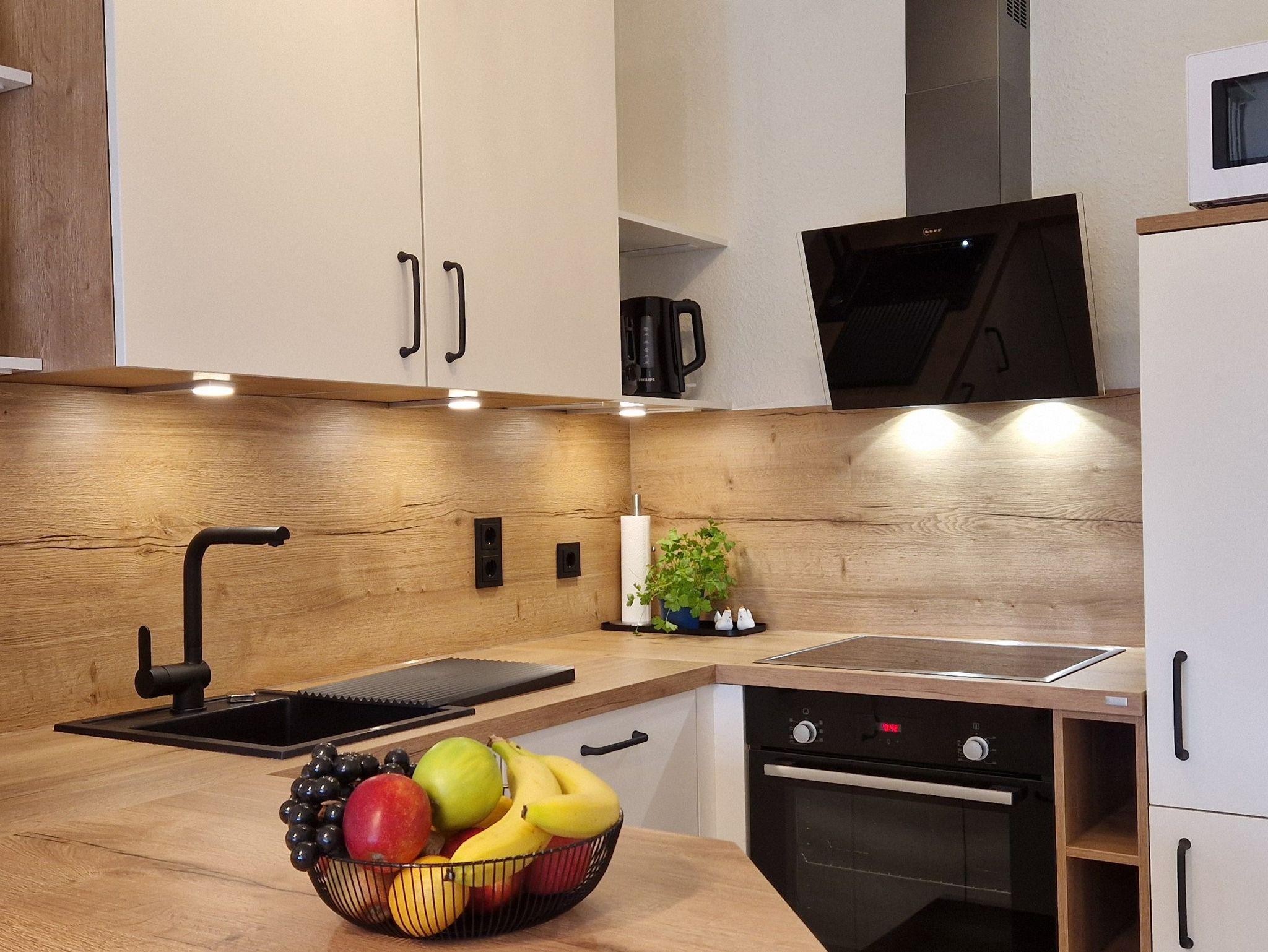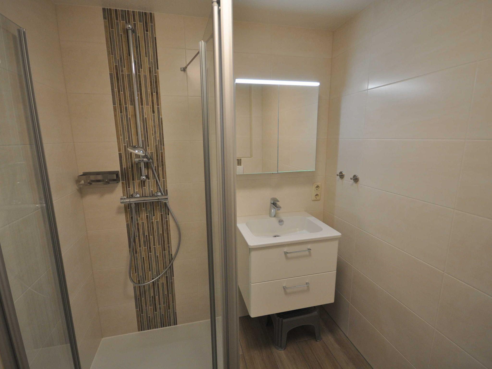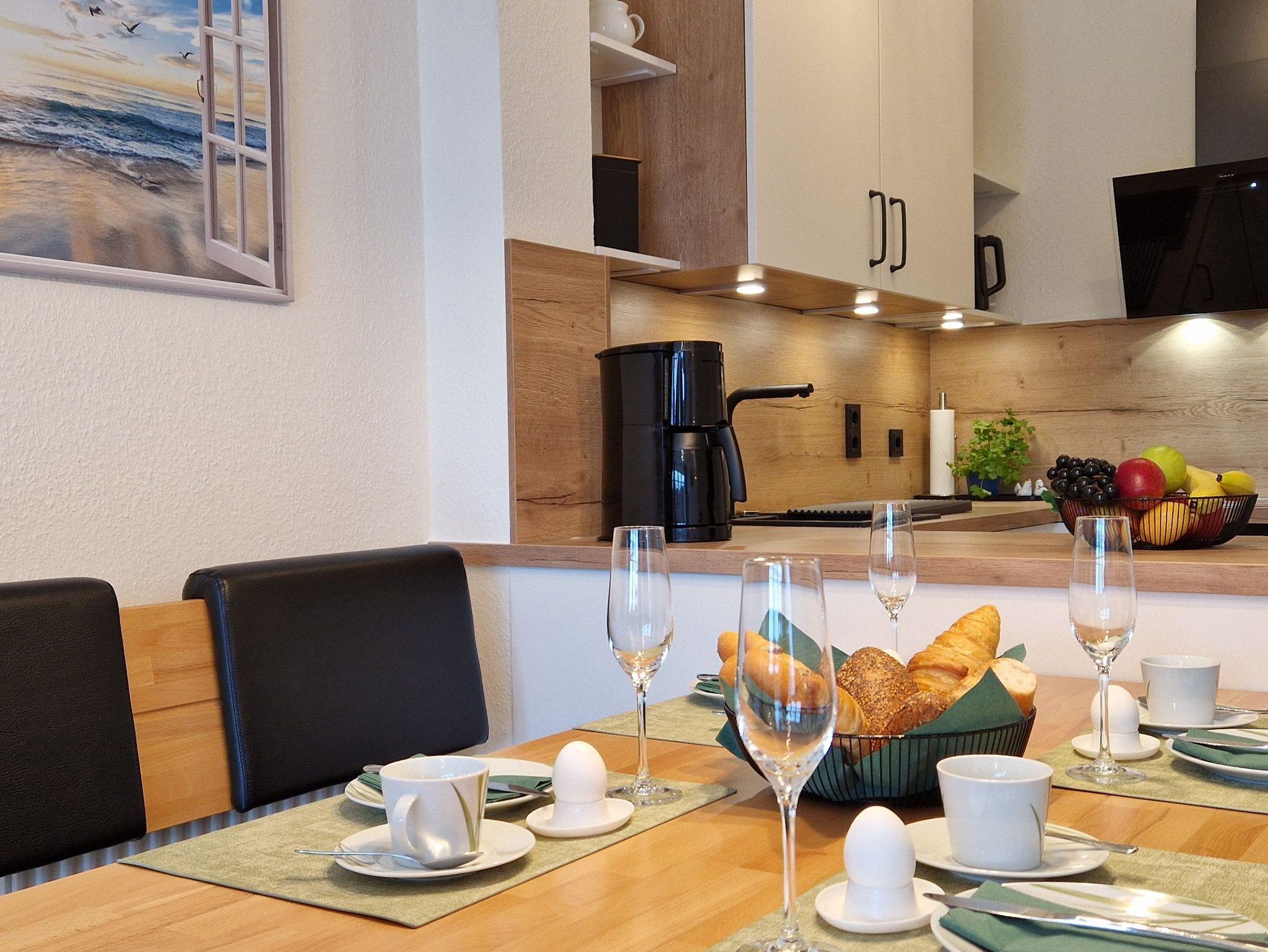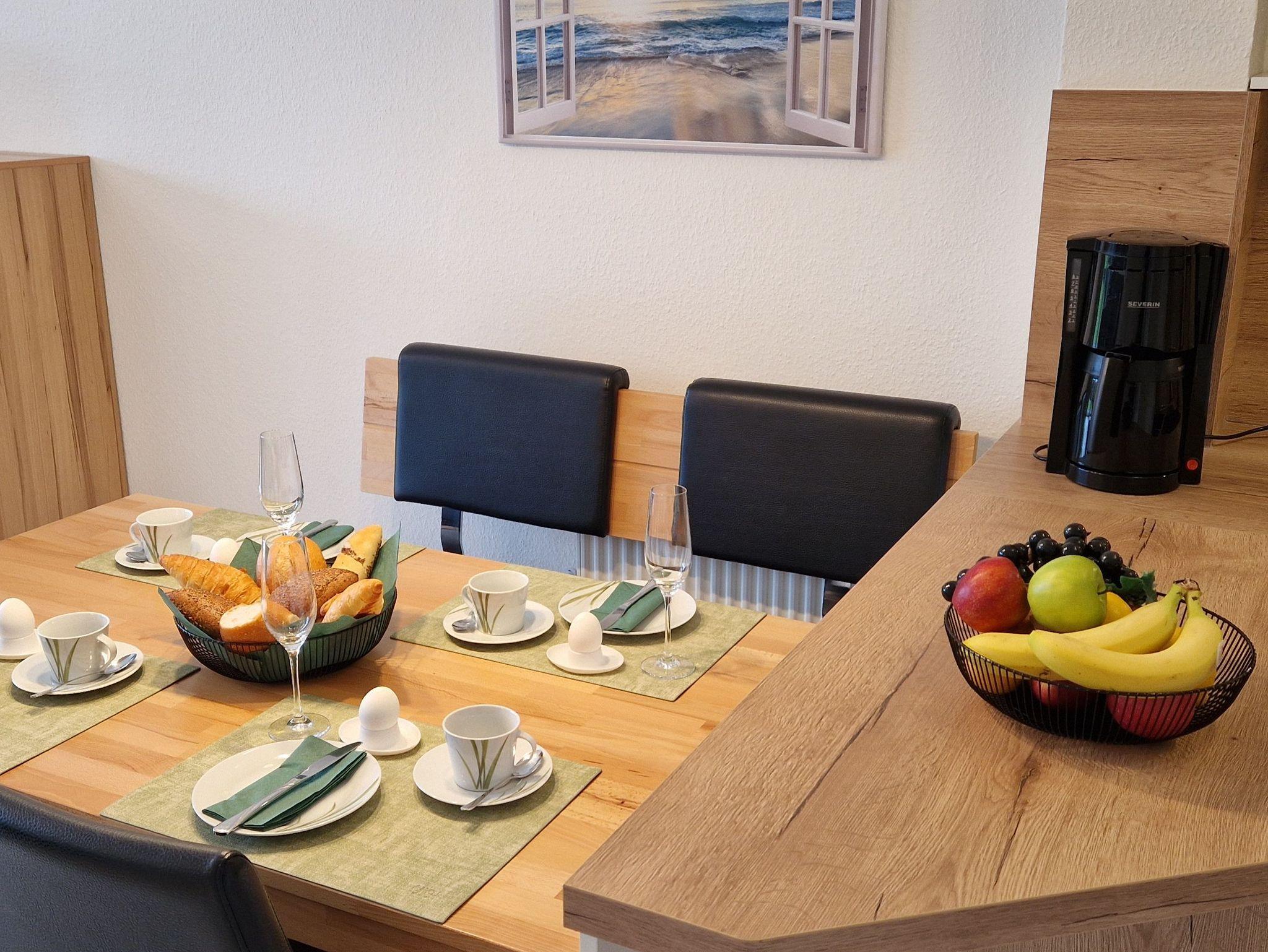 Im Erdgeschoss dieses geräumigen 4-Zimmer-Reihenhauses befindet sich ein großzügiger Wohnraum mit Essbereich und eine offene Küche, sowie ein Gäste-WC. Vom Wohnraum gelangen Sie zur Terrasse und zum Gartenteil. Eine Steintreppe führt vom Flur ins Obergeschoss, indem sich ein Schlafzimmer mit einem Doppelbett und Kinderbett (1,40m x 0,70m), ein Schlafzimmer mit zwei Einzelbetten und ein Duschbad mit WC befinden. Das Ferienhaus bietet somit Platz für bis zu 4 Personen und ein Baby/Kleinkind.