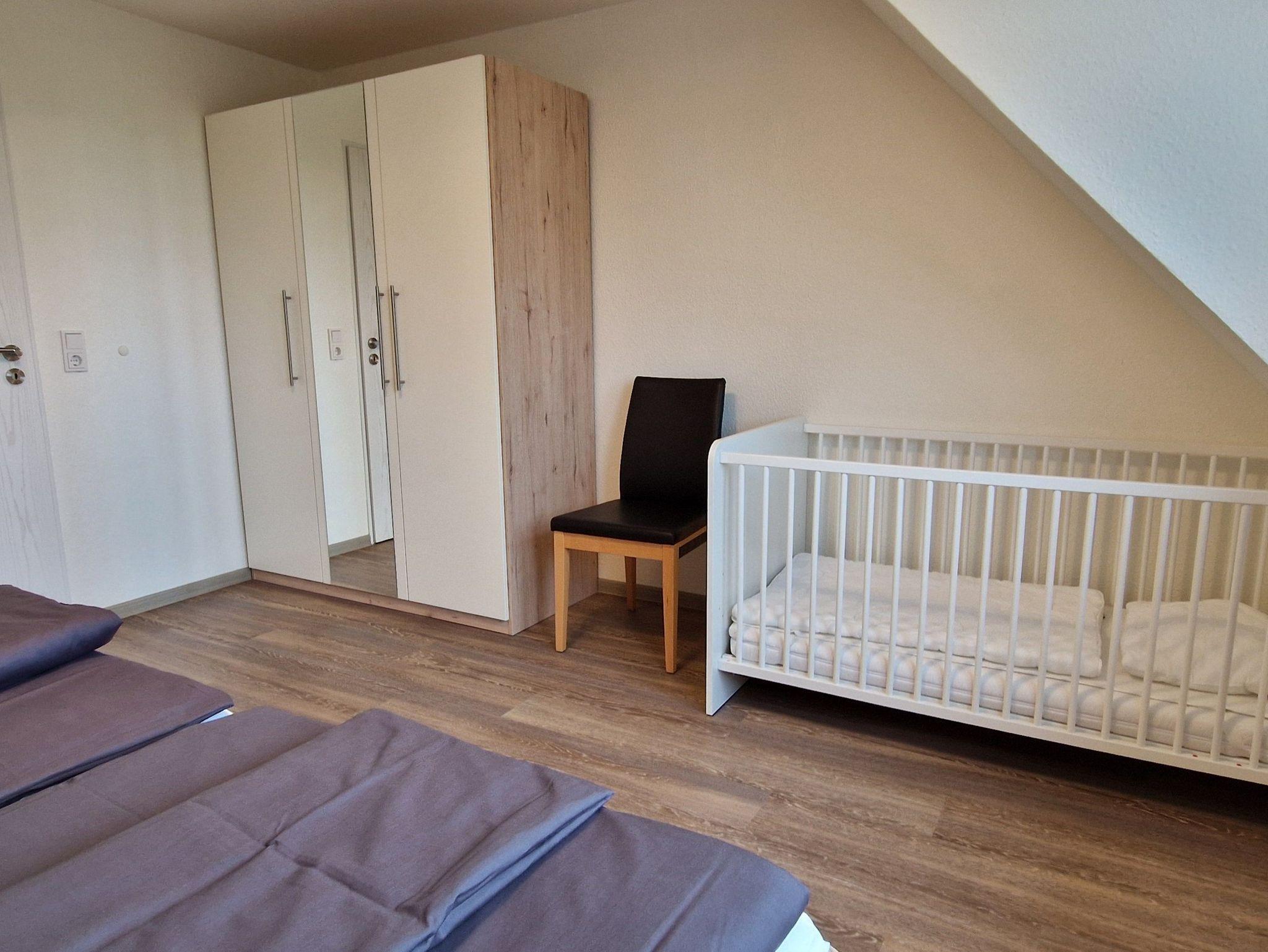 Im Erdgeschoss dieses geräumigen 4-Zimmer-Reihenhauses befindet sich ein großzügiger Wohnraum mit Essbereich und eine offene Küche, sowie ein Gäste-WC. Vom Wohnraum gelangen Sie zur Terrasse und zum Gartenteil. Eine Steintreppe führt vom Flur ins Obergeschoss, indem sich ein Schlafzimmer mit einem Doppelbett und Kinderbett (1,40m x 0,70m), ein Schlafzimmer mit zwei Einzelbetten und ein Duschbad mit WC befinden. Ein weiteres Einzelbett steht im ausgebauten offenen Dachstudio zur Verfügung. Das Ferienhaus bietet somit Platz für bis zu 5 Personen und ein Baby/Kleinkind.