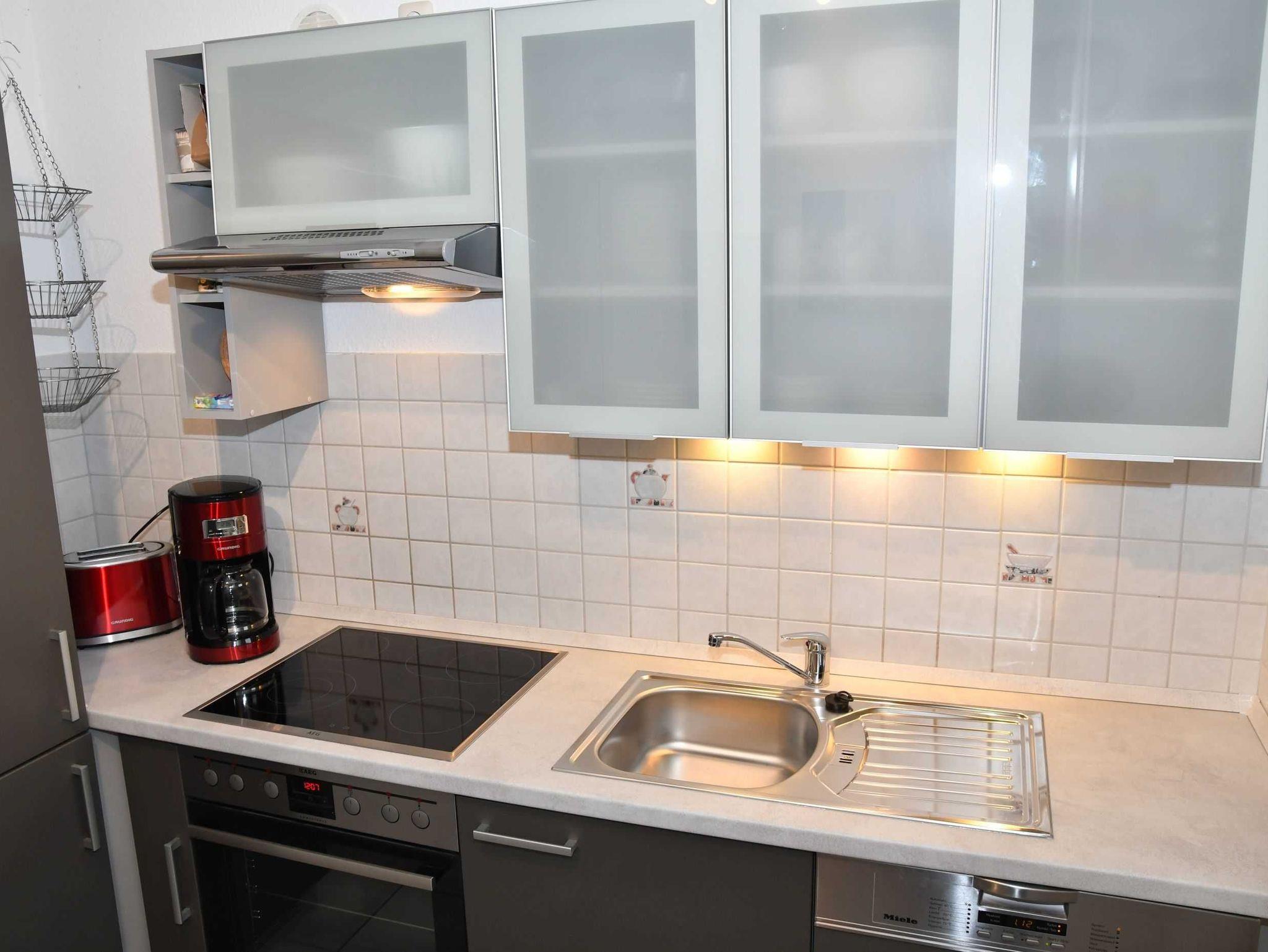 Die Küche ist modern und komplett eingerichtet. Egal ob Sie nun einen Kuchen backen, ein komplettes Menü kochen oder nur eine Pizza aufbacken möchten.