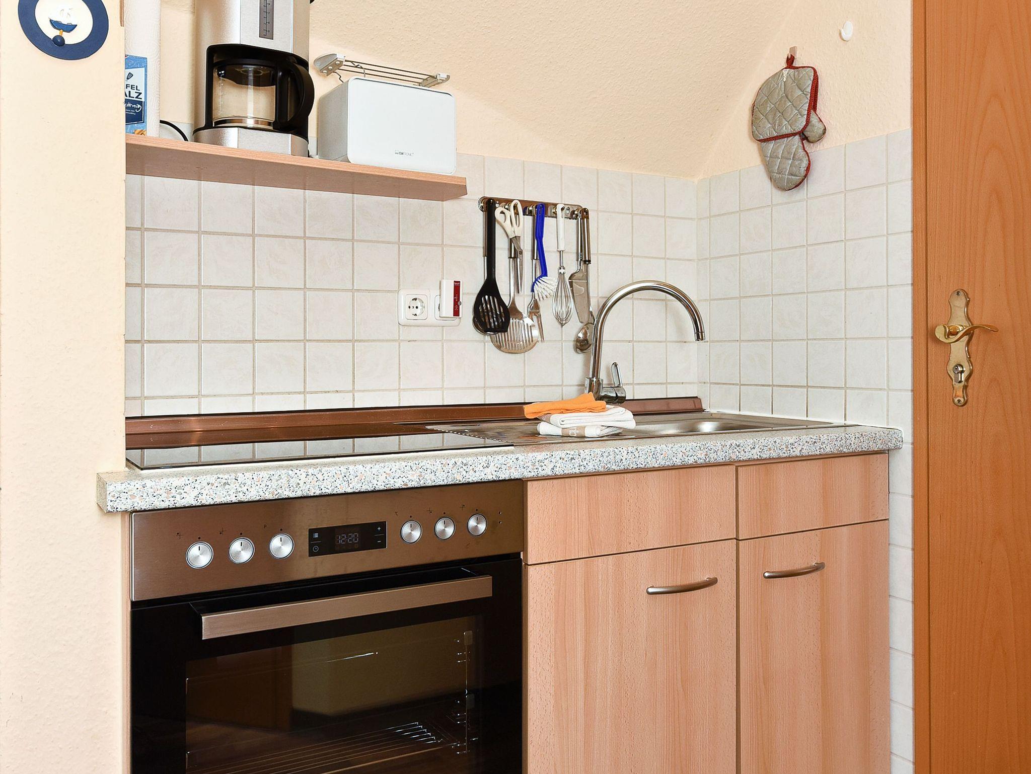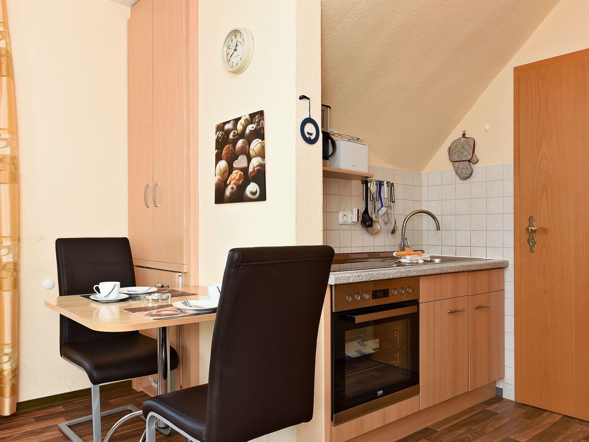 Größe ca. 29 Quadratmeter, Wohnraum mit räumlich abgeteilter Küche, Schlafzimmer, Badezimmer mit Dusche, Waschtisch und WC, Erdgeschoss, Terrasse, optimal für 1 bis 2 Personen.