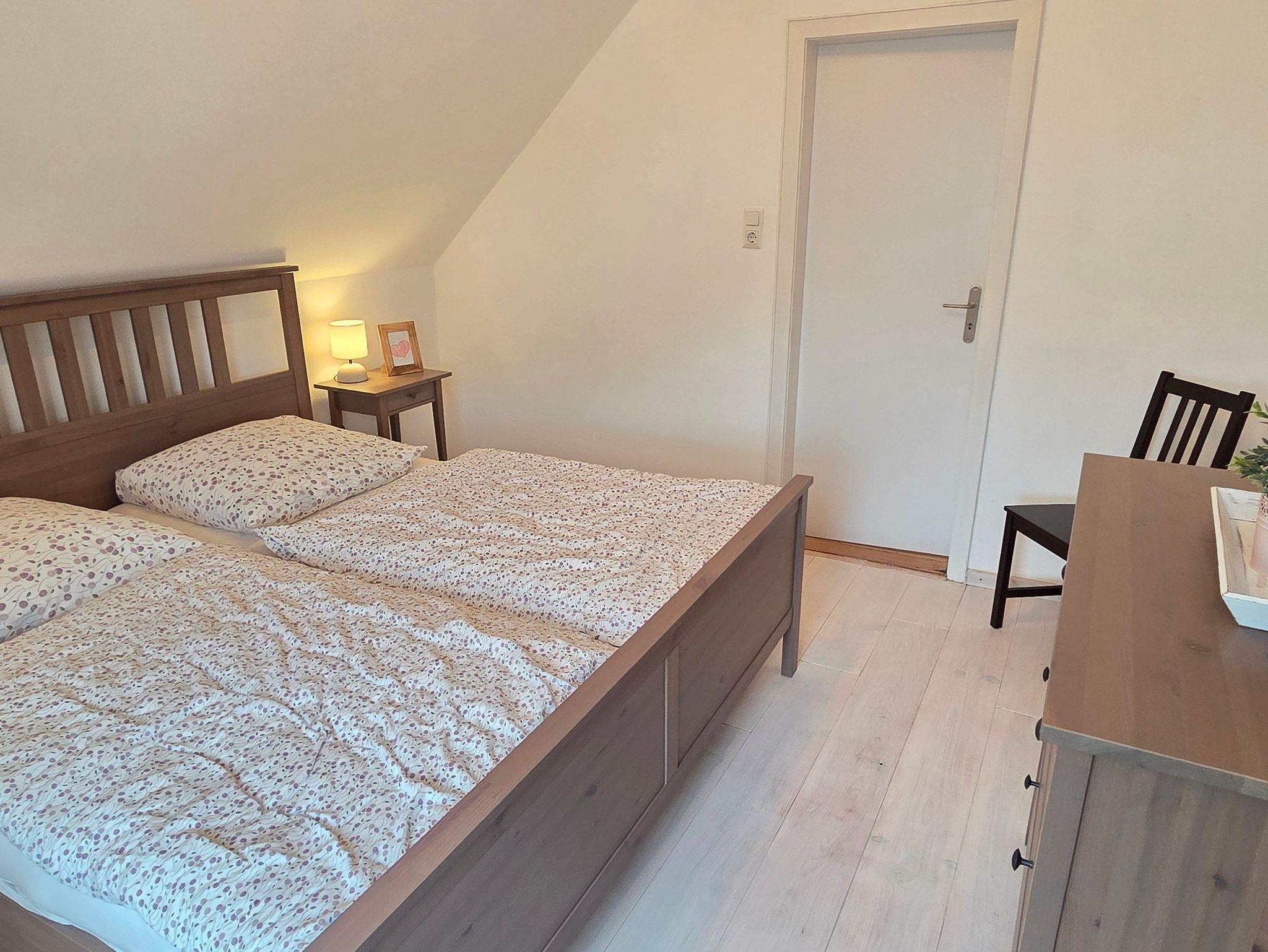 Der offene Wohn- und Essbereich lädt zum Verweilen ein und bietet ausreichend Platz für gesellige Stunden. Die separate, voll ausgestattete Küche ermöglicht Ihnen eine bequeme Selbstversorgung. Zwei gemütliche Schlafzimmer im Obergeschoss sorgen für einen erholsamen Schlaf: eines mit einem komfortablen Doppelbett, das andere mit zwei Einzelbetten. Neben einem geräumigen Badezimmer mit Dusche und Badewanne ist ein zusätzliches Gäste-WC vorhanden.