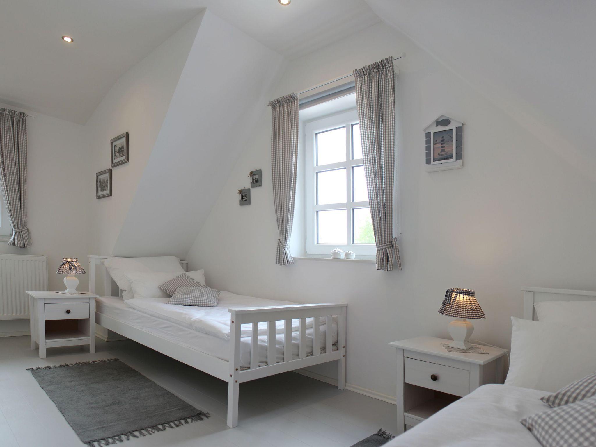Im gut isolierten Obergeschoss befinden sich zwei großzügige Schlafzimmer und ein separates WC. Das Elternschlafzimmer mit Echtholzparkett und Blick auf die Harle verfügt über ein komfortables Doppelbett, ein Kinderbett und viel Stauraum. Im zweiten Schlafzimmer stehen Twin-Betten für Sie bereit.