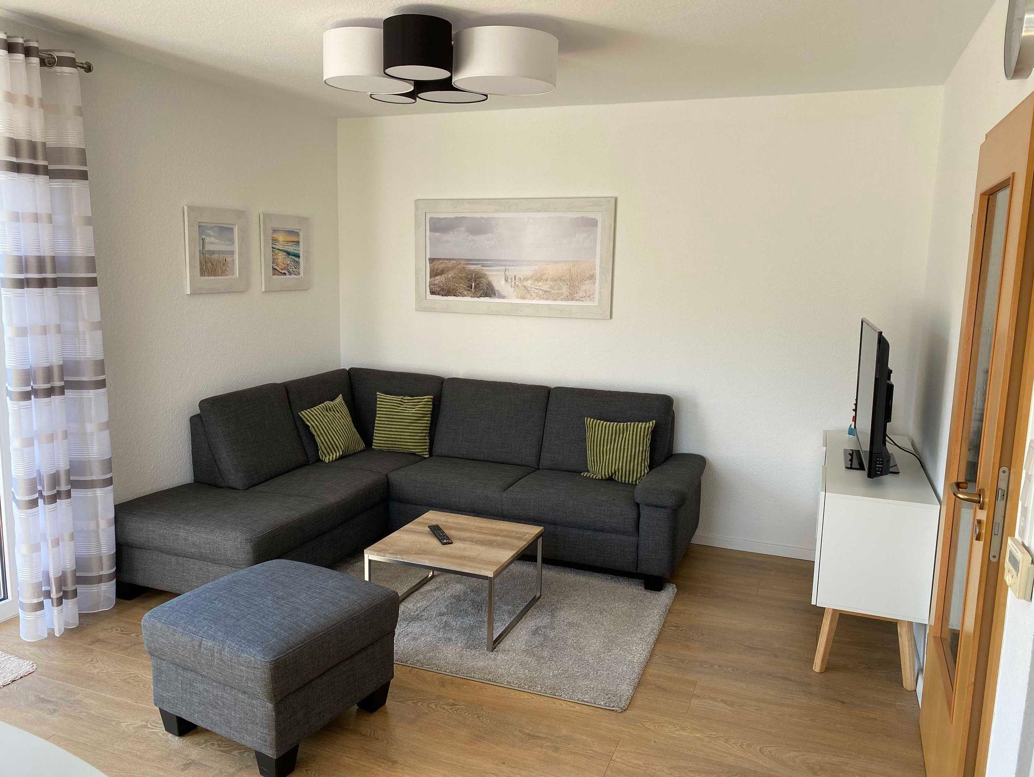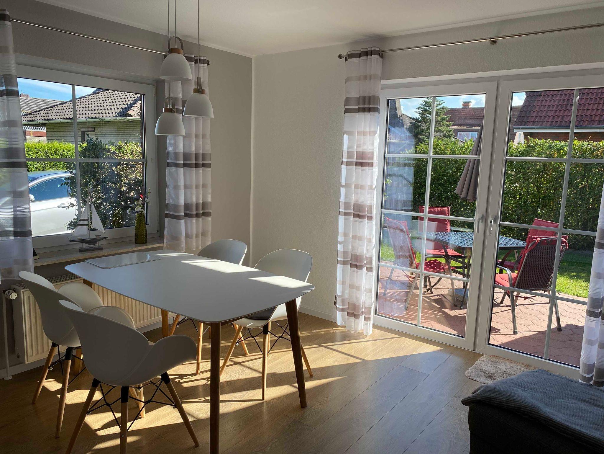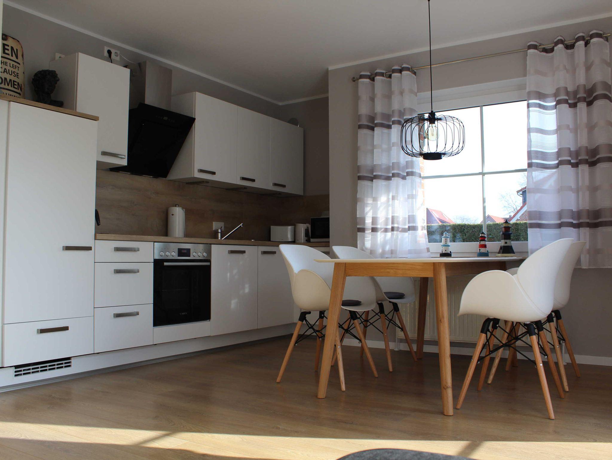 Diese moderne und im Jahr 2020 umfassend renovierte Erdgeschosswohnung verfügt auf ca. 56m² über einen Wohn- und Essbereich mit einer offenen Küche, über 2 separate Schlafzimmer (Doppelbett bzw. zwei Einzelbetten) sowie über ein Duschbad. Vom Wohnraum gelangen Sie auf die möblierte Terrasse mit Gartenteil. Alle Räume sind mit Fliesen bzw. Laminat, die Fenster mit Rollläden ausgestattet. Die geschmackvoll und hochwertig eingerichtete Wohnung bietet Ihnen alles, was Sie in ihrem Urlaub zur Erholung benötigen. WLAN steht Ihnen kostenlos zur Verfügung.
