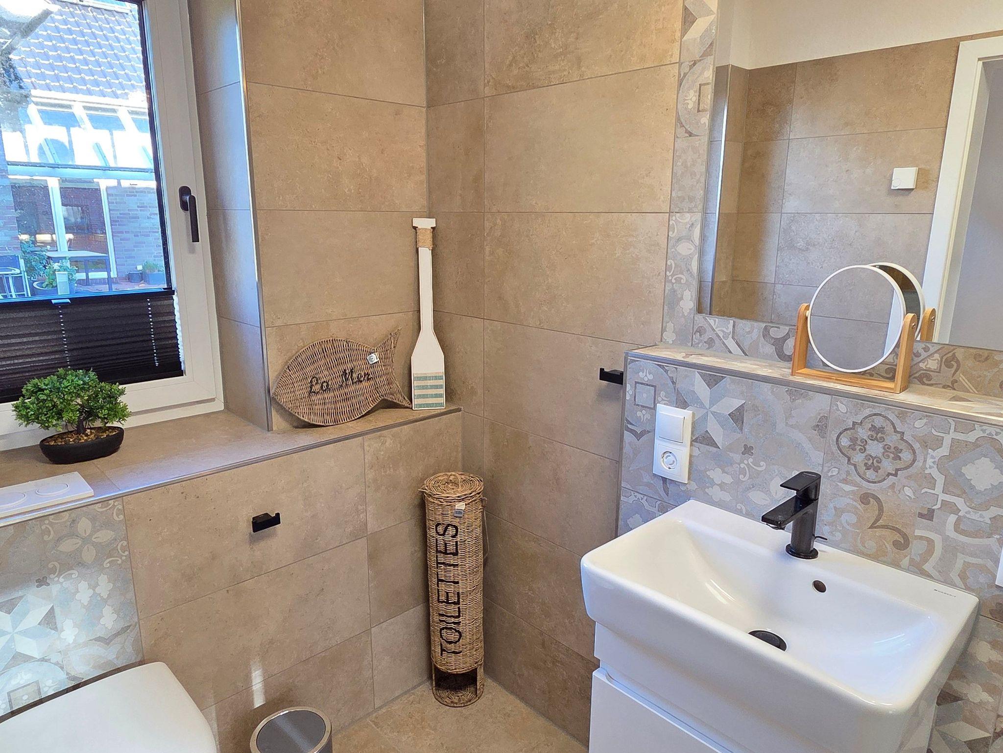 Modernes Ferienhaus Bootshus in Carolinensiel mit Sauna, Garten und barrierefreiem Schlafzimmer für erholsame Urlaubstage.