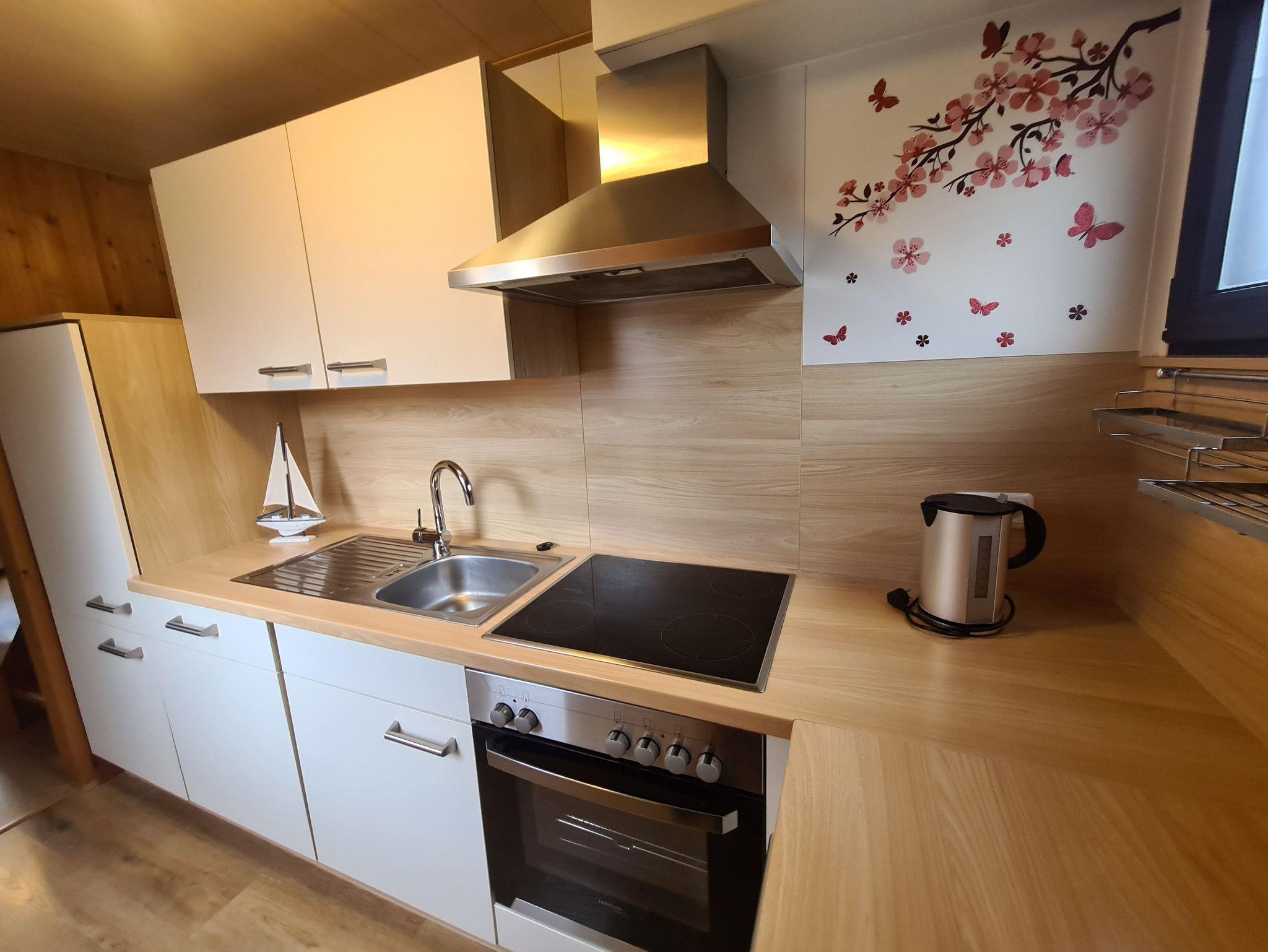 Die helle Küche punktet mit Geschirrspülmaschine, Backofen, Gefrierfach, Mikrowelle, Mixer und vielen weiteren Extras.