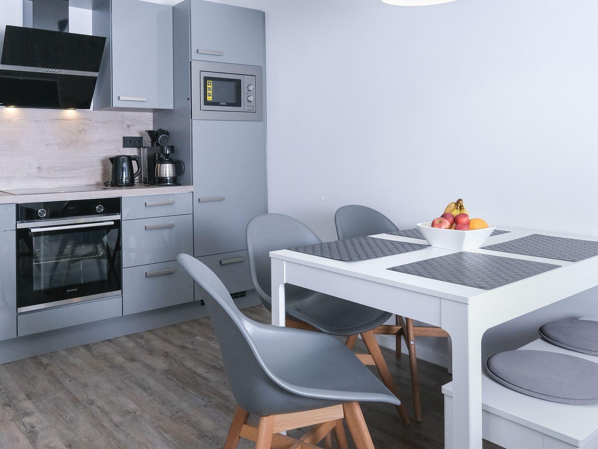 Die Wohnung Nr. 2 im Friesenhuus Carolinensiel verfügt über einen geräumigen Flur mit Garderobe und gewährt Zutritt zum modernen Badezimmer mit WC, Waschtisch, bodengleicher Dusche und Fön. Den Mittelpunkt der Wohnung stellt der offen gestalte Wohn- und Essbereich mit großer Fensterfront zu Terrasse und Garten dar. Hier lädt eine gemütliche Couch-Ecke mit Sessel zum Verweilen ein. Für die passende Unterhaltung sorgen Gesellschaftsspiele, ein Flachbild-TV mit Smart-TV, Blu-ray-Player und Hi-Fi-System. Die hochwertige Küchenzeile ist voll ausgestattet und verfügt über eine Spülmaschine, einen Backofen mit Cerankochfeld, eine Mikrowelle, einen großen Kühlschrank mit separatem Gefrierfach, eine Kaffeemaschine (wahlweise Pad oder Filter), einen Wasserkocher, Toaster u.v.m. Am Esstisch finden bis zu 5 Personen Platz.