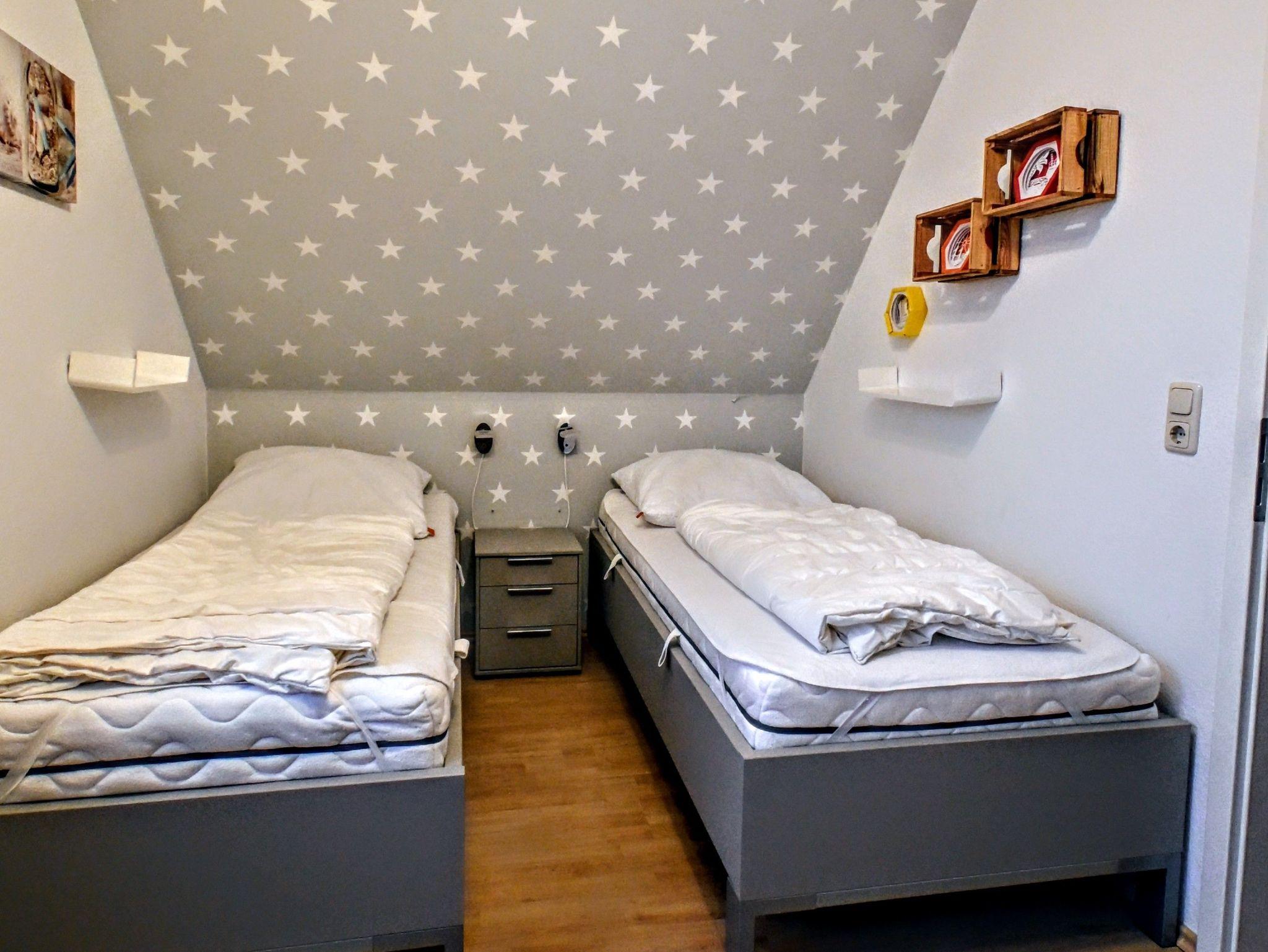 Im 1. OG sind das Dusch-Bad, zwei Schlafzimmern mit zwei Einzelbetten (0,90*2,00 m, bzw. 1,00*2,00m) sowie ein Schlafzimmer mit einem Doppelbett (1,90*2,00 m) zu finden.