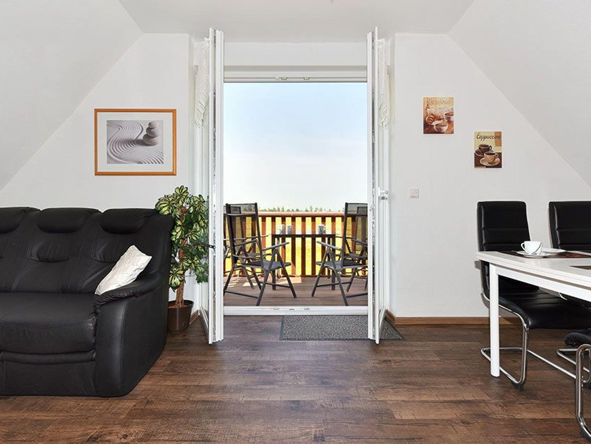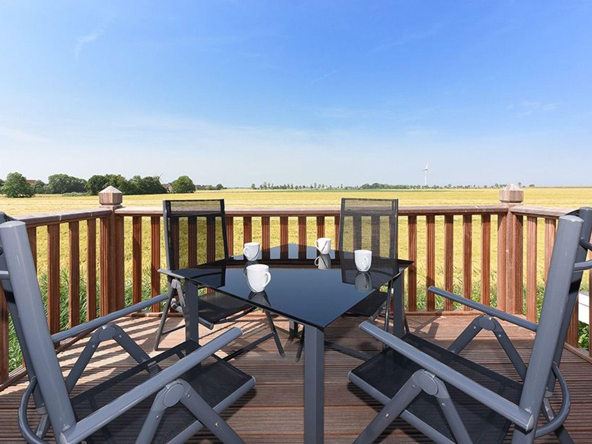 Moderne Ferienwohnung Steuerbord im Haus Seute Deern mit Balkon, Terrasse und Blick auf Felder bei Carolinensiel-Harlesiel.