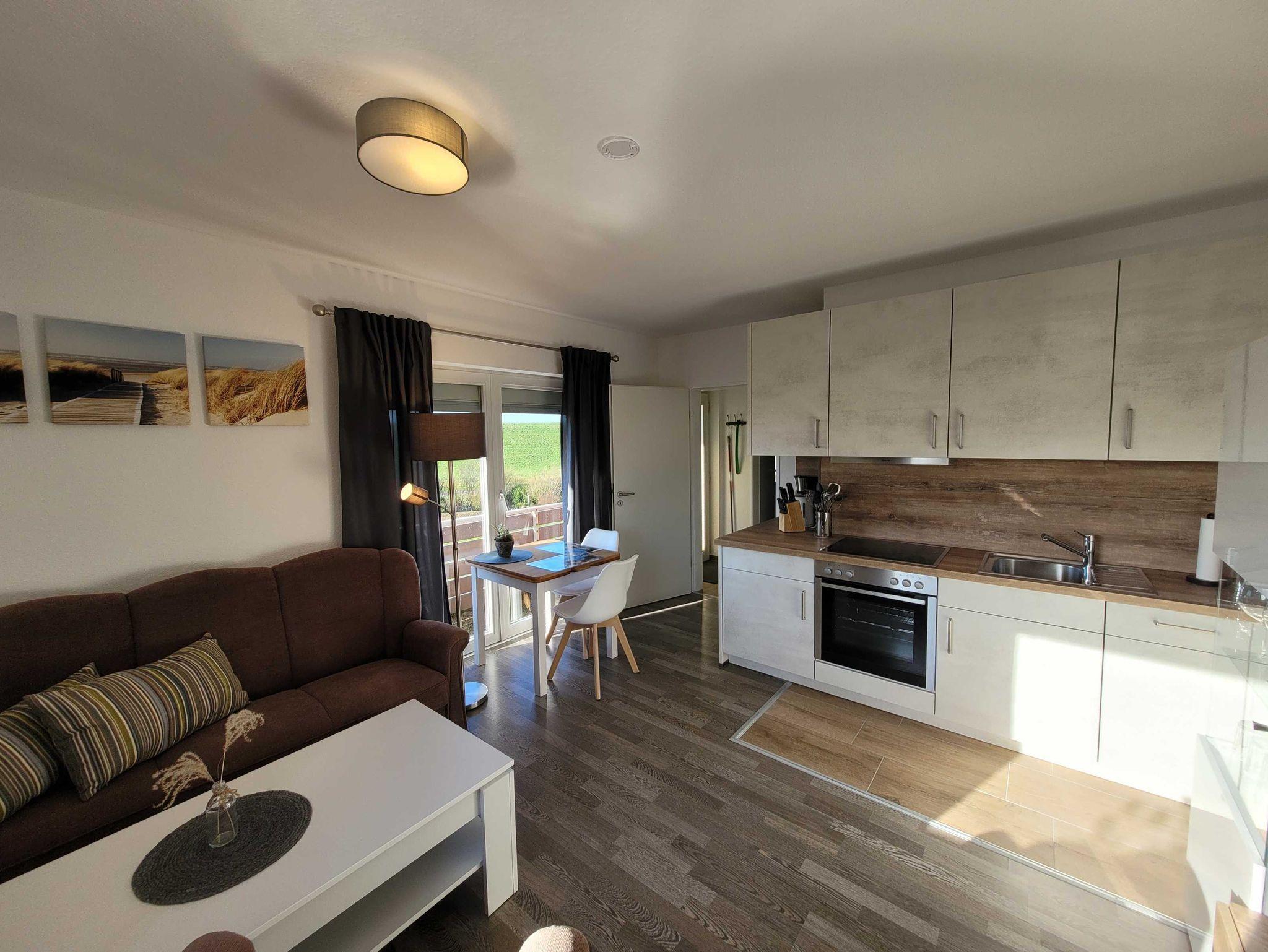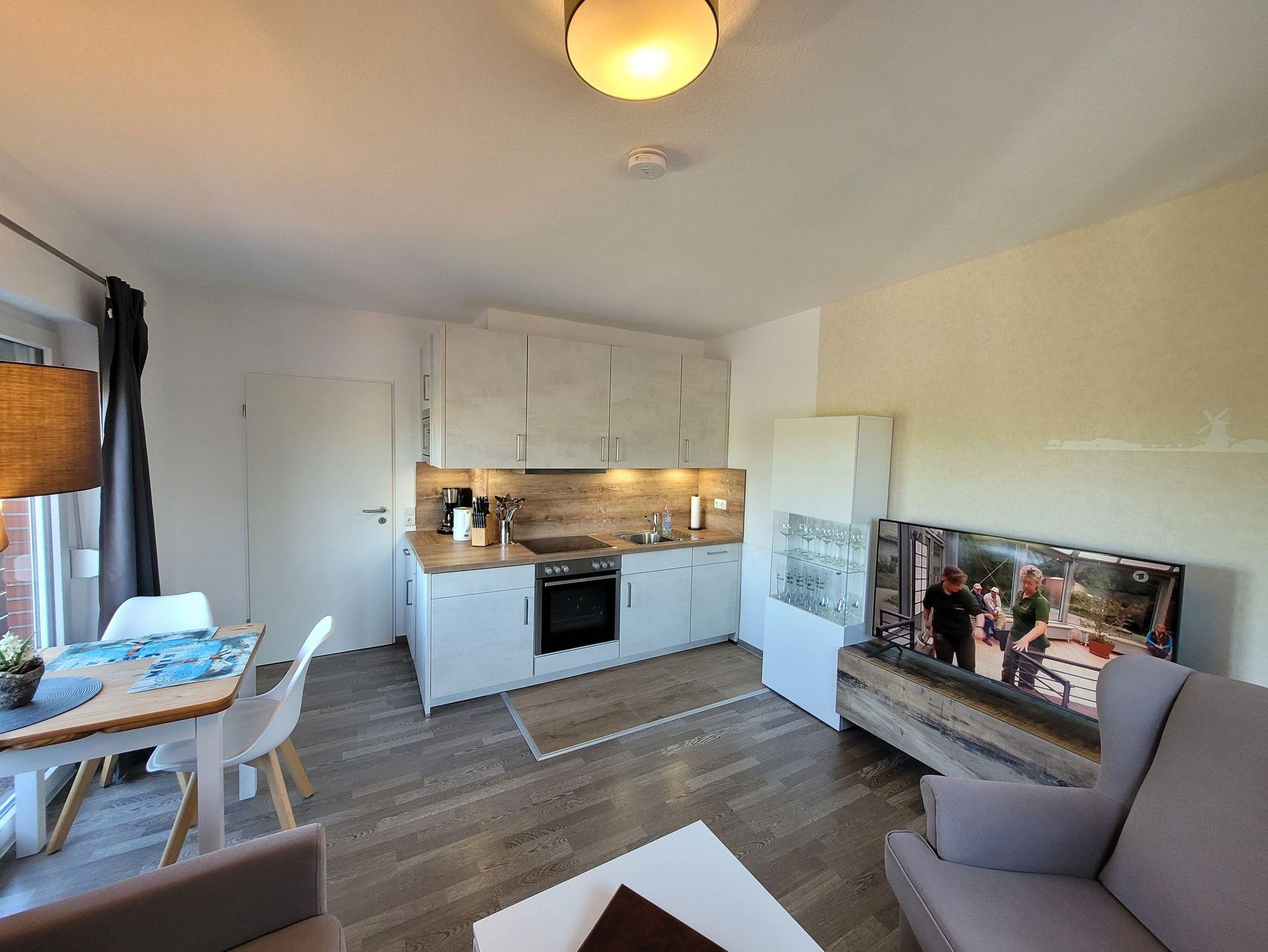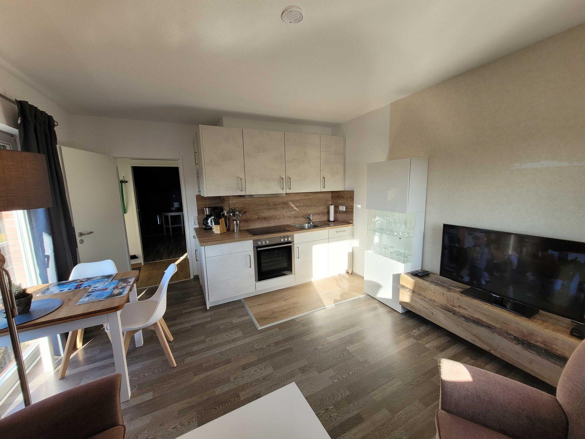Die Fewo verfügt über ein Schlafzimmer mit Bettwäsche, ein Badezimmer mit Handtüchern und Fön, einen Flachbild-Smart-TV/extra DVD-Player und eine voll ausgestattete offene Küche mit integrierter Spülmaschine und separaten Essbereich.
