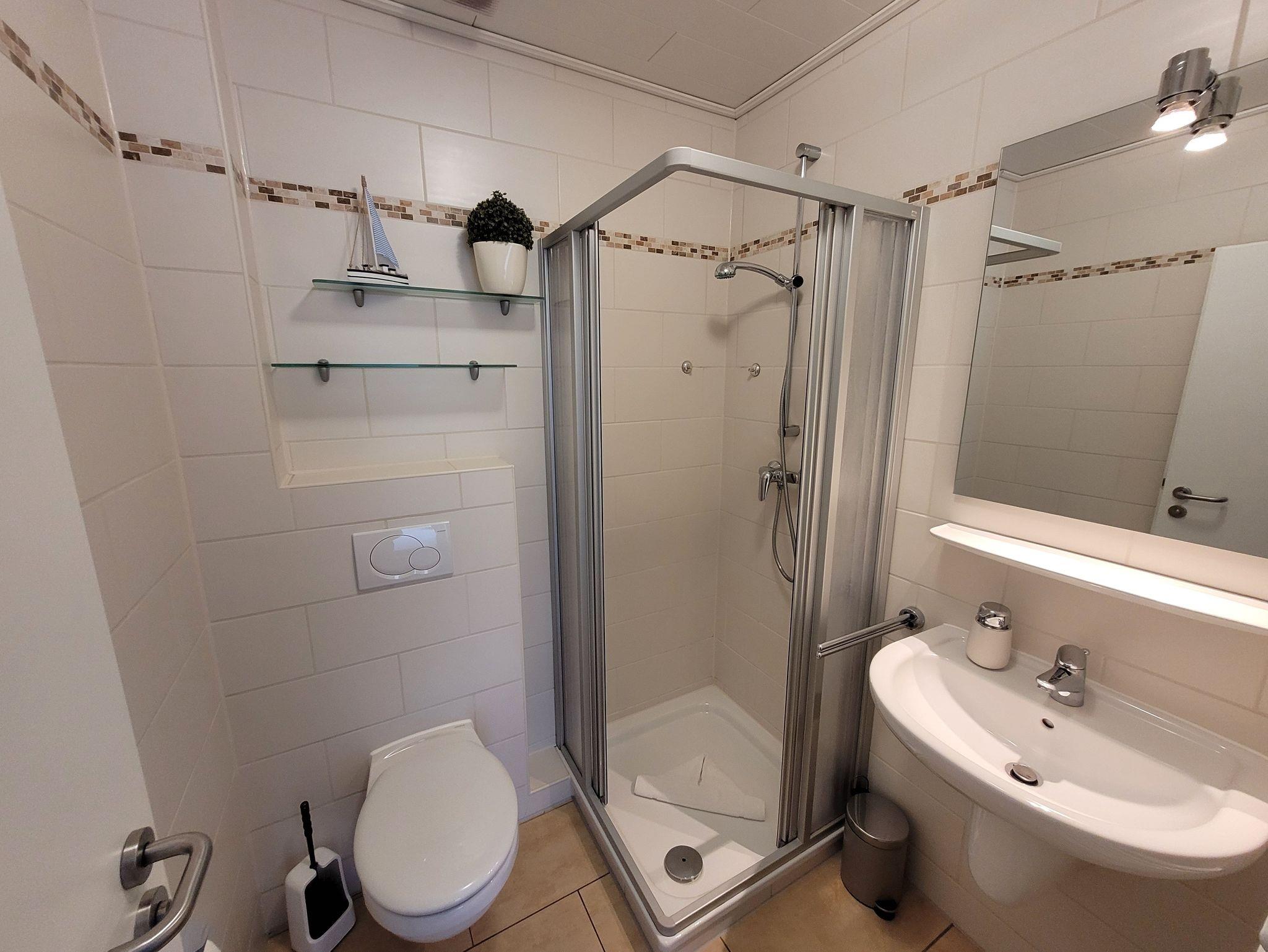 Dusche, WC, Handtücher, Haartrockner und Toilettenpapier