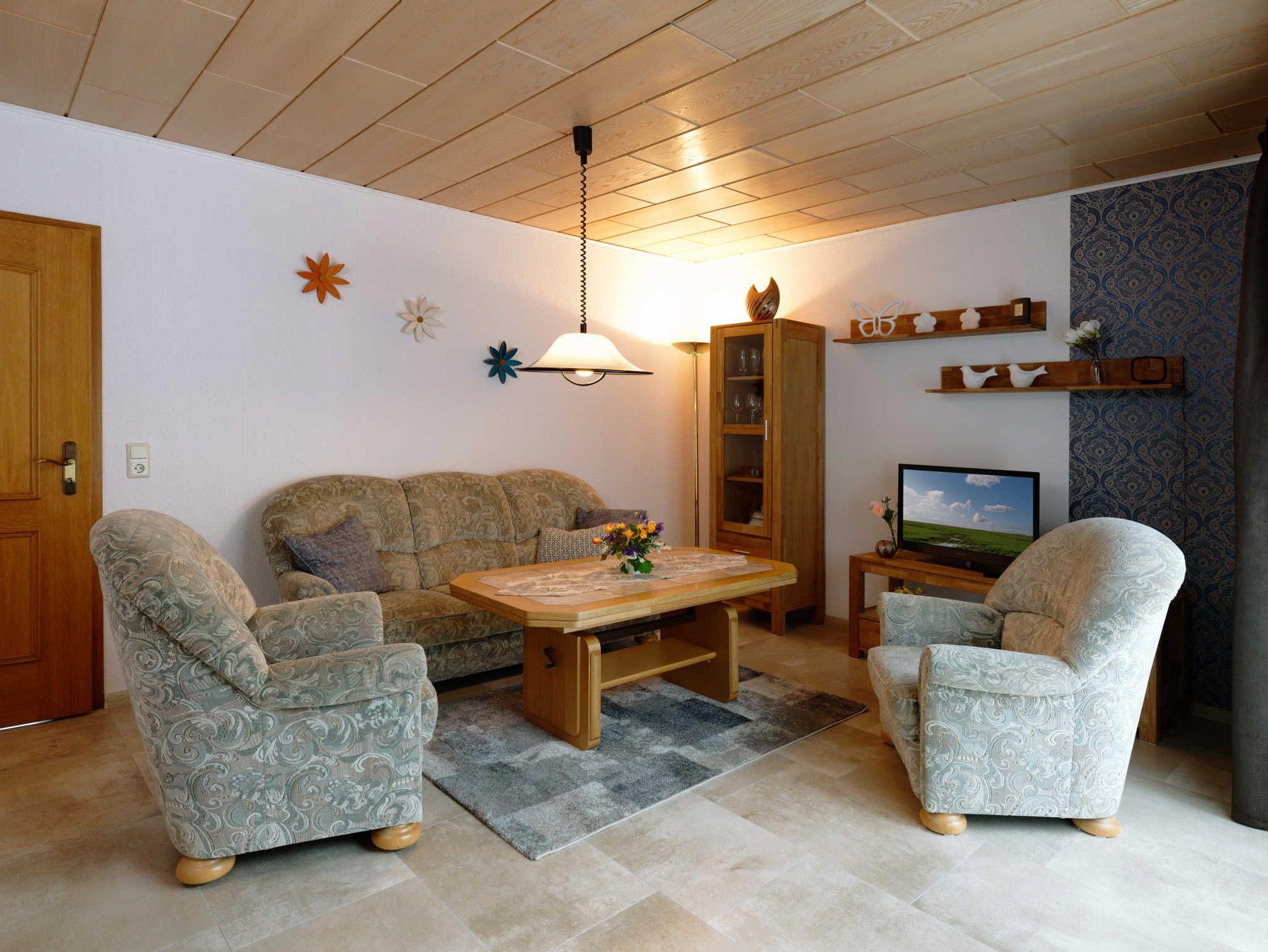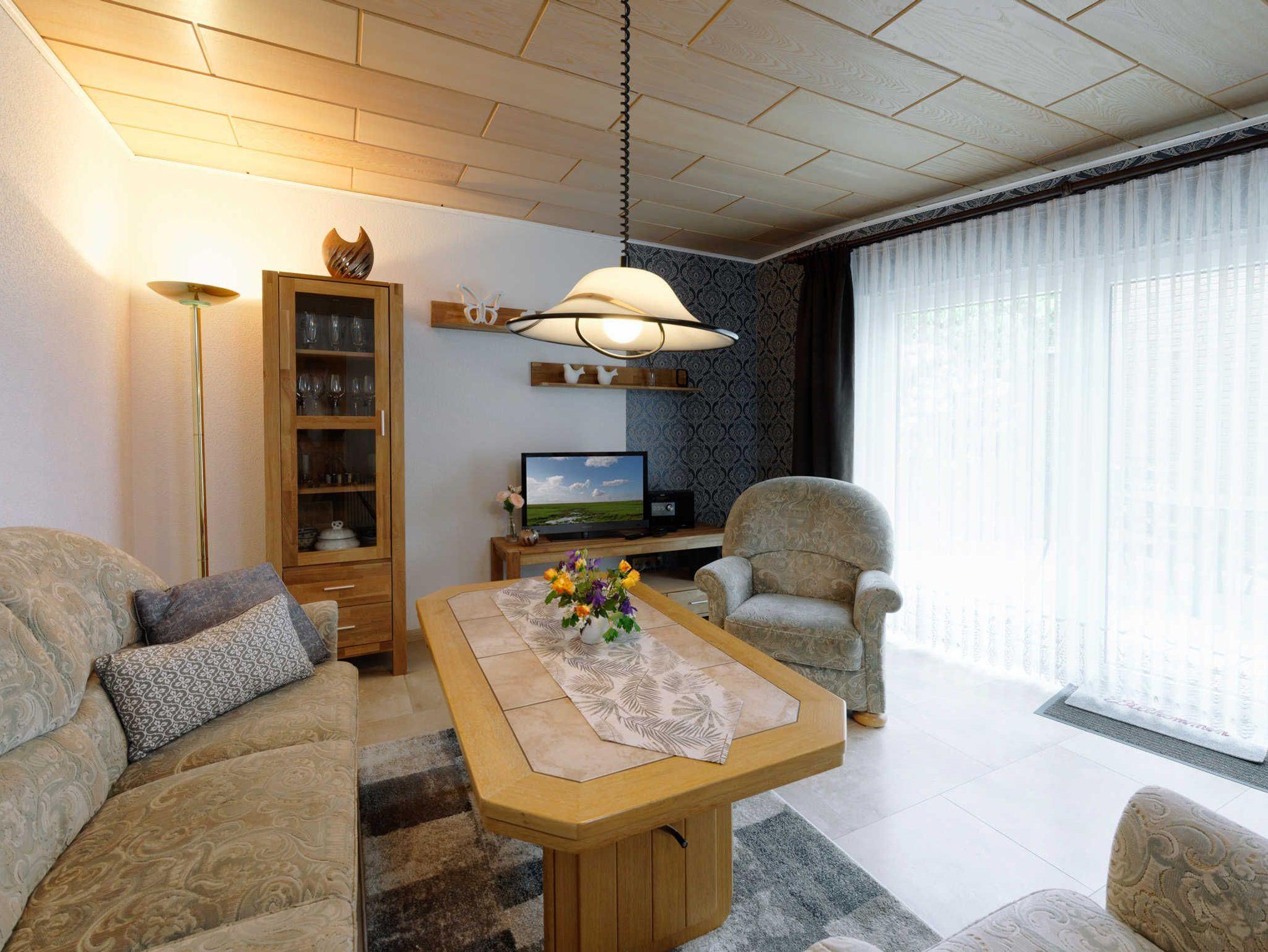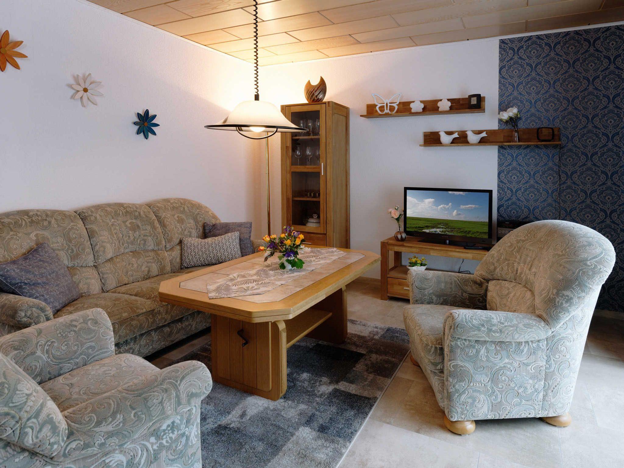 Ausstattung für 3 Personen und 1 Kleinkind: Separater Eingang, Fenster mit Rolläden, Wohnfläche ca. 62 qm. Wohnzimmer mit Digital-Sat-TV, Mini-Stereo-Anlage, geflieste Terrasse, sep. Küche mit Vollausstattung incl. Mikrowelle, Abstellraum mit Waschmaschine. Schlafzimmer mit Doppelbett sowie kleines Schlafzimmer mit Einzelbett. Bad mit Dusche/WC. Insgesamt eine sehr gemütliche Ausstattung. Kinderbett und Hochstuhl werden kostenlos gestellt.