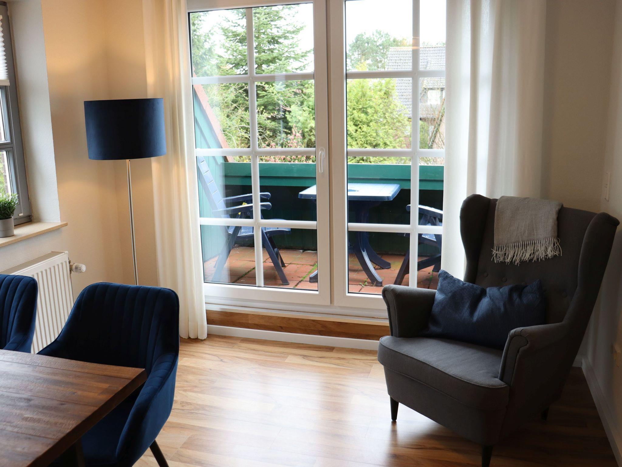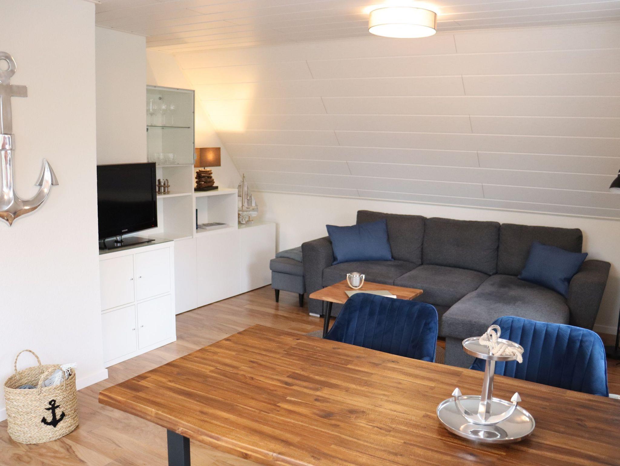 Unsere Ferienwohnung verfügt über ein großes helles Wohnzimmer mit Essbereich, einer zusätzlichen Schlafmöglichkeit und einem schönen Südbalkon zum Entspannen.