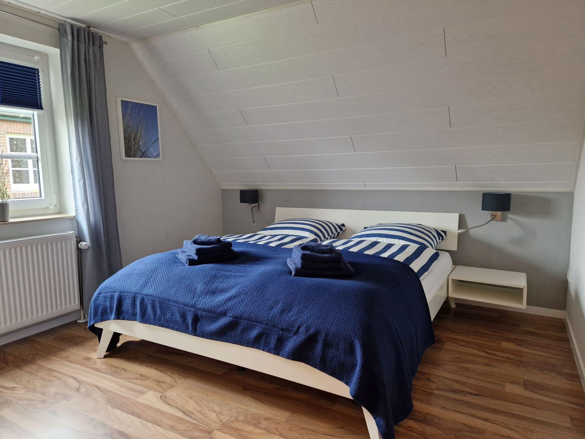 Das Schlafzimmer ist ausgestattet mit einem Massivholz-Doppelbett (180 x 200). Wäschepaket (Bettwäsche + Handtücher) 19,50 pro Person zubuchbar.