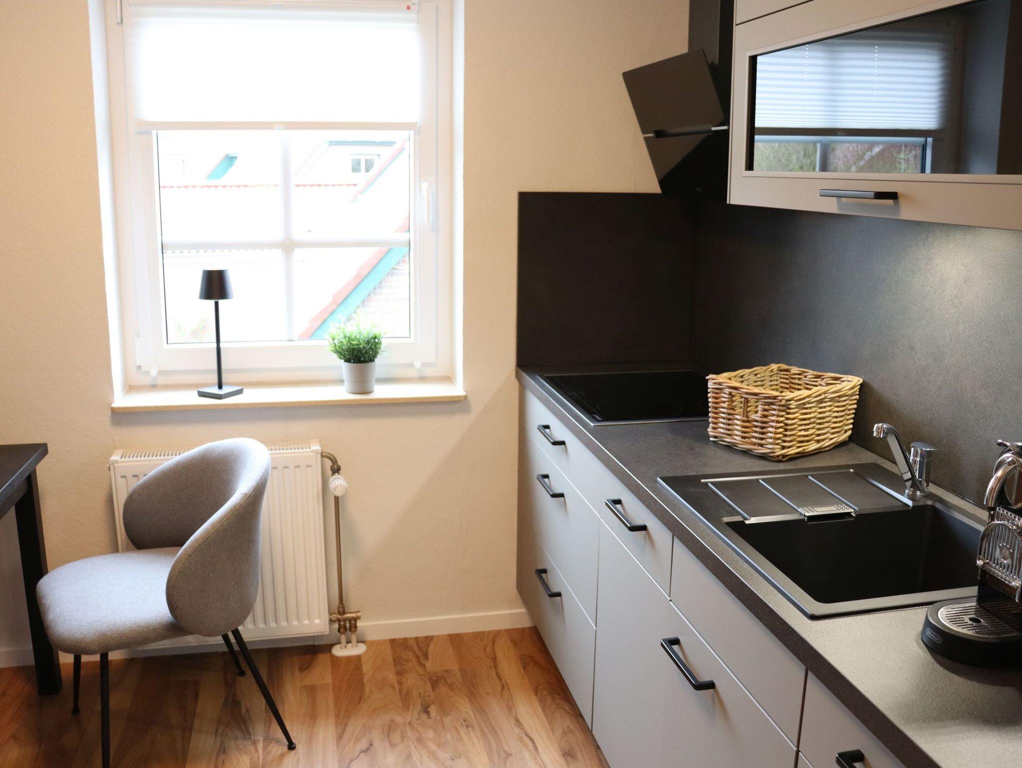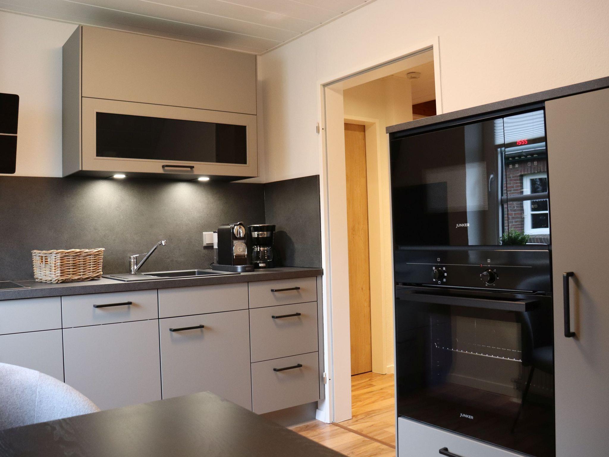 Die neue Küche ist ausgestattet mit allen notwendigen Geräten und Utensilien für den täglichen Bedarf und mit einem Frühstückstisch für zwei.