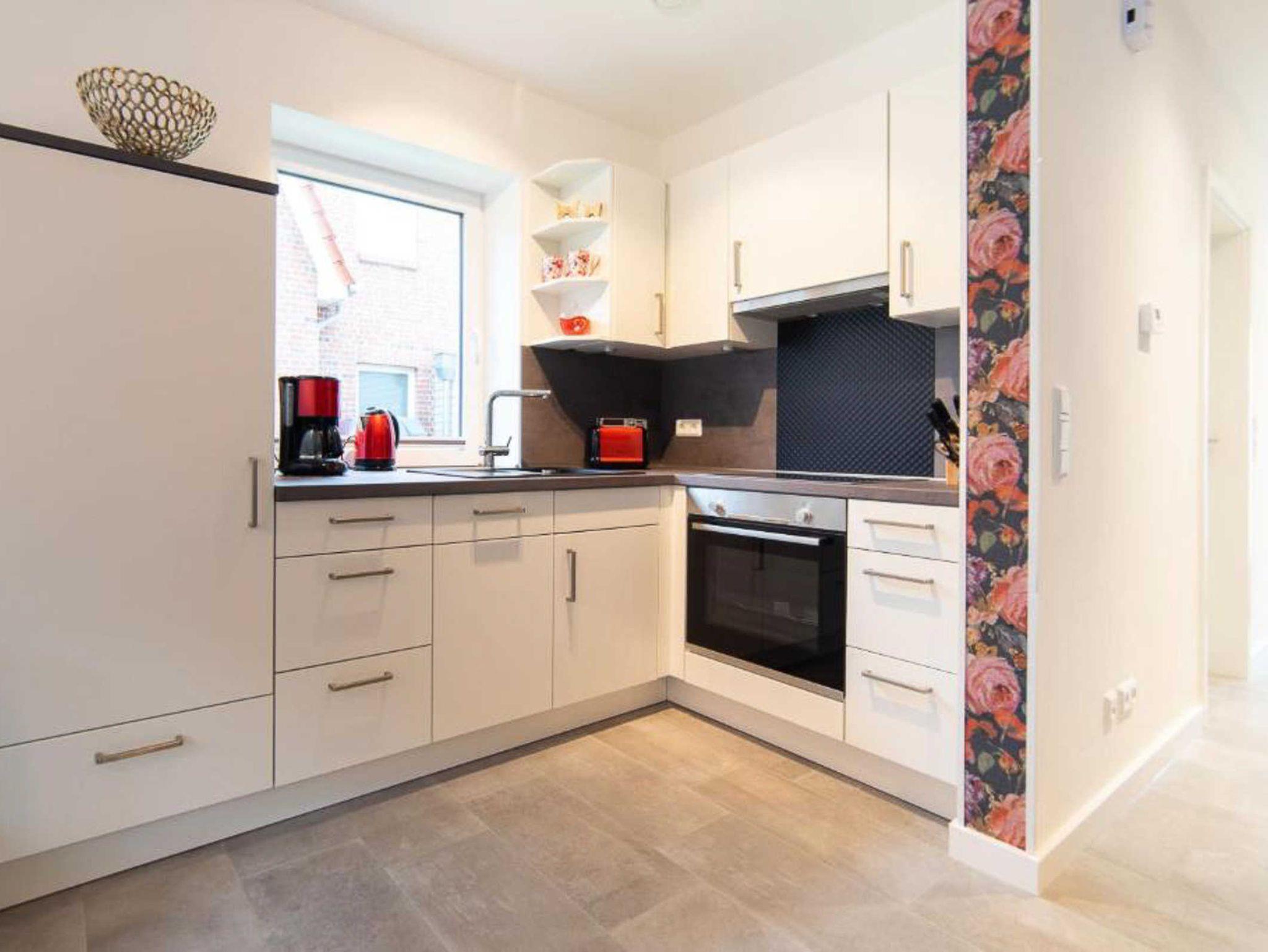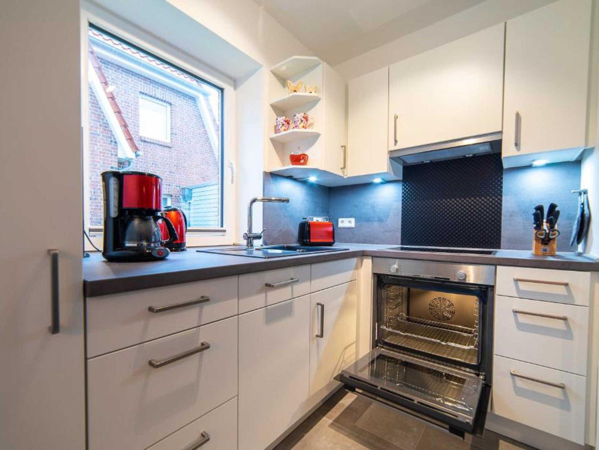 Die Küche bietet mit ihrer kompletten Ausstattung u.a. mit Spülmaschine, Kühl- Gefrierschrank-Kombi, Kaffeemaschine, Toaster, Wasserkocher und Mixer alle Annehmlichkeiten der Selbstversorgung. Der Hauswirtschaftsraum verfügt über Waschtrockner, Bügeleisen, Bügelbrett, Wäscheständer und Staubsauger. Hier ist auch ein Erste Hilfe Kasten untergebracht.