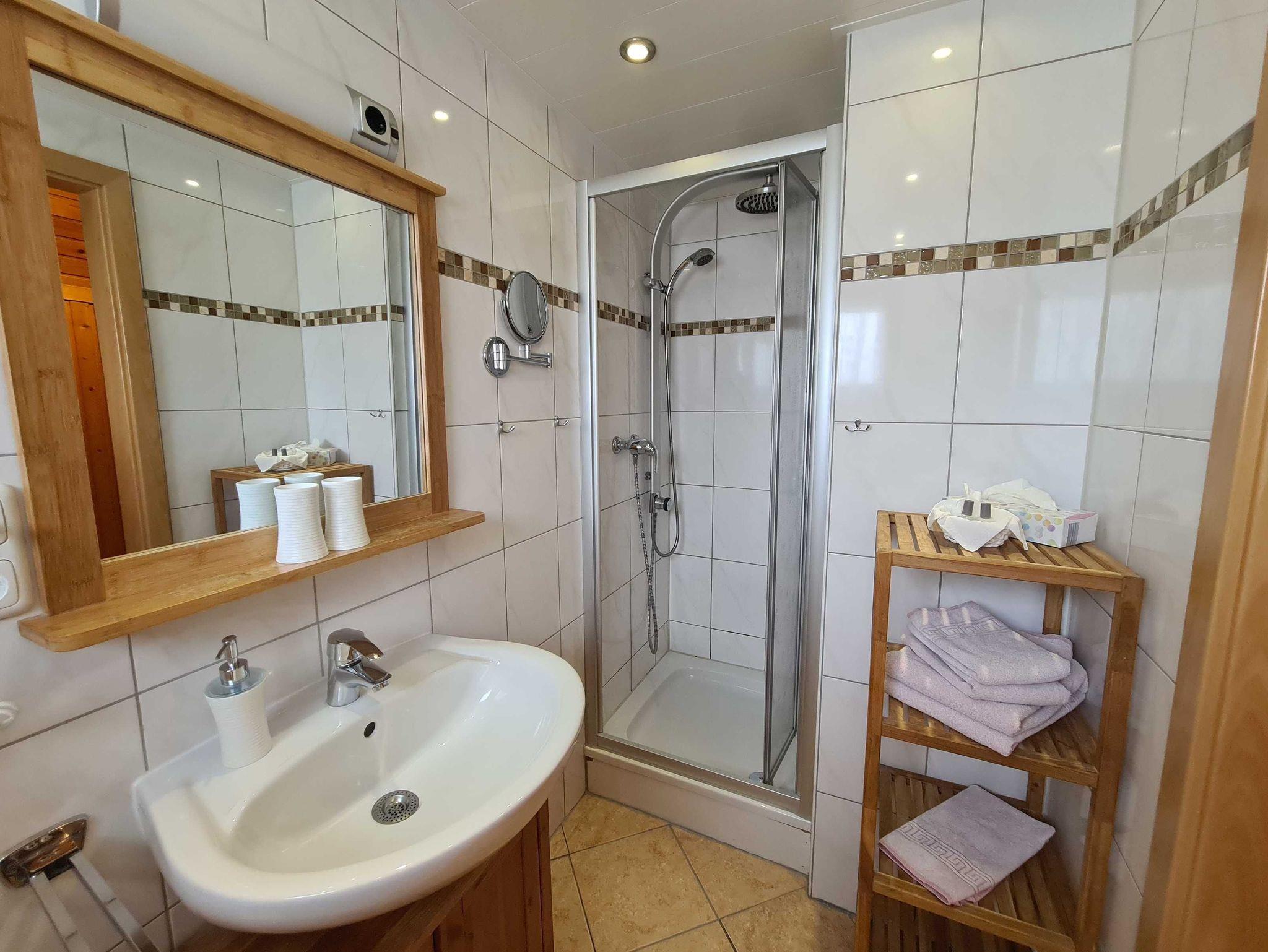 Das schicke Badezimmer mit Fußbodenheizung und Rain-Duschbrause