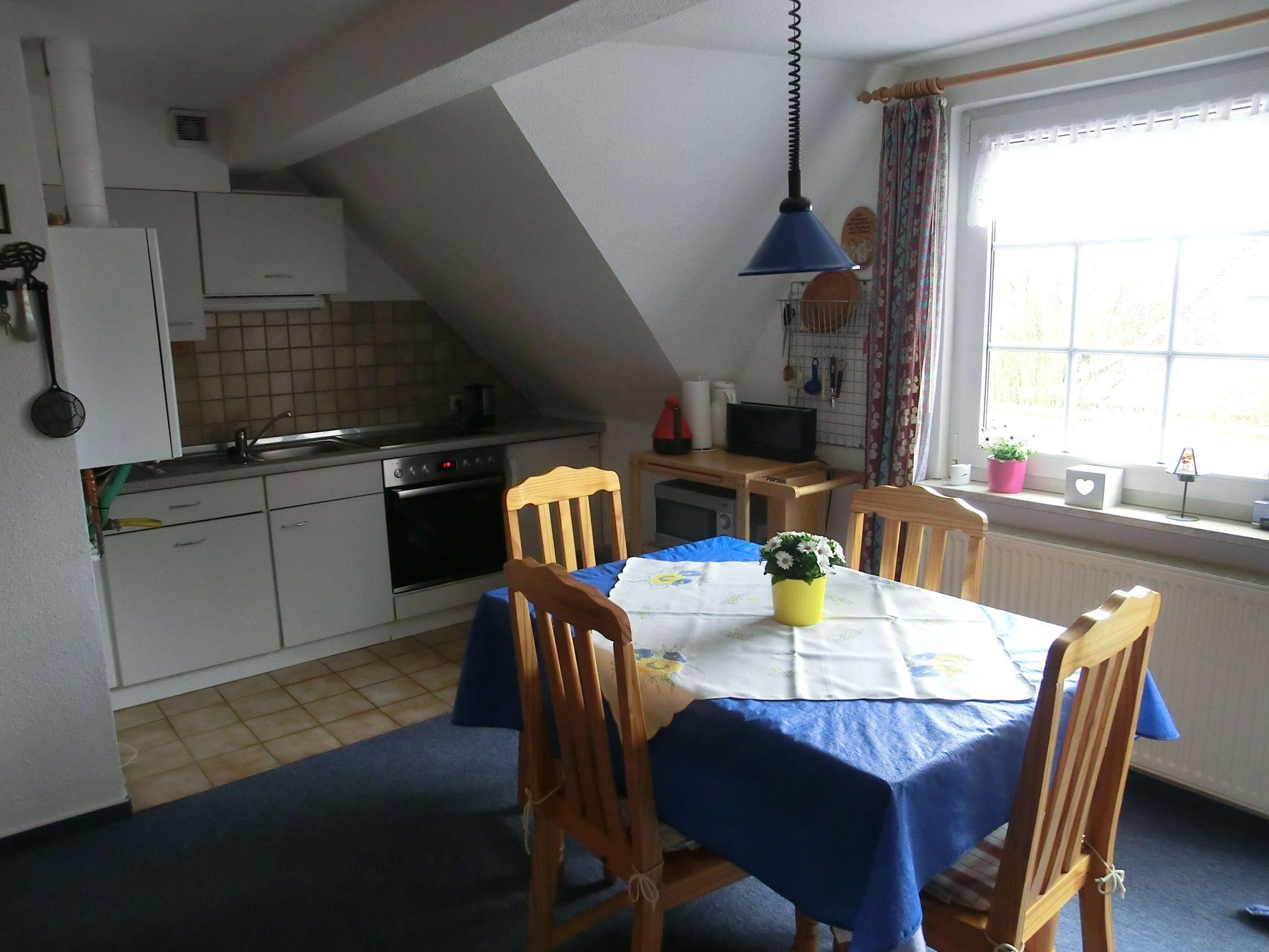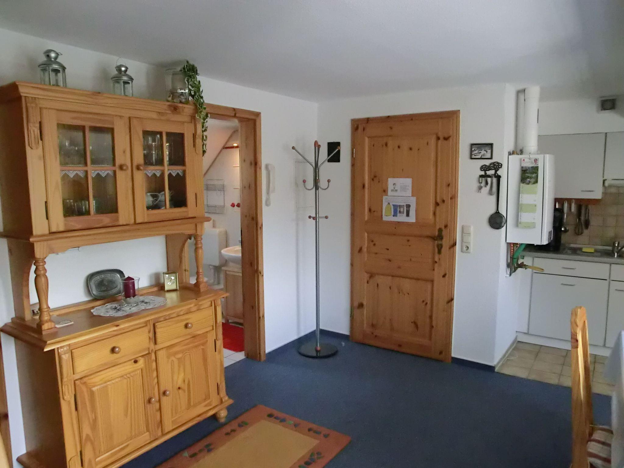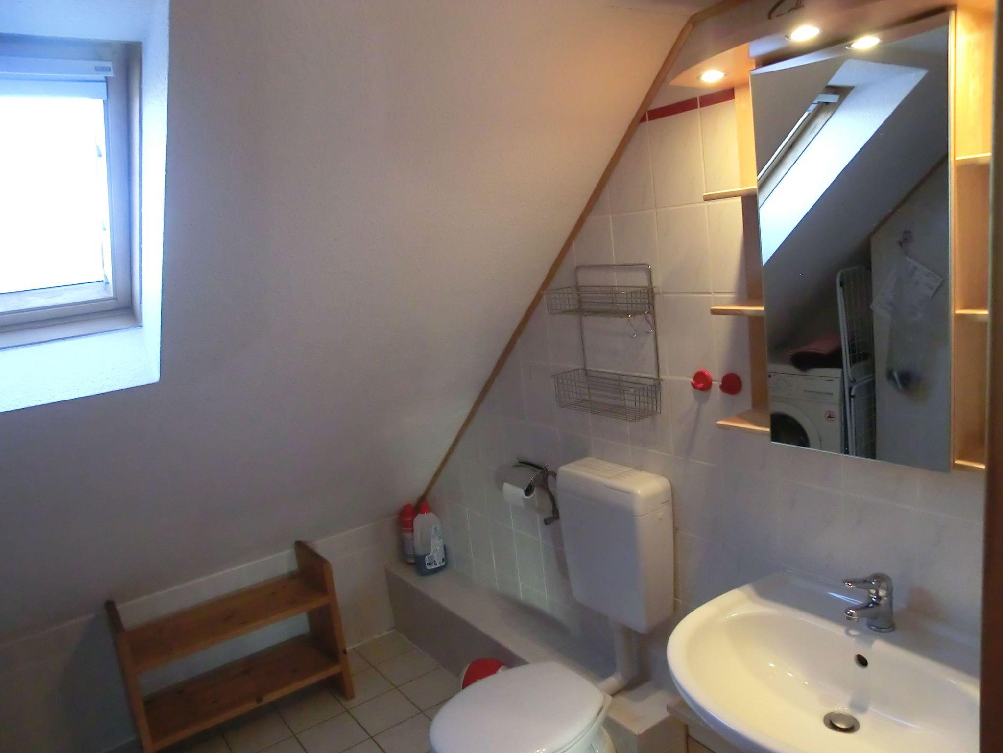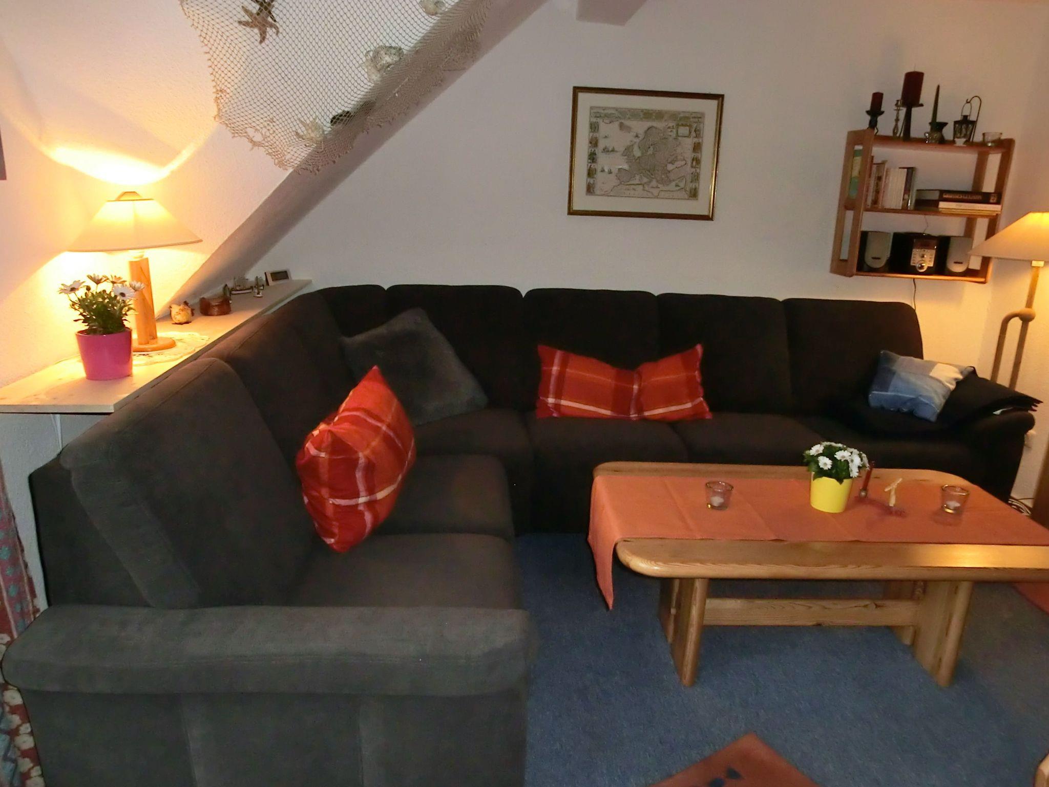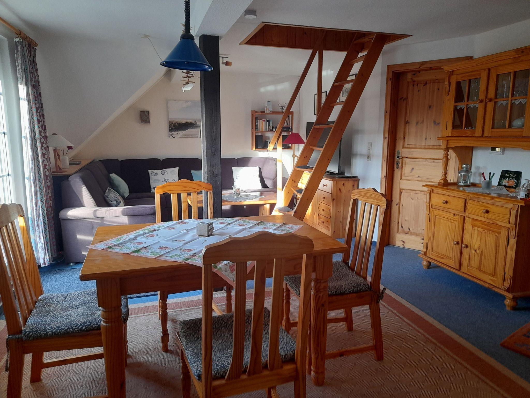 Die Dachgeschosswohnung hat eine Wohnfläche von ca. 42 m2 und befindet sich im ersten Stock. Sie besteht aus einem gemütlichen Wohnraum mit Südbalkon zum Garten gelegen,welcher über eine große Ecksitzgruppe mit Schlaffunktion verfügt, falls der schnarchende Partner mal das Schlafzimmer verlassen muß, Küchenzeile mit Essplatz, geräumiges Duschbad/WC mit Waschmaschine, Schlafzimmer mit Doppelbett, offene Schlafkoje im Spitzboden, welche über eine Treppe im Wohnzimmer zu erreichen ist. Ein Abstellraum, ein abschliessbares Gartenhaus und ein der Wohnung zugeordneter PKW-Stellplatz (Nr. 6), sowie Kinderreisebett und Hochstuhl stehen zur Verfügung.