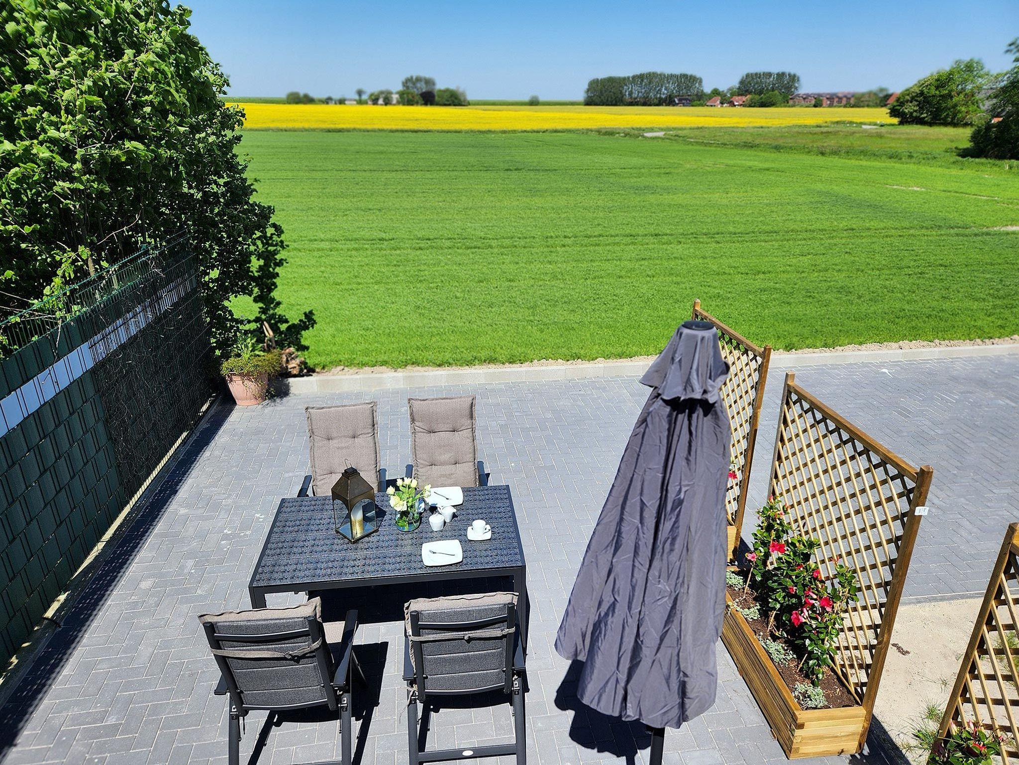 Moderne Ferienwohnung Wattenwind in Carolinensiel mit Terrasse und Blick auf Felder, nahe Hafen und Windmühle.