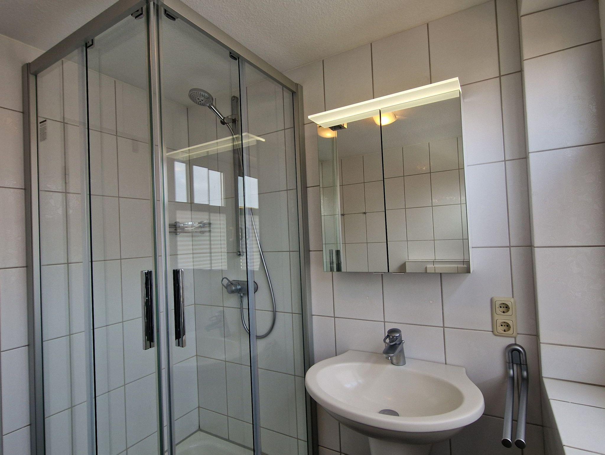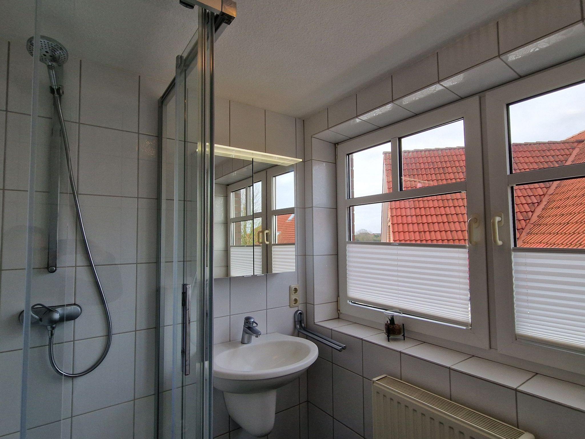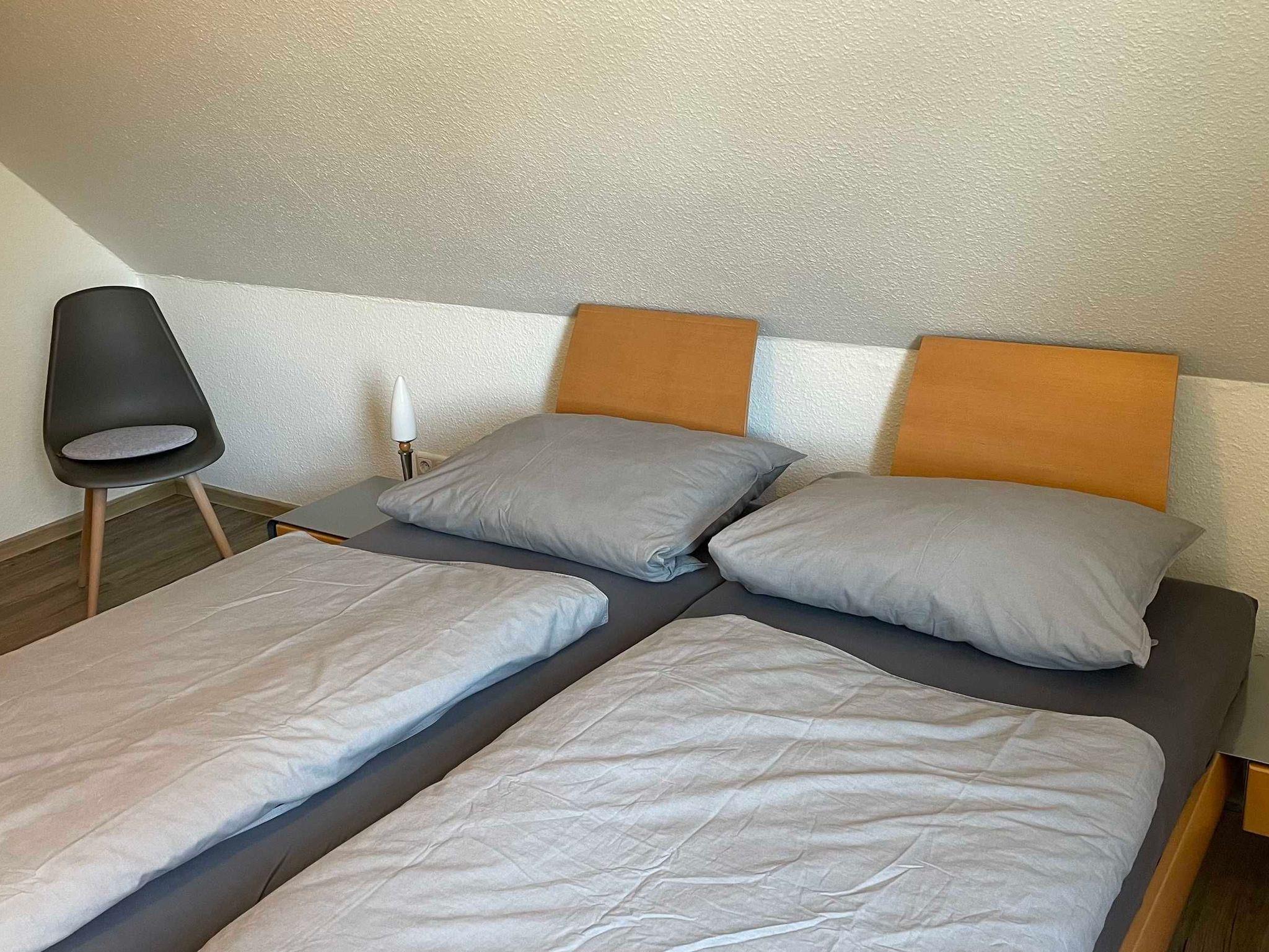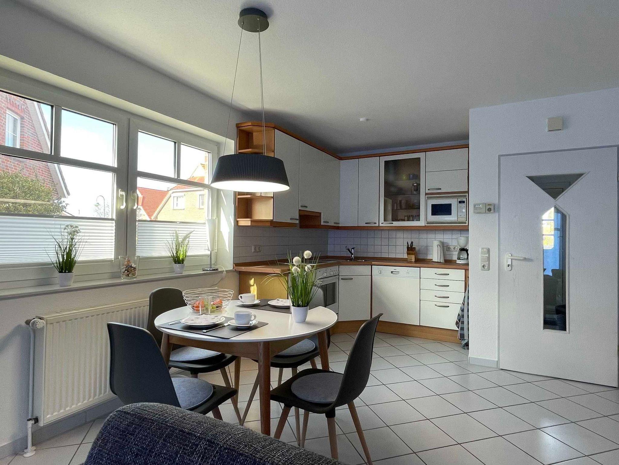 Im Erdgeschoss des ca. 70m² großen Reihenhauses befinden sich ein großzügiger und geschmackvoll eingerichteter Wohn- und Essbereich mit einer Küchenzeile sowie ein Gäste-WC. Vom Wohnraum führt eine offene Treppe ins Obergeschoss. Hier stehen ein Schlafzimmer mit einem Doppelbett, ein Schlafzimmer mit zwei Einzelbetten und ein Duschbad mit WC zur Verfügung. Die Böden im Erdgeschoss sind mit Fliesen ausgelegt.
