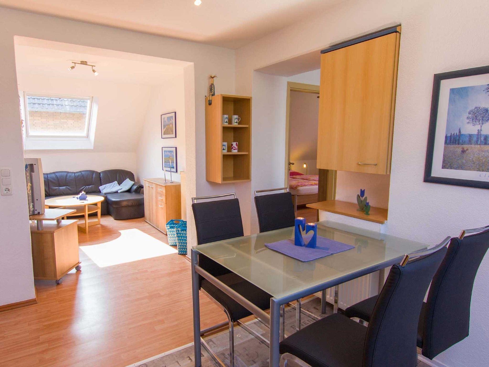 Schöne, ca. 70qm große Nichtraucher-Ferienwohnung im Obergeschoss, geeignet für 4 Personen und 1 Kleinkind. Große (ca. 16qm) Dachterrasse mit Gartenmöbeln. Großzügiger, offener Wohn- und Küchenbereich mit gemütlicher Sitzgruppe, SAT-TV, Essecke, Spülmaschine, Backofen usw. Duschbad mit Dusche/WC. 2 Schlafzimmer mit Doppelbett, für 1 Kleinkind sind Kinderbett und Hochstuhl vorhanden. Waschmaschine zur gemeinsamen Nutzung. Haustiere sind nicht erlaubt. W-Lan kostenlos!