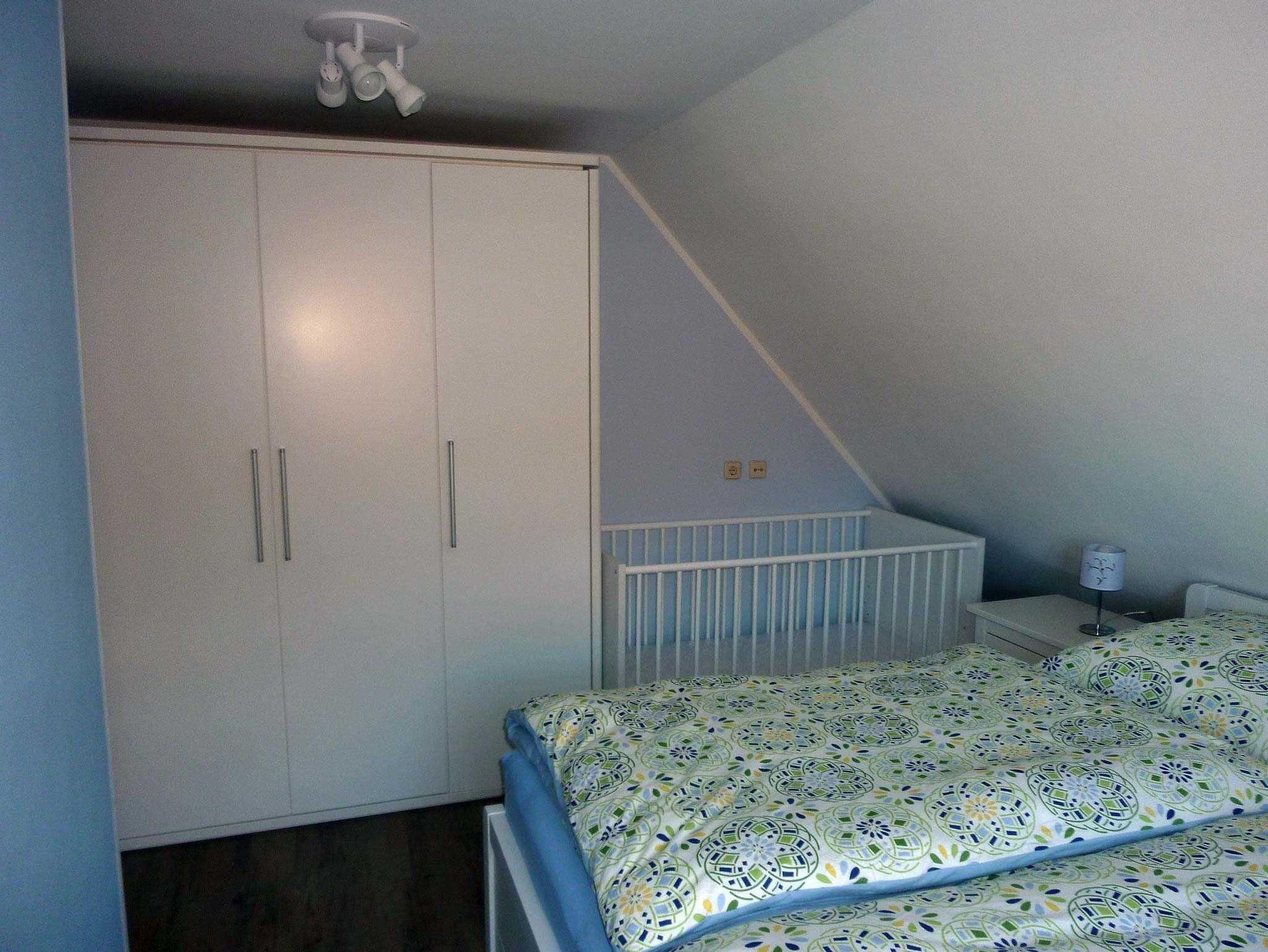 1 Schlafzimmer mit Doppelbett und großzügigem Kleiderschrank, Flachbild-TV, Kinderbett (1,40 m), Ganzkörperspiegel, Rolläden. 1 Schlafzimmer mit zwei Einzelbetten, Einbauschrank, Rolläden, mehrere Ablagen, Hocker und Spiegel