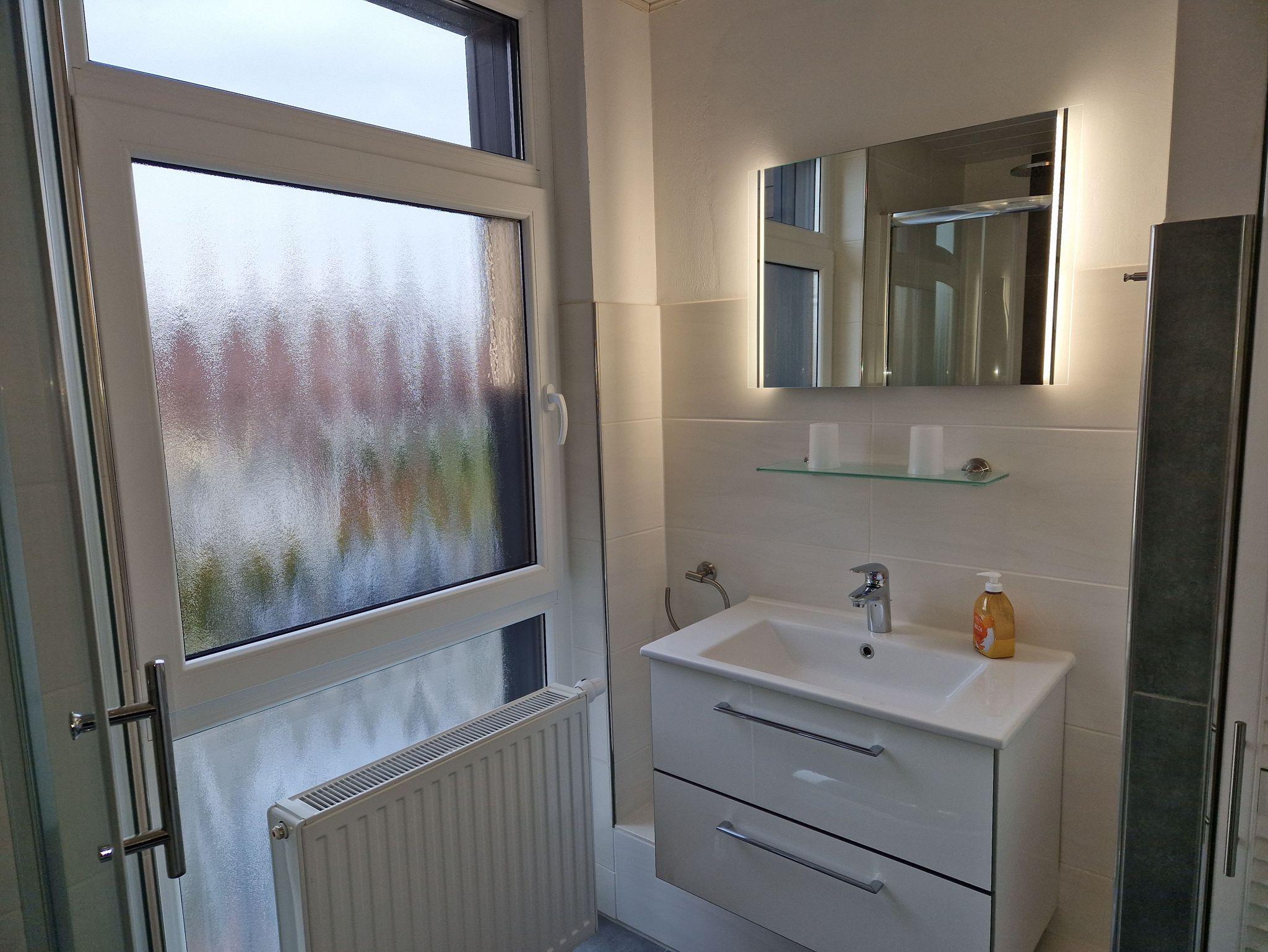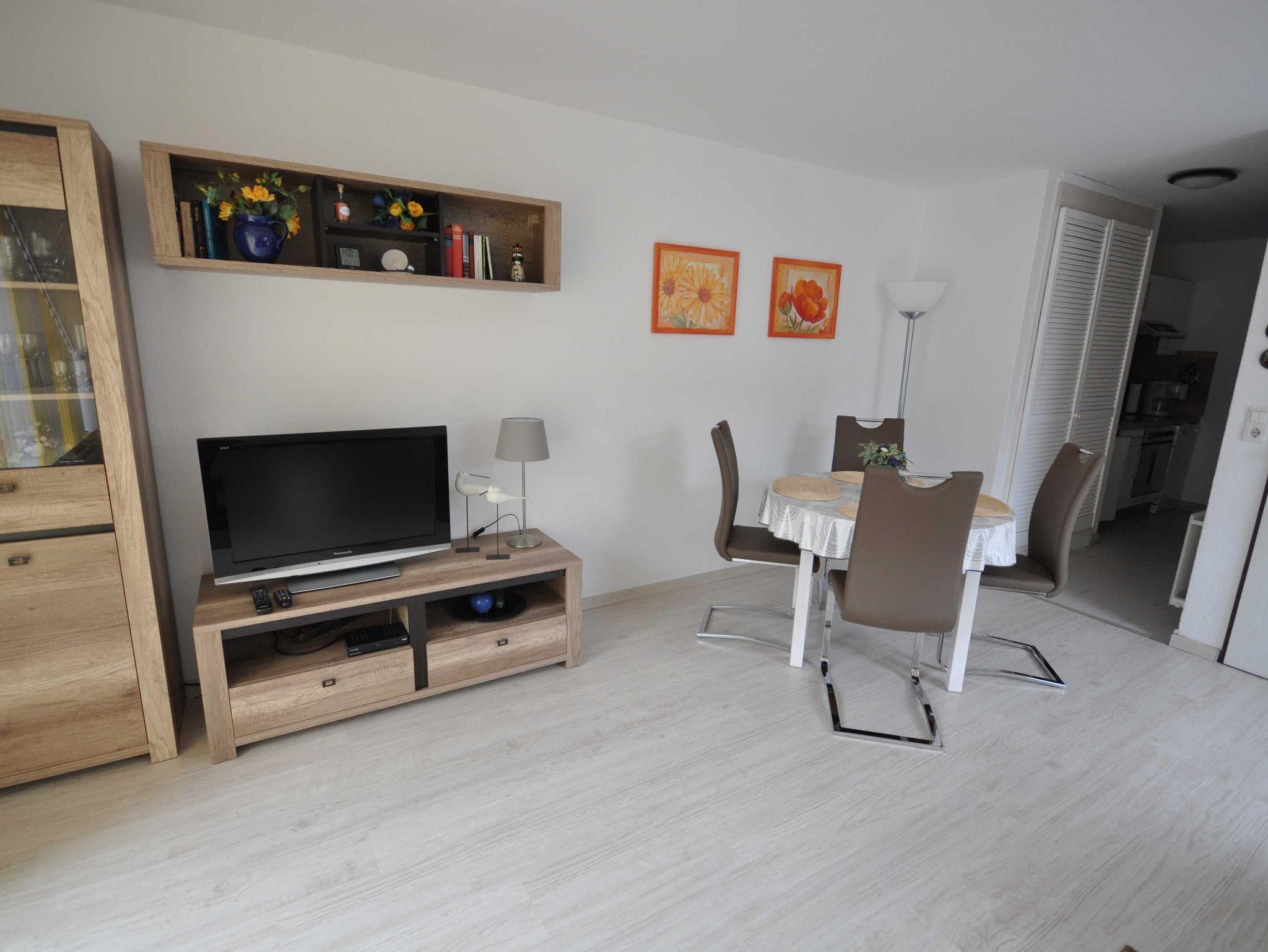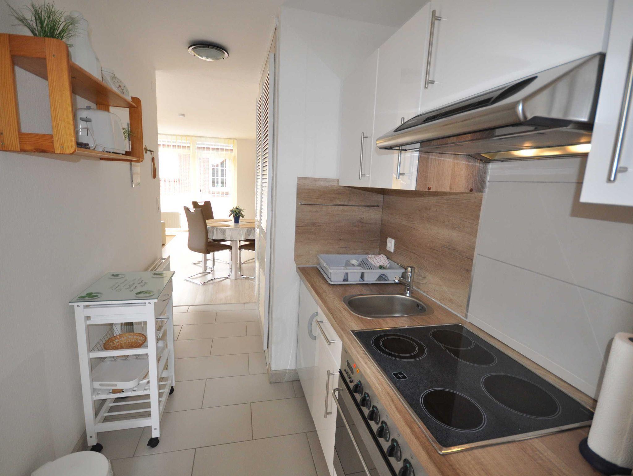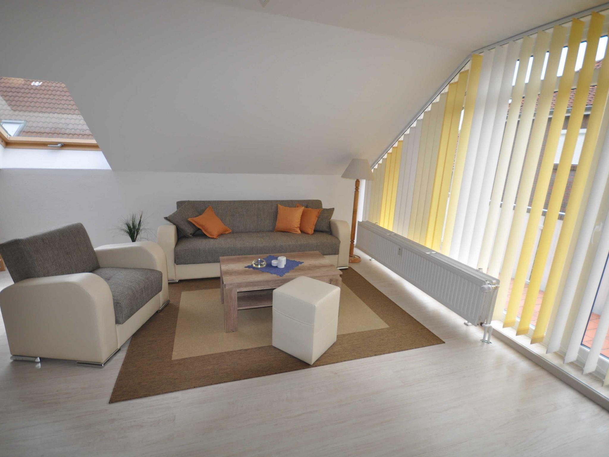 Diese etwa 48m² große, renovierte Obergeschosswohnung mit Balkon befindet sich in der 1. Etage und verfügt über einen lichtdurchfluteten Wohnbereich mit Couchgarnitur, einem Esstisch und eine integrierte Küchenzeile. Außerdem ist die Wohnung mit einem separaten Schlafzimmer mit einem Doppelbett, sowie mit einem im März 2018 sanierten Duschbad ausgestattet und bietet daher Platz für 2 Personen und ein Baby/Kleinkind. Auf den Böden sind Fliesen bzw. Laminat verlegt.