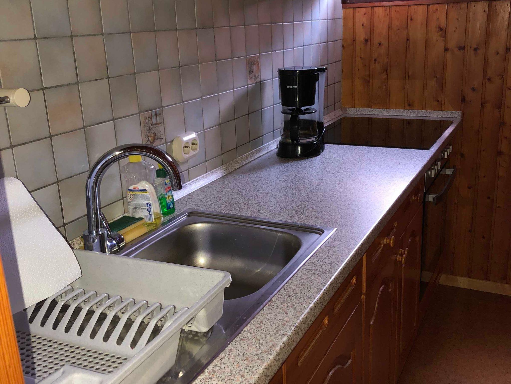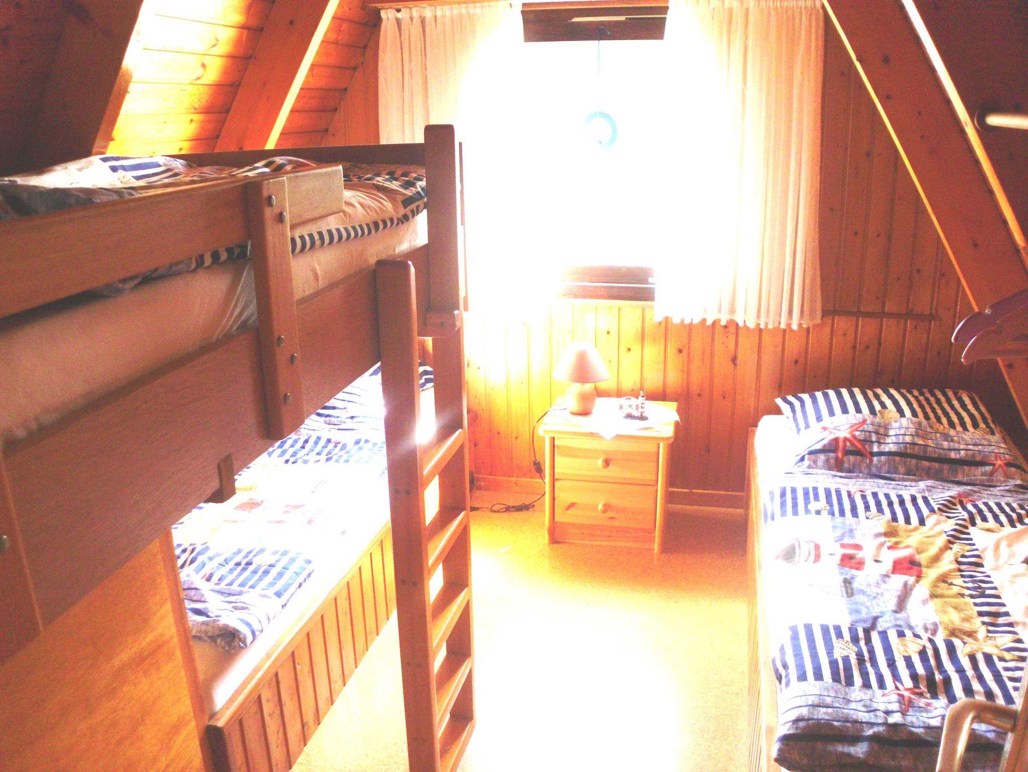 Das schöne große Wohnzimmer mit Panoramafenster in den Garten vermittelt durch die Holzwände und Holzdecken eine warme Atmosphäre. Das Haus verfügt über eine komplett ausgestattete Küche mit Kühlschrank, Backofen, Herd, Mikrowelle und allen üblichen Küchenutensilien wie Toaster, Kaffeemaschine, Wasserkocher, Geschirr und Besteck. Im Oberschoss befinden sich zwei getrennte Schlafzimmer mit 5 Schlafmöglichkeiten und einem Kinderbett. Für unsere kleinen Gäste ist ein Hochstuhl, Schaukel, Sandkiste mit Sandspielzeug und Spiele für Regentage vorhanden.