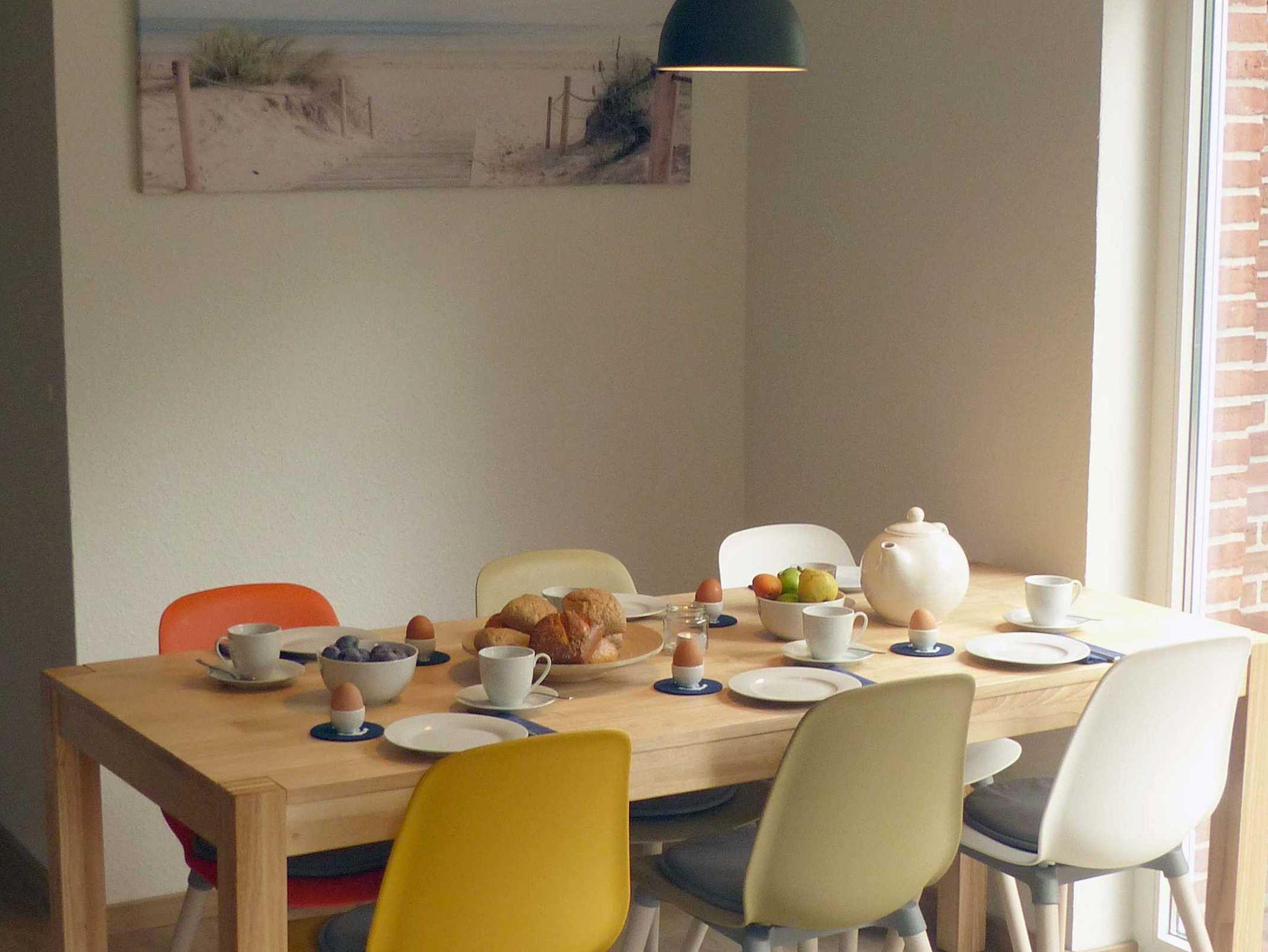 Im Erdgeschoss verfügt das Haus über ein großes, helles Wohnzimmer mit Sofalandschaft und 50 Zoll großem SAT-TV, Essbereich mit massivem Holzesstisch sowie einer separaten, sehr gut ausgestatteten Küche (mit Mikrowelle und Spülmaschine). Weiterhin befindet sich im EG ein neues Gäste-WC mit Handwaschbecken. Vom Wohnzimmer aus haben Sie Zugang zur sonnigen Terrasse sowie dem großen Garten. Im 1. OG finden Sie zwei Schlafzimmer (eins davon mit Doppelboxspringbett und das zweite mit zwei Einzelbetten) sowie ein helles und modernes Bad mit übergroßer Dusche. Im Dachgeschoss befindet sich ein Schlafstudio mit zwei weiteren Einzelbetten.