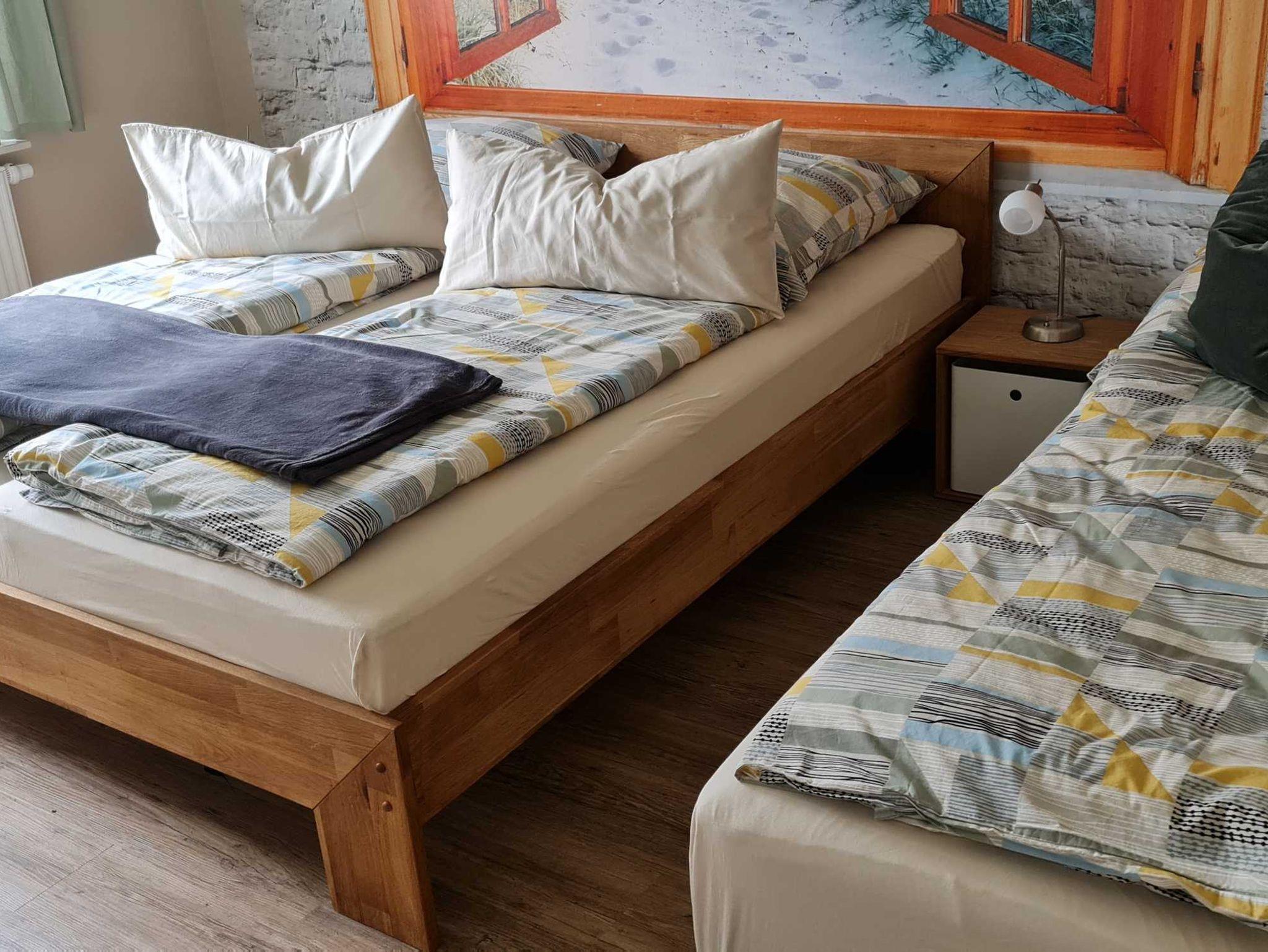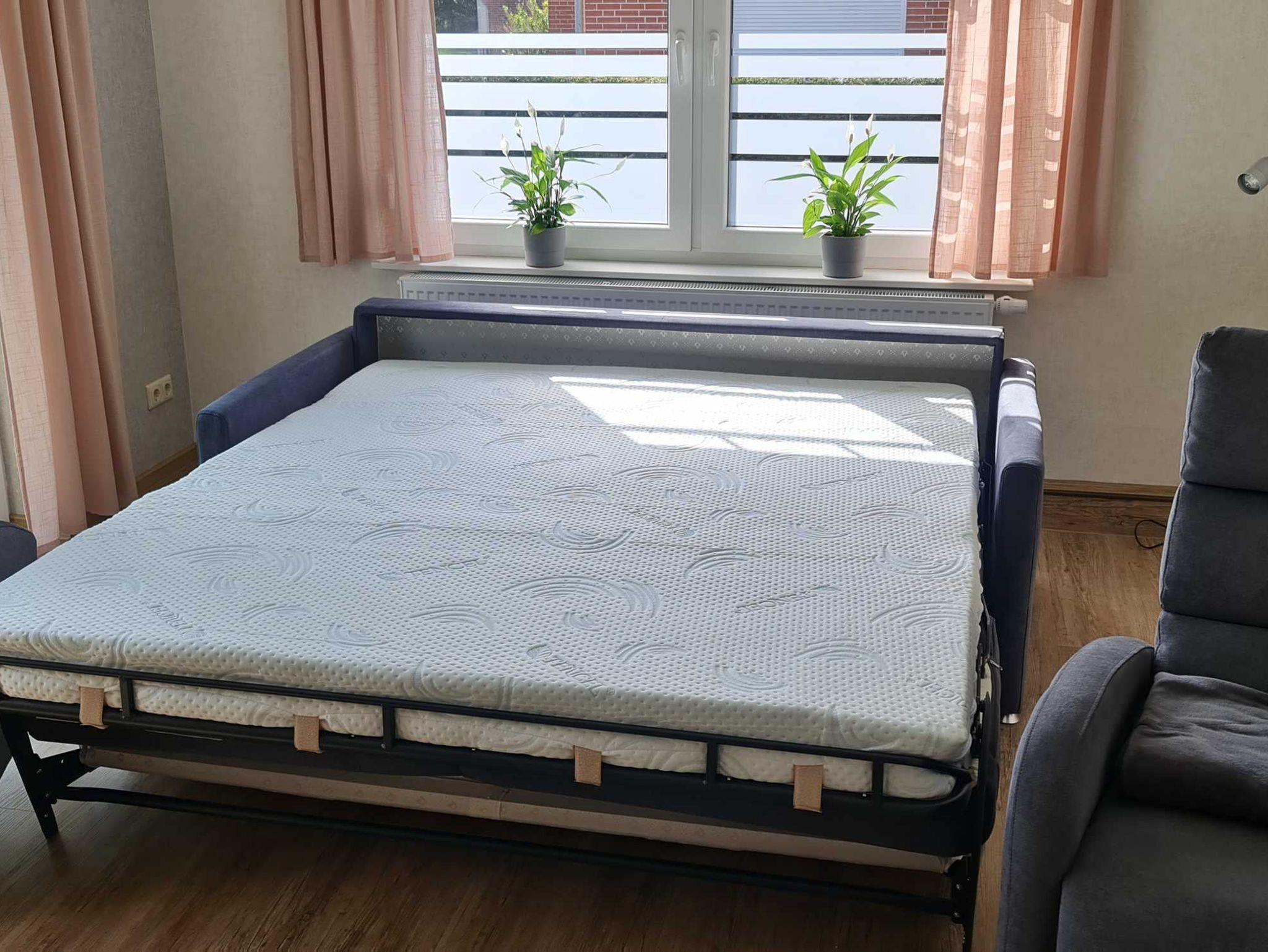 Sie verfügt über ein Schlafzimmer mit Ehebett (1,80mx2,00m) und Schlafcoach (0,80mx2,00m) und einem hochwertigem Schlafsofa (1,70mx2,00m) im Wohnzimmer.