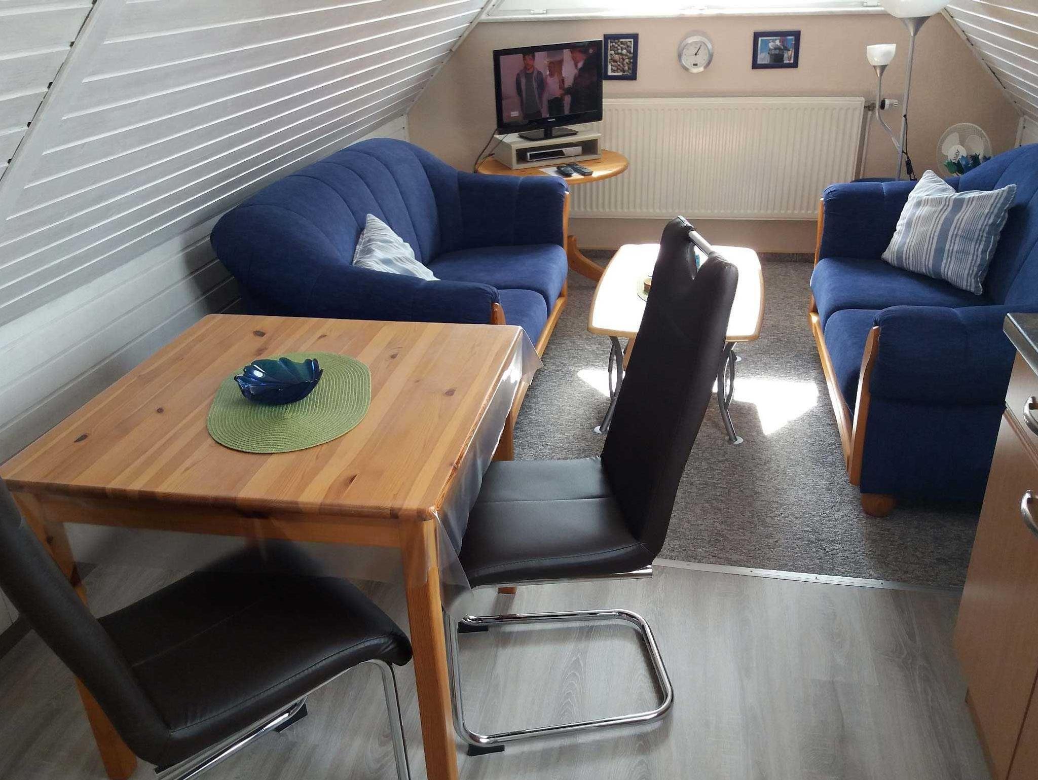 Gemütliche Ferienwohnung für 1 Person im Dachgeschoss. Wohnzimmer mit Sat-TV und kleiner Küchenzeile mit Essplatz. Ein kuscheliges Schlafzimmer mit großem Bett. Helles Duschbad mit Dachfenster und WC.