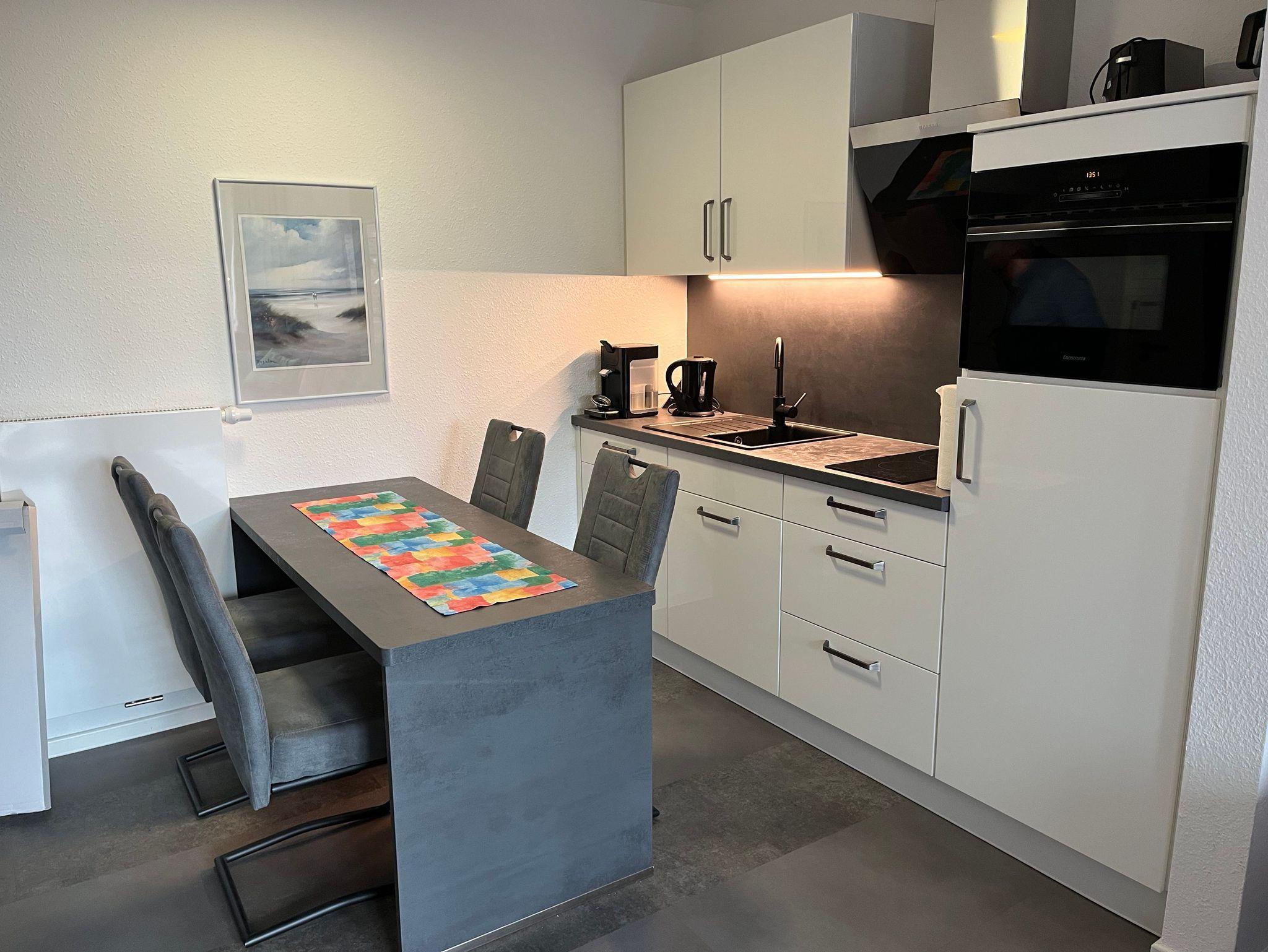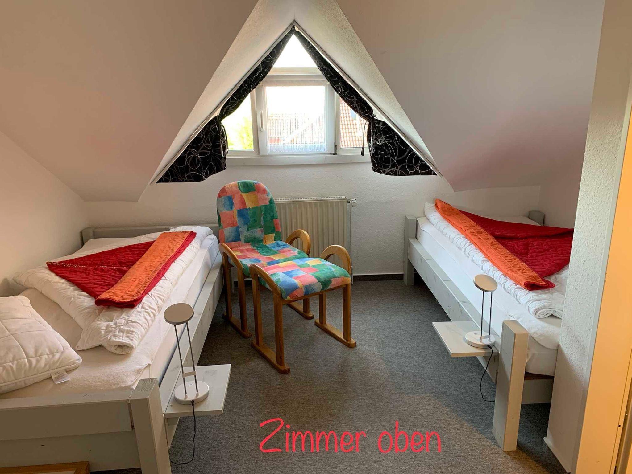 Zur ansprechenden Ausstattung der hellen, gemütlich und modern eingerichteten Räume im 1. Obergeschoß gehören ein großer Raum mit Wohnzimmer, Küchenzeile und Essplatz sowie dem Ausgang auf einen Südbalkon mit 4 Stühlen und einem Tisch. Zum Wohnzimmerbereich gehört eine Sitzgruppe, eine Schrankwand mit Kabel-TV mit Musikanlage. Ein Internet-Anschluss sowie eine Tel-Flat steht zur Verfügung. Eine kompl. eingerichtete weiße Kücheneinbauzeile mit Mikrowelle, Herd, Spüle, Spülmaschine, reichlich Geschirr, Besteck und allem weiteren Küchenzubehör passt sich harmonisch in den Wohnbereich ein. Der Essplatz besteht aus einem Tisch mit 4 Stühlen und einem Kinderhochstuhl. Von hier erschließt sich über eine Raumspartreppe das Kinderzimmer mit 2 Betten (0,90x2,00 m), Spiele sowie diverse Kinderbücher sind ebenfalls vorhanden. Der Schlaftrakt mit Duschbad ist durch einen kl. Flur mit Spiegel und Abstellschrank vom Wohnraum getrennt. Es beinhaltet ein Doppelbett 2x2 m, ein Kinderbett und einen Kleiderschrank sowie 2 geräumige Nachttische und Ablageregale.