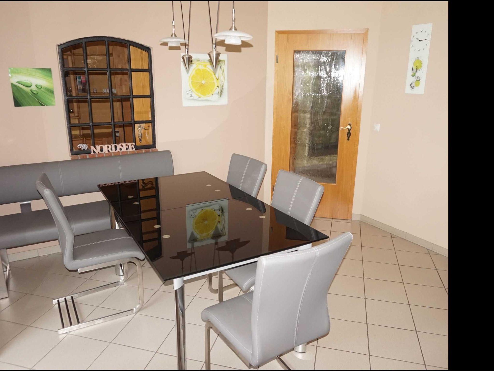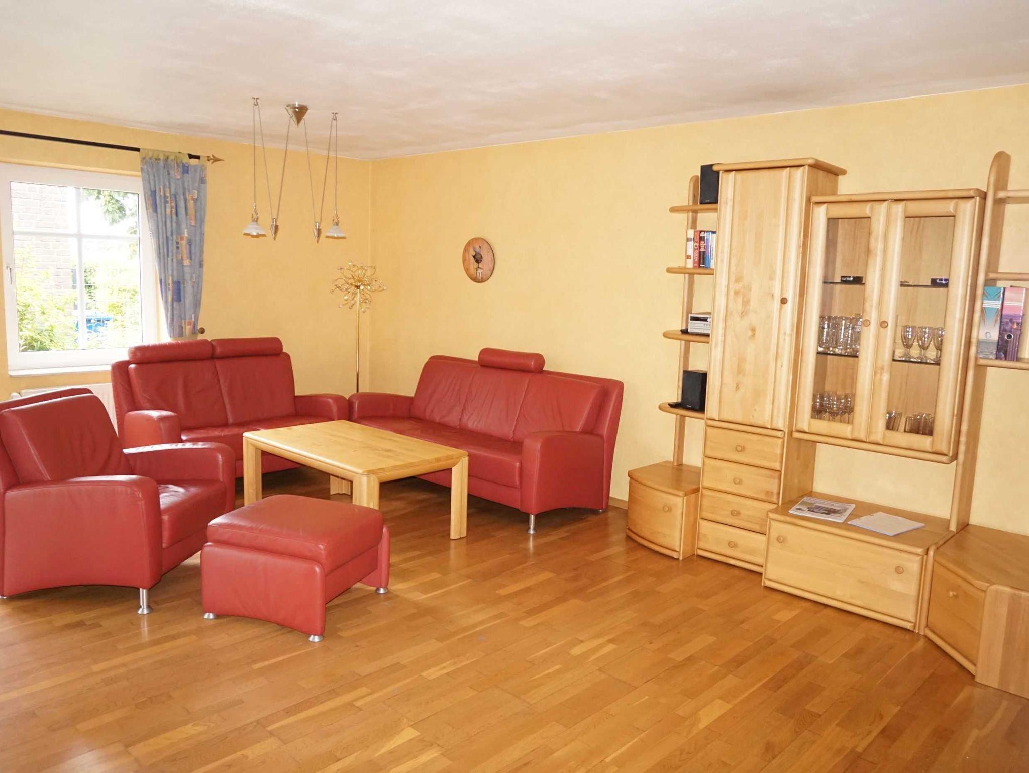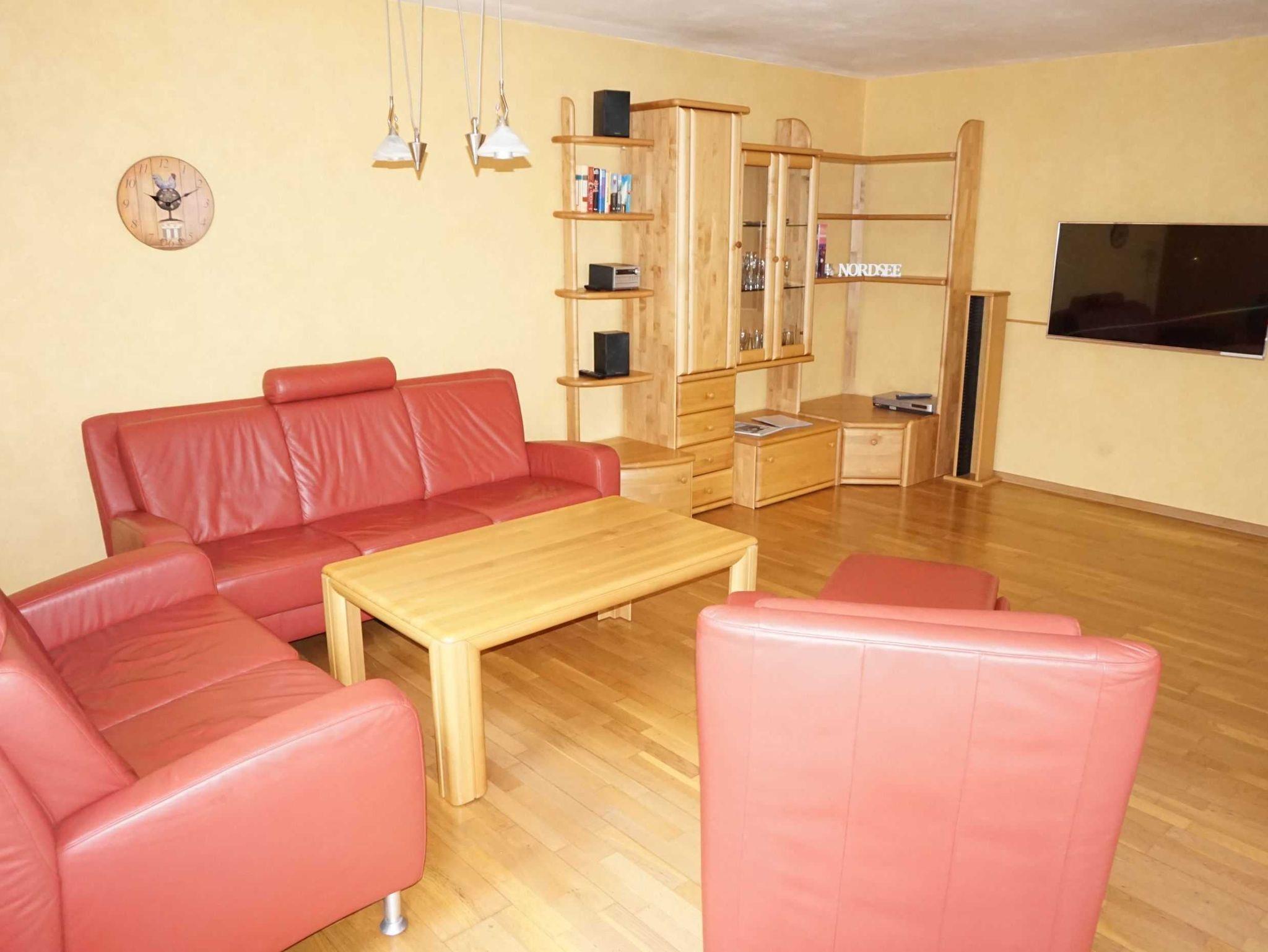 Komfort Ferienwohnung im Ergeschoss für 6 Personen und 1 Kleinkind. Großzügige und komplett ausgestattete Küche mit Essplatz. 2 Schlafzimmer mit Doppelbett (davon 1 Schlafzimmer mit TV und erhöhten Betten), 1 Schlafzimmer mit Etagenbett. Wohnzimmer mit massiven Möbeln, Ledercouchgarnitur und großem Sat-TV. Badezimmer mit Badewanne und Dusche/WC. Separates Gäste-WC. Die Garage wird als Abstellraum für Waschmaschine und Trockner (gegen Gebühr) sowie kann als Unterstellmöglichkeit für Fahrräder genutzt werden. Hier finden Sie auch eine gemeinschaftliche Gefrierbox vor.