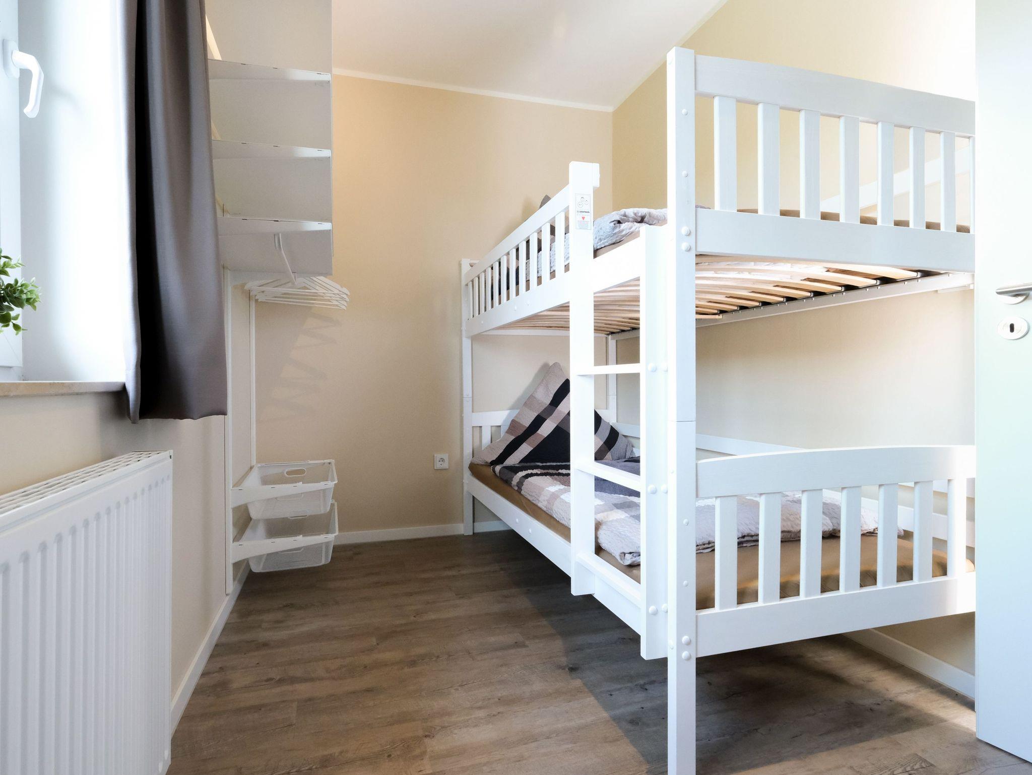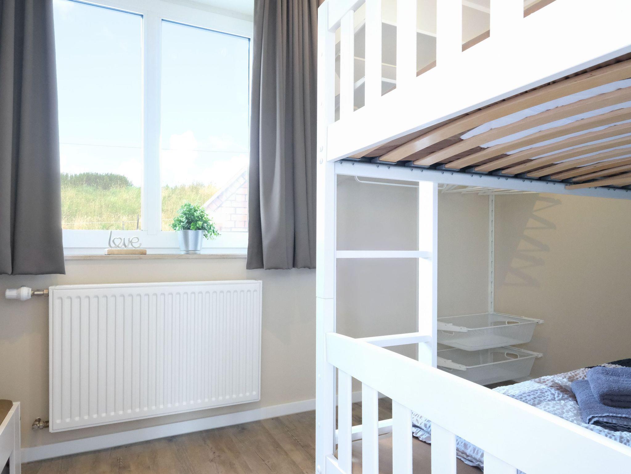 Das Elternschlafzimmer ist großzügig geschnitten und bietet Ihnen einen traumhaften Blick auf den Deich. Es ist mit einem Doppelbett (180x200) mit offenem Fußende ausgestattet. Im zweiten Schlafzimmer steht Ihnen ein Einzelbett und ein Etagenbett (je 90x200) zur Verfügung. Damit ist das Schlafzimmer für 2 Erwachsene oder 3 Kinder optimal ausgelegt. Beide Schlafzimmer verfügen über einen Wandschrank und Verdunklungsmöglichkeiten.
