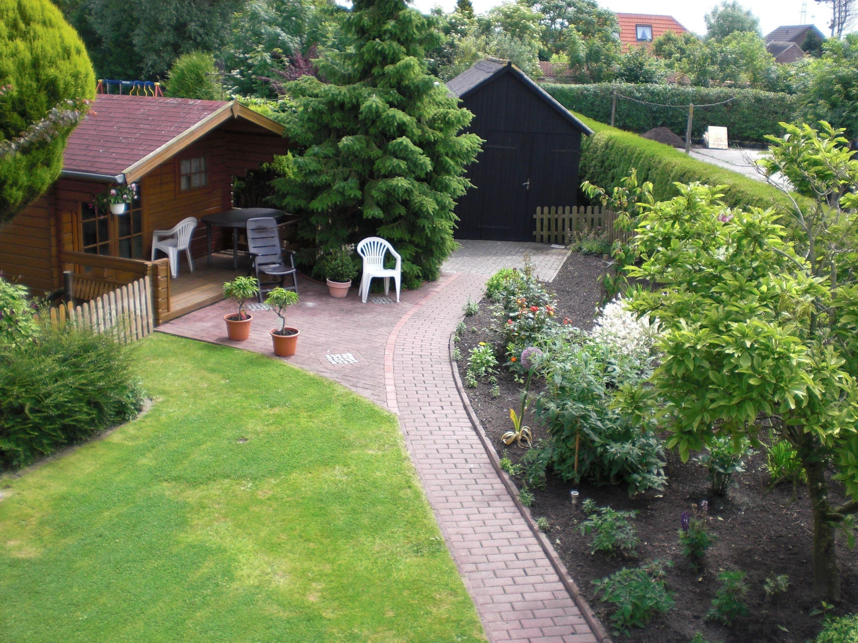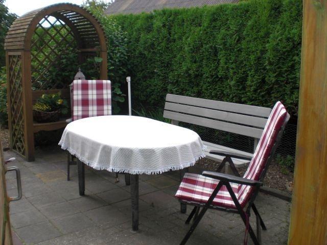 Im Garten befindet sich eine kleine Terrasse mit Sitzmöbeln.