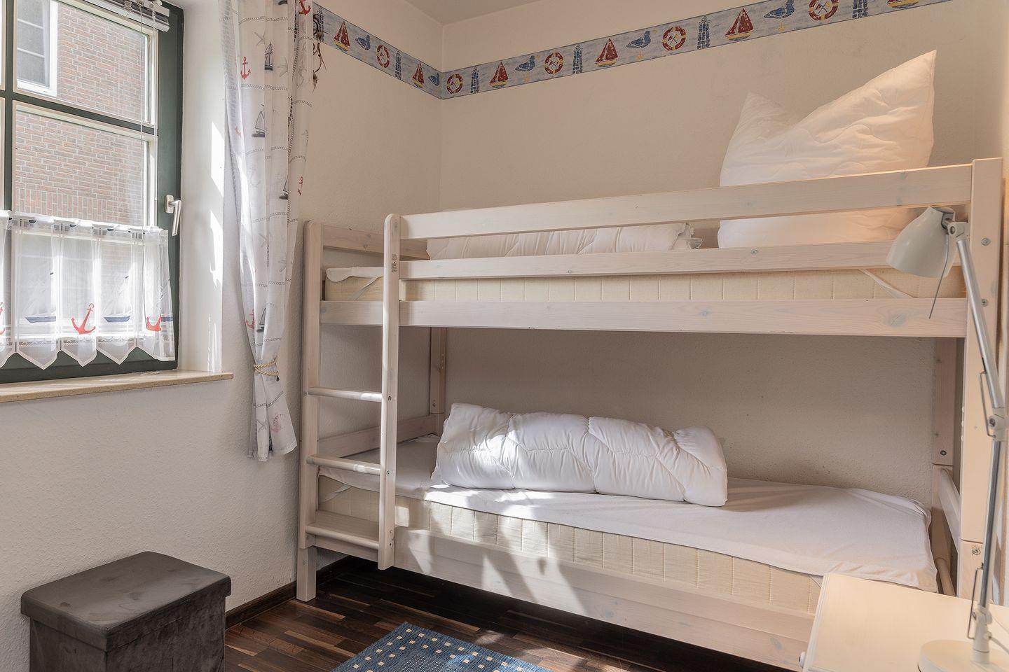 1 Schlafzimmer mit Doppelbett in Komforthöhe und feststehendem Kinderbett(in einer Nische)