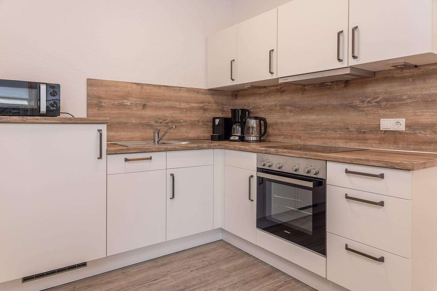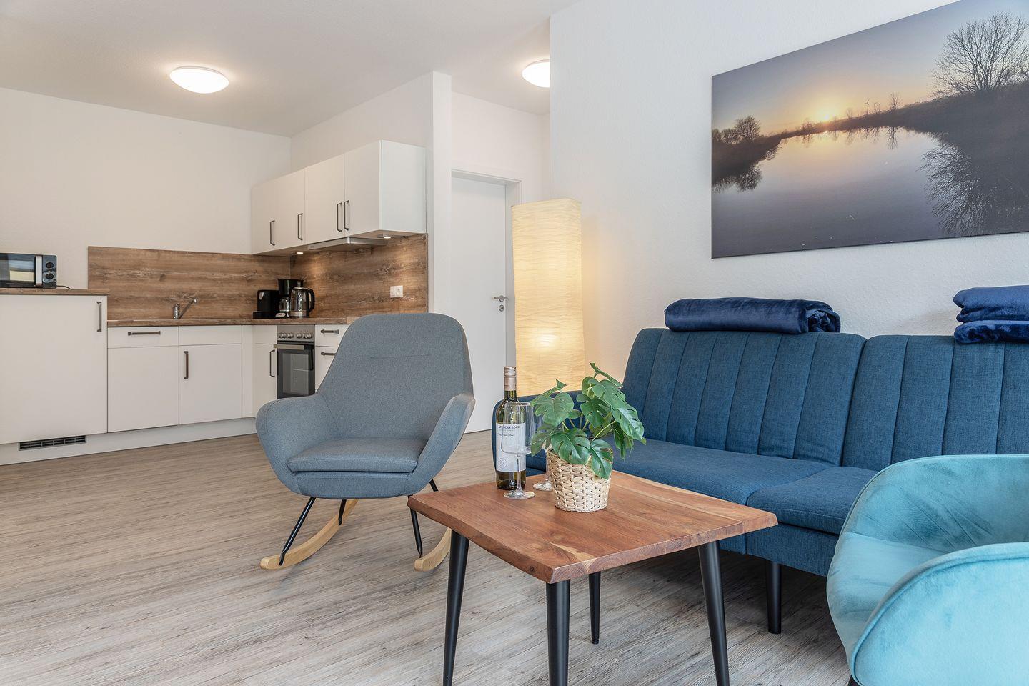 Offener Wohn-Küchenbereich mit angrenzender gut ausgestatteter Küchenbereich und TV-Sofaecke