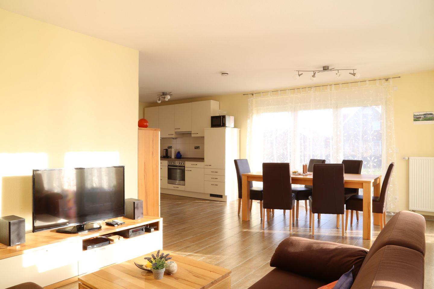 Das Ferienhaus Annette ist ein Nichtraucherhaus und bietet Ihnen eine gemütliche Atmosphäre, die durch geschmackvolle Einrichtung und durchdachte Details geprägt ist. Im Wohnzimmer finden Sie eine komfortable Sofaecke sowie einen Essbereich mit Esstisch, ideal für gesellige Abende. Der 44 bis 55 Zoll große Fernseher mit Satellitenanschluss sorgt für Unterhaltung, wenn Sie nach einem aktiven Tag entspannen möchten.