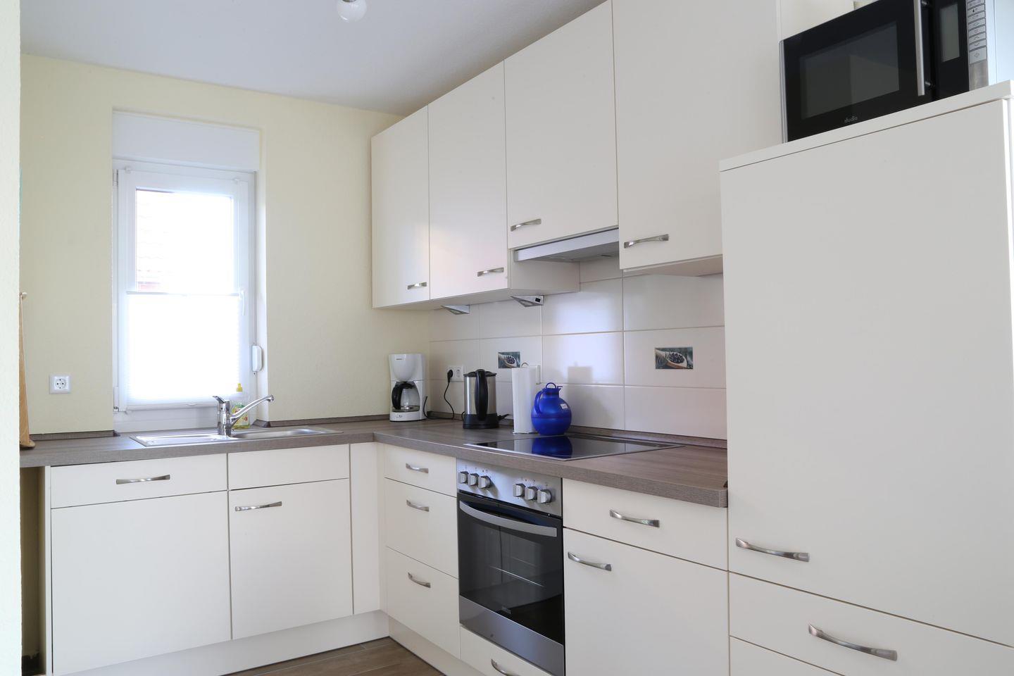 Die gut ausgestattete Küche ist zeitgemäß und erfüllt alle Ansprüche an modernes Kochen. Sie verfügt über einen Cerankochfeldherd, einen Elektro-Backofen, eine Spülmaschine sowie alle notwendigen Küchenutensilien, damit Sie Ihre Lieblingsgerichte zubereiten können. Auch eine Mikrowelle, ein Kühlschrank mit Gefrierfach, ein Wasserkocher, ein Toaster und eine Kaffeemaschine sind vorhanden, damit es Ihnen an nichts fehlt.