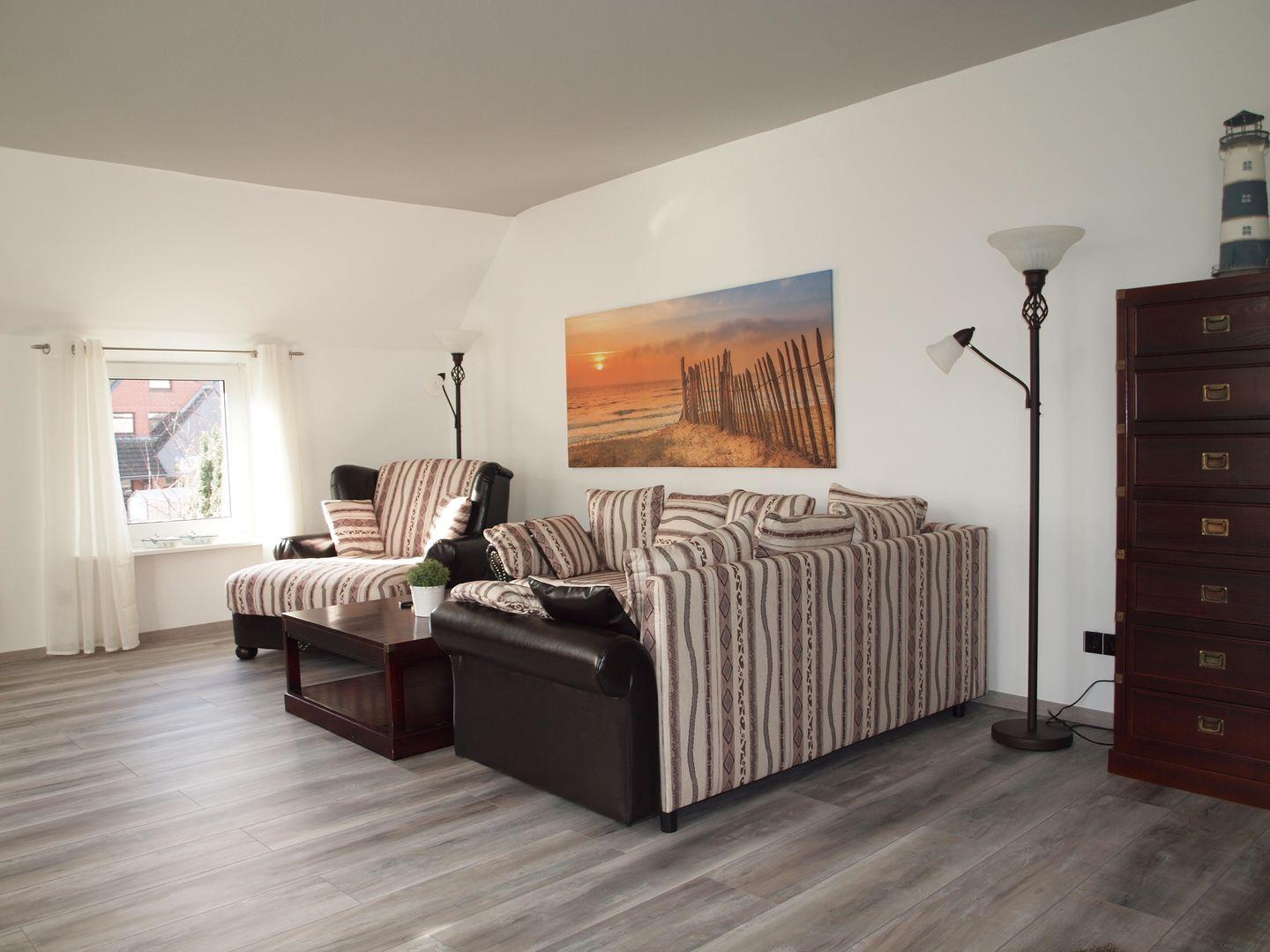Das Wohnzimmer der Ferienwohnung Utkiek ist ein einladender Rückzugsort, ausgestattet mit einer bequemen Sofaecke, einem modernen Fernseher (44 - 55 Zoll) und weiteren Annehmlichkeiten wie WLAN, einem Radio und einem CD-Spieler. Hier können Sie nach einem erlebnisreichen Tag entspannen oder einen Filmabend genießen. Die Wohnung ist zudem mit einer Zentralheizung ausgestattet, sodass Sie auch in den kühleren Monaten einen angenehmen Aufenthalt erleben werden.