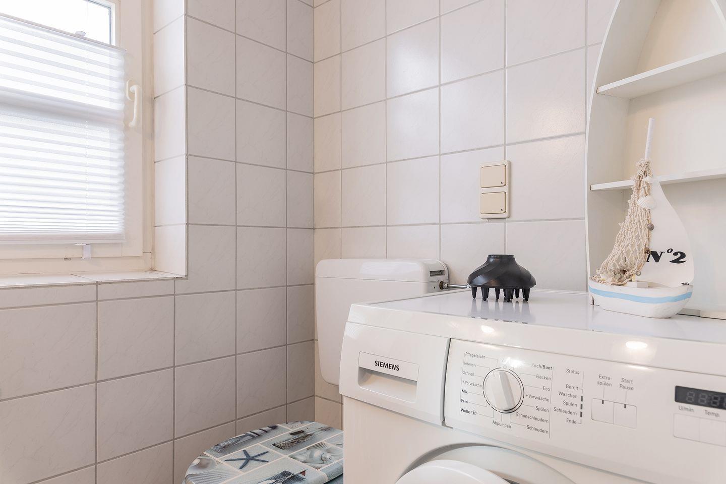 Wohnzimmer mit Sofa, Fernseher, DVD-Player, Radio und Essecke inkl. Hochstuhl, Ausgang zum Garten mit möblierter Terrasse und einem Grill, vollständig ausgestattete Küche mit Backofen, Kühlschrank, Mikrowelle, Spülmaschine, Kaffeemaschine und Wasserkocher, Gäste-WC, Abstellraum mit Bügelbrett und Bügeleisen, Staubsauger, Bollerwagen.