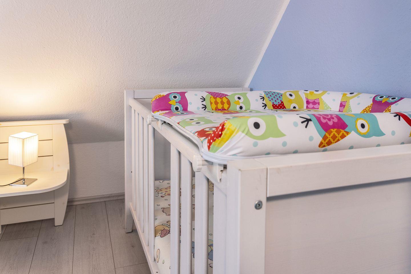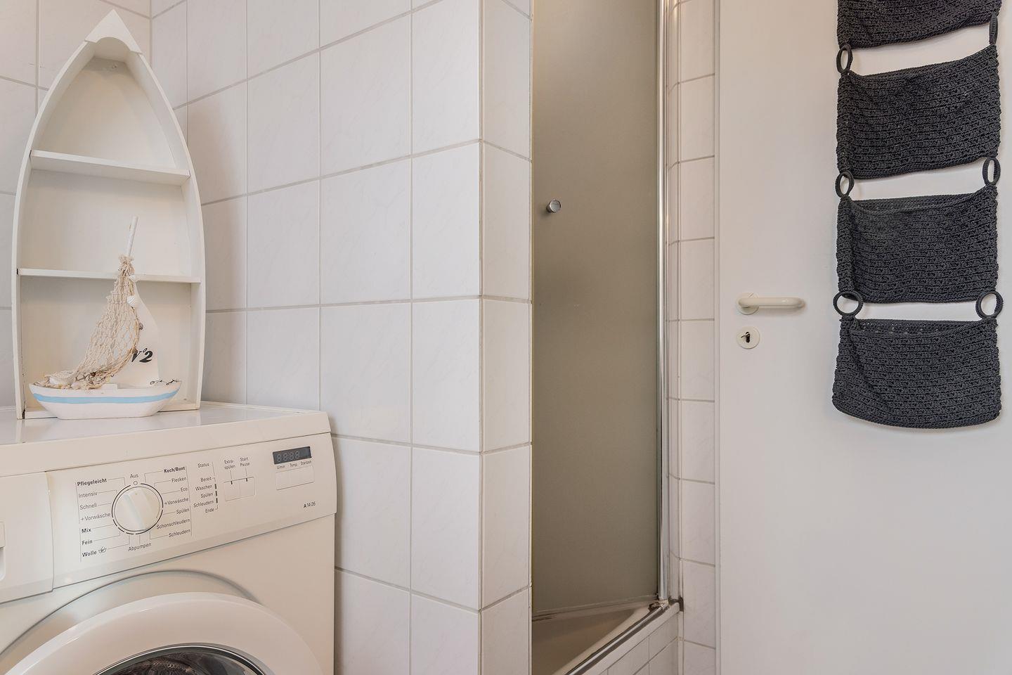 Großes Schlafzimmer mit Doppelbett und Kinderbett (70×140cm), Nachtschränken und Kleiderschrank, kleines Schlafzimmer mit zwei Einzelbetten und Kleiderschrank, Badezimmer mit Dusche, Waschbecken und Waschmaschine.