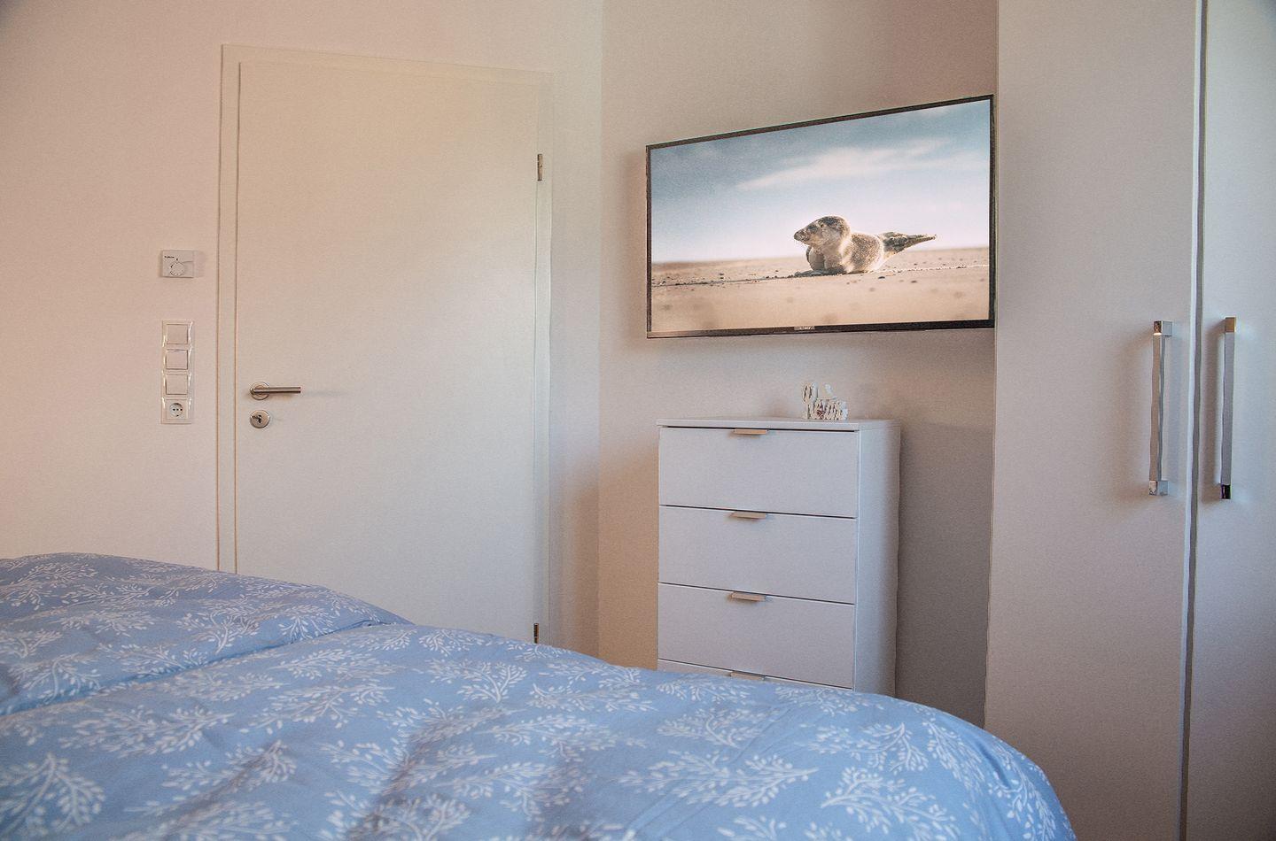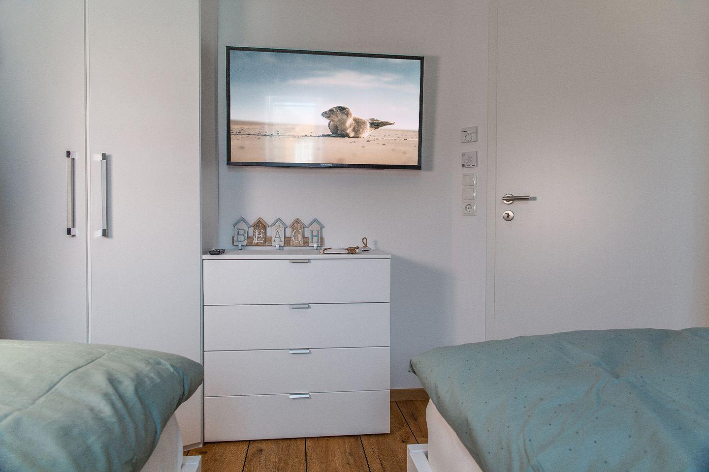 Schlafzimmer (1x Doppelbett, 1x2 Einzelbetten) inkl. TV und ein großzügiges Bad mit bodengleicher Dusche. Alle Fenster sind