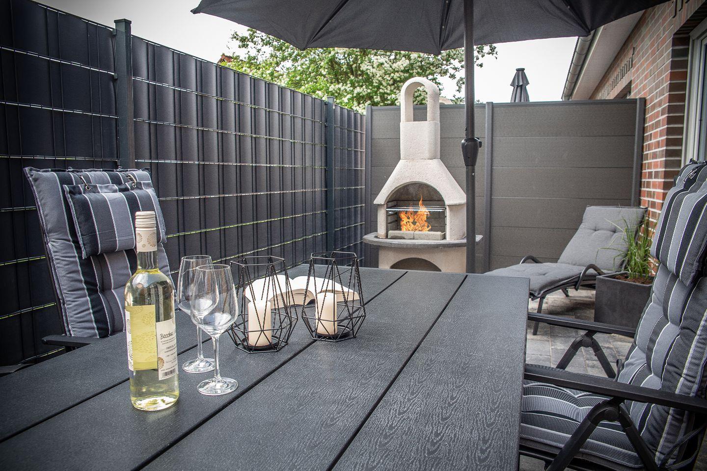 Der Außenbereich des Ferienhauses verfügt über eine möblierte Terrasse in Südausrichtung und lädt zur Erholung ein. Es