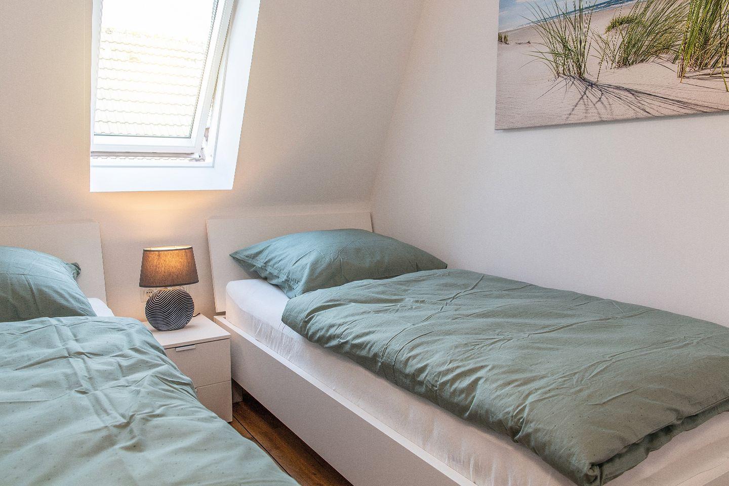 Schlafzimmer (1x Doppelbett, 1x2 Einzelbetten) inkl. TV und ein großzügiges Bad mit bodengleicher Dusche. Alle Fenster sind